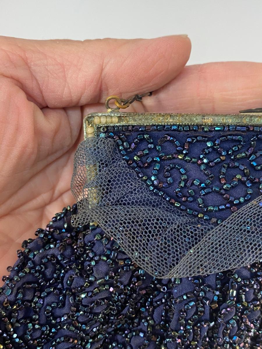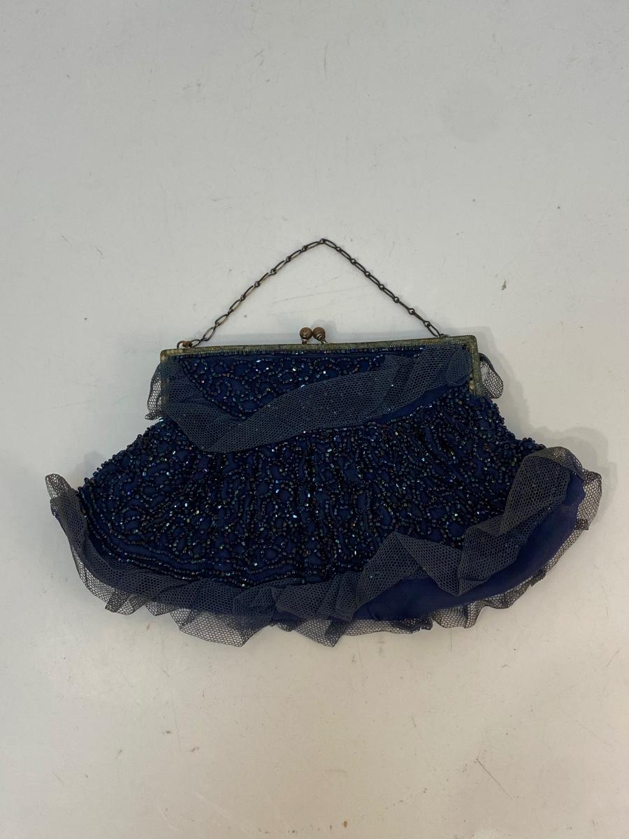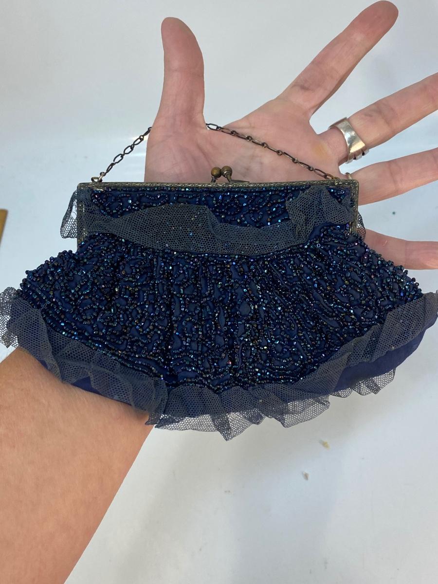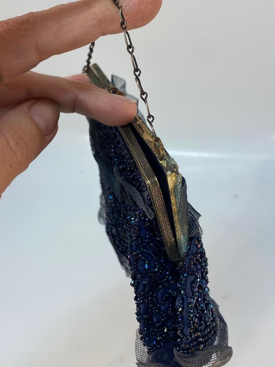 Vintage Antique Small Navy Blue Beaded & Ruffled Evening Bag Clutch Handbag. Good vintage condition. It is missing some bead work in the metal frame but in overall good vintage condition.