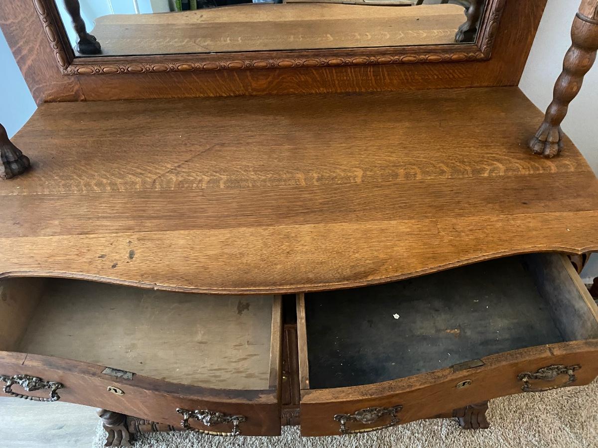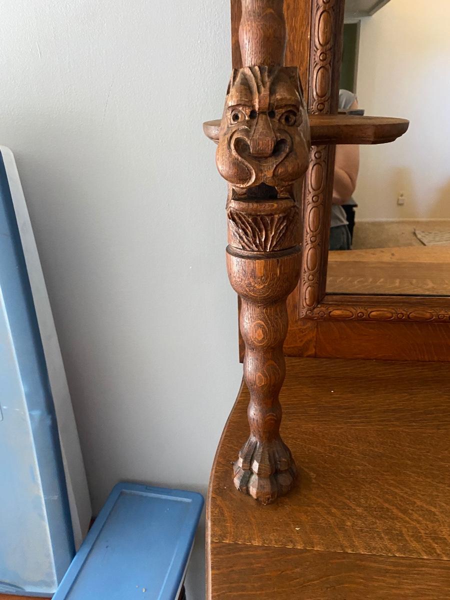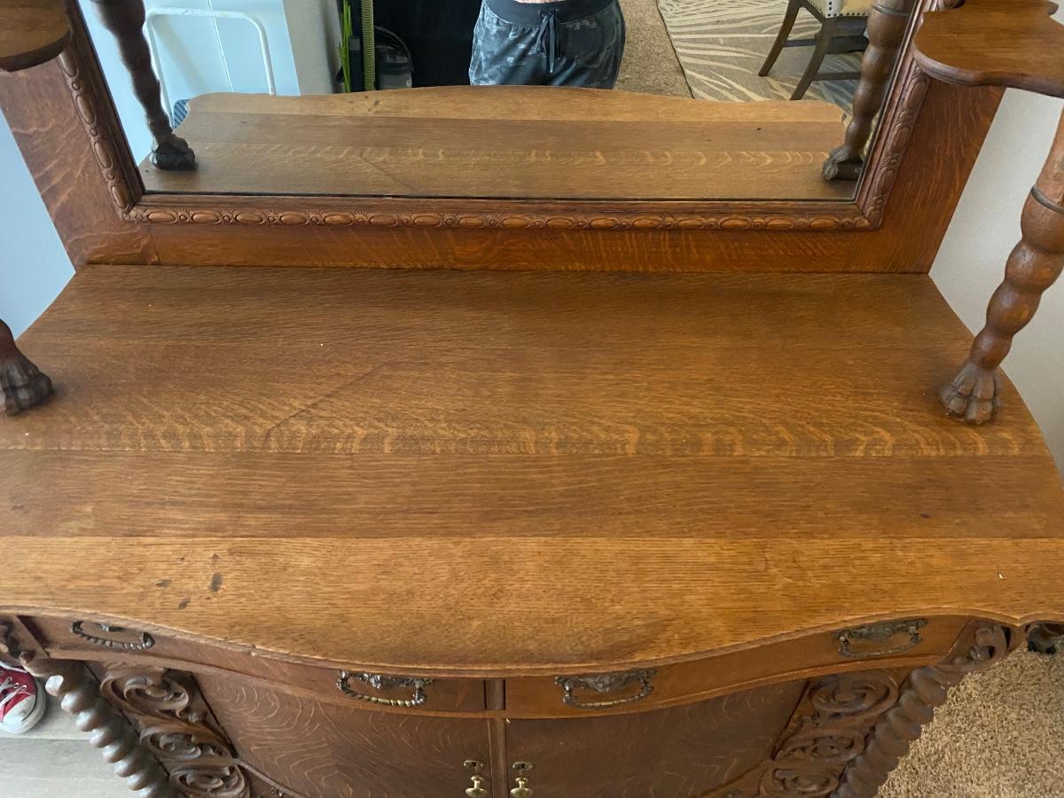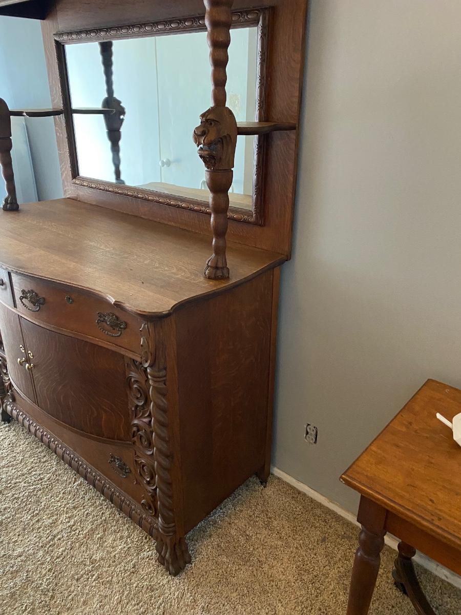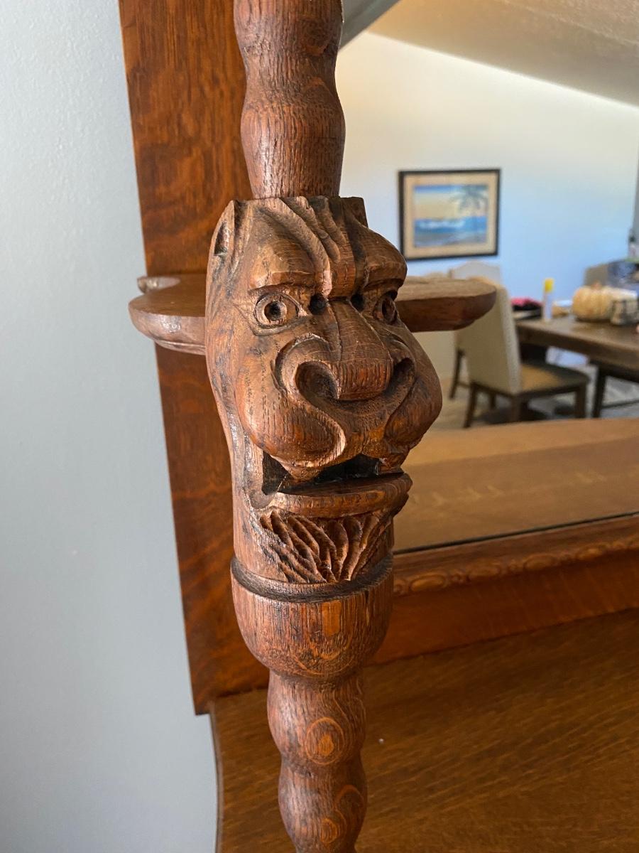 Antique Victorian Gothic Carved Scrolled Wood Mirrored Buffet Sideboard Dresser with Figural Accents. Two-piece buffet, mirrored top half comes off, held in place with screws on back. Quarter sewn oak with turned & carved details. Carved lion/beast heads on the front pillars. Two small drawers, middle cabinet, and large bottom drawer. Figural drawer handles. There is some wear inside drawers, a few small dings along edges, and small stain spots on lower surface. Upper shelf has large discolor spot, unnoticeable unless you stand on step ladder to see it. Total height about 74", cabinet without mirror about 37", 49.5" wide and 22.5" deep. Mirror is in good vintage condition, no haze little to no speckling as seen with old mirrors. PICK UP IN GARDEN GROVE.