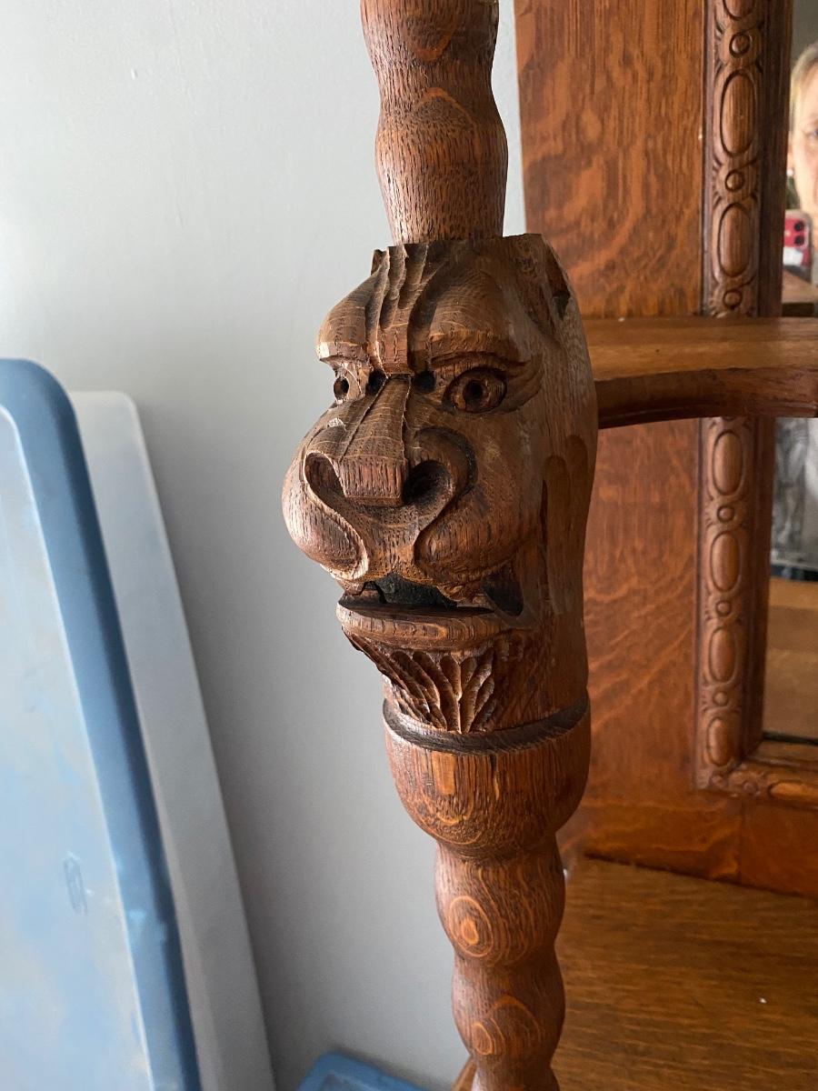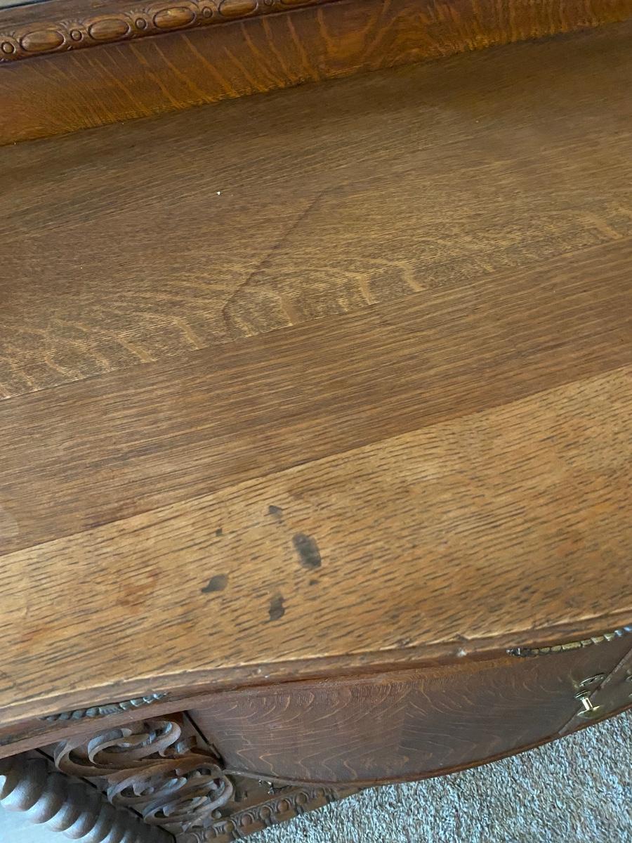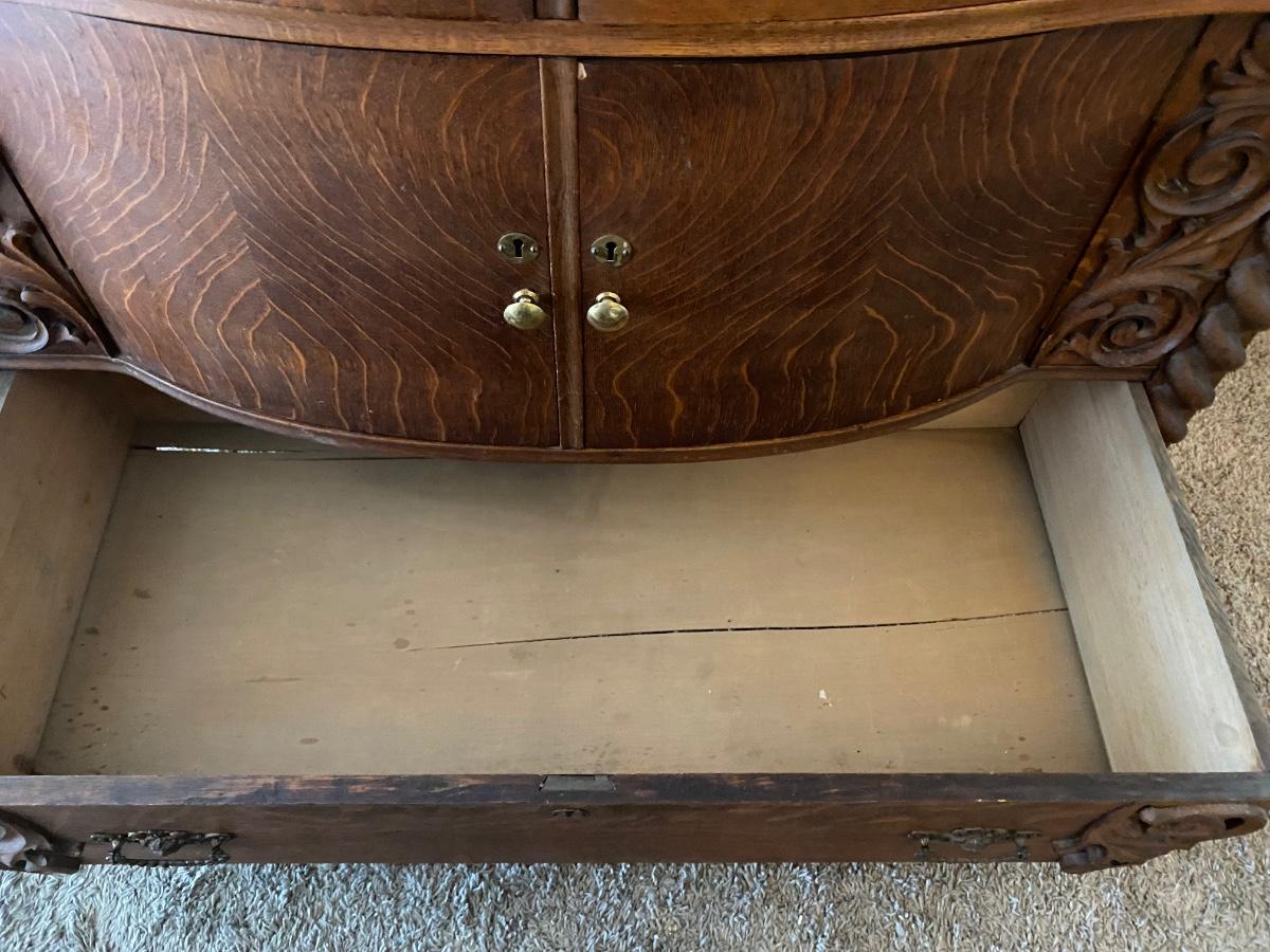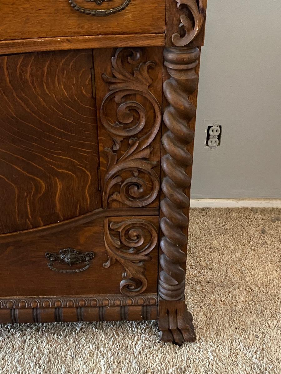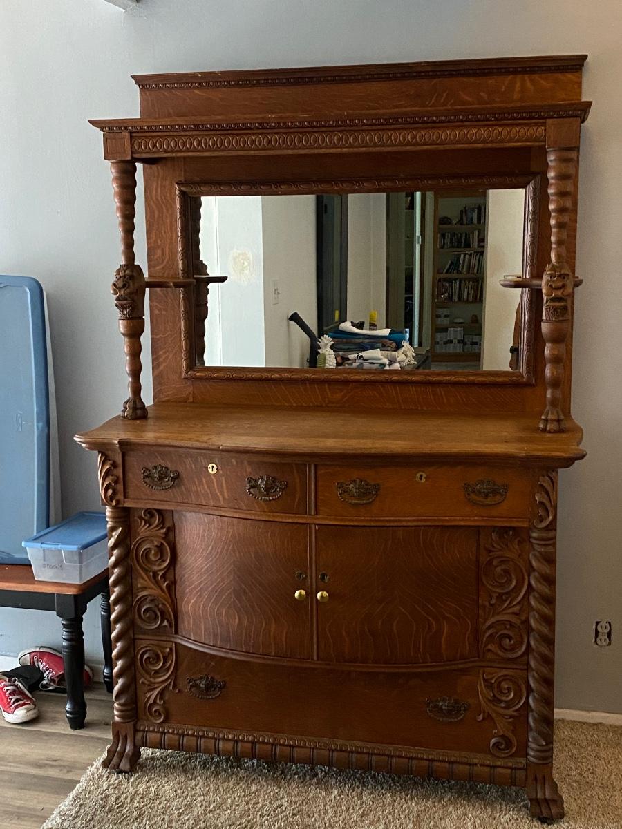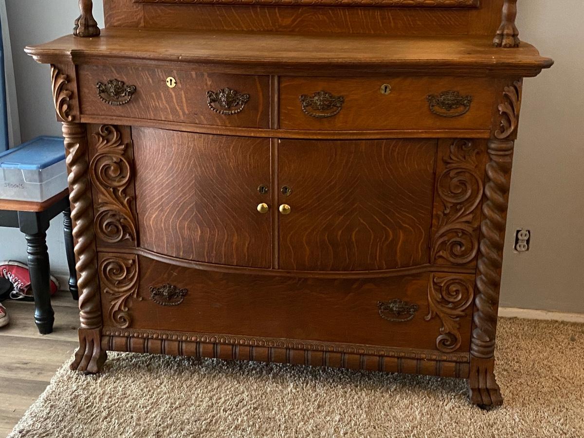Antique Victorian Gothic Carved Scrolled Wood Mirrored Buffet Sideboard Dresser with Figural Accents. Two-piece buffet, mirrored top half comes off, held in place with screws on back. Quarter sewn oak with turned & carved details. Carved lion/beast heads on the front pillars. Two small drawers, middle cabinet, and large bottom drawer. Figural drawer handles. There is some wear inside drawers, a few small dings along edges, and small stain spots on lower surface. Upper shelf has large discolor spot, unnoticeable unless you stand on step ladder to see it. Total height about 74", cabinet without mirror about 37", 49.5" wide and 22.5" deep. Mirror is in good vintage condition, no haze little to no speckling as seen with old mirrors. PICK UP IN GARDEN GROVE.