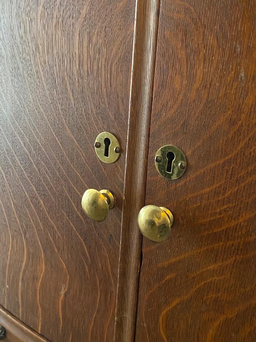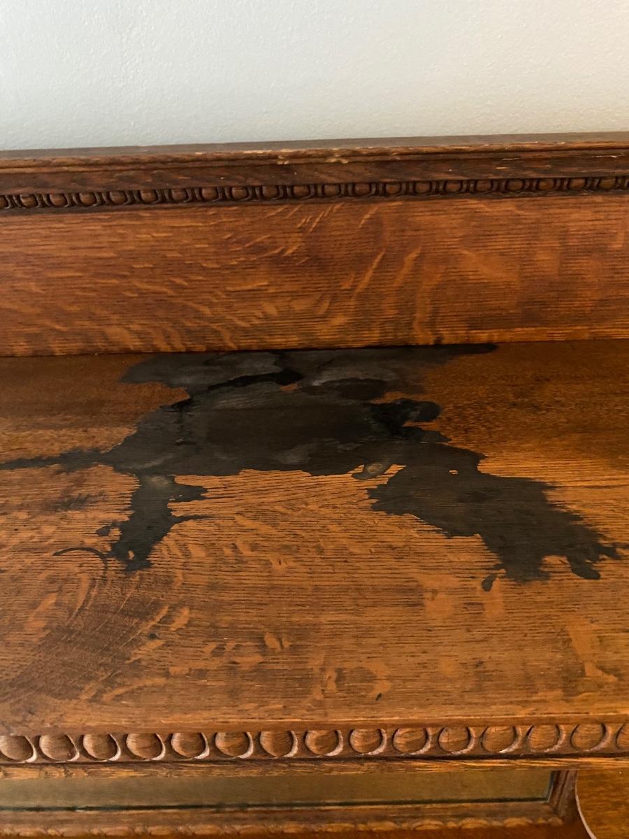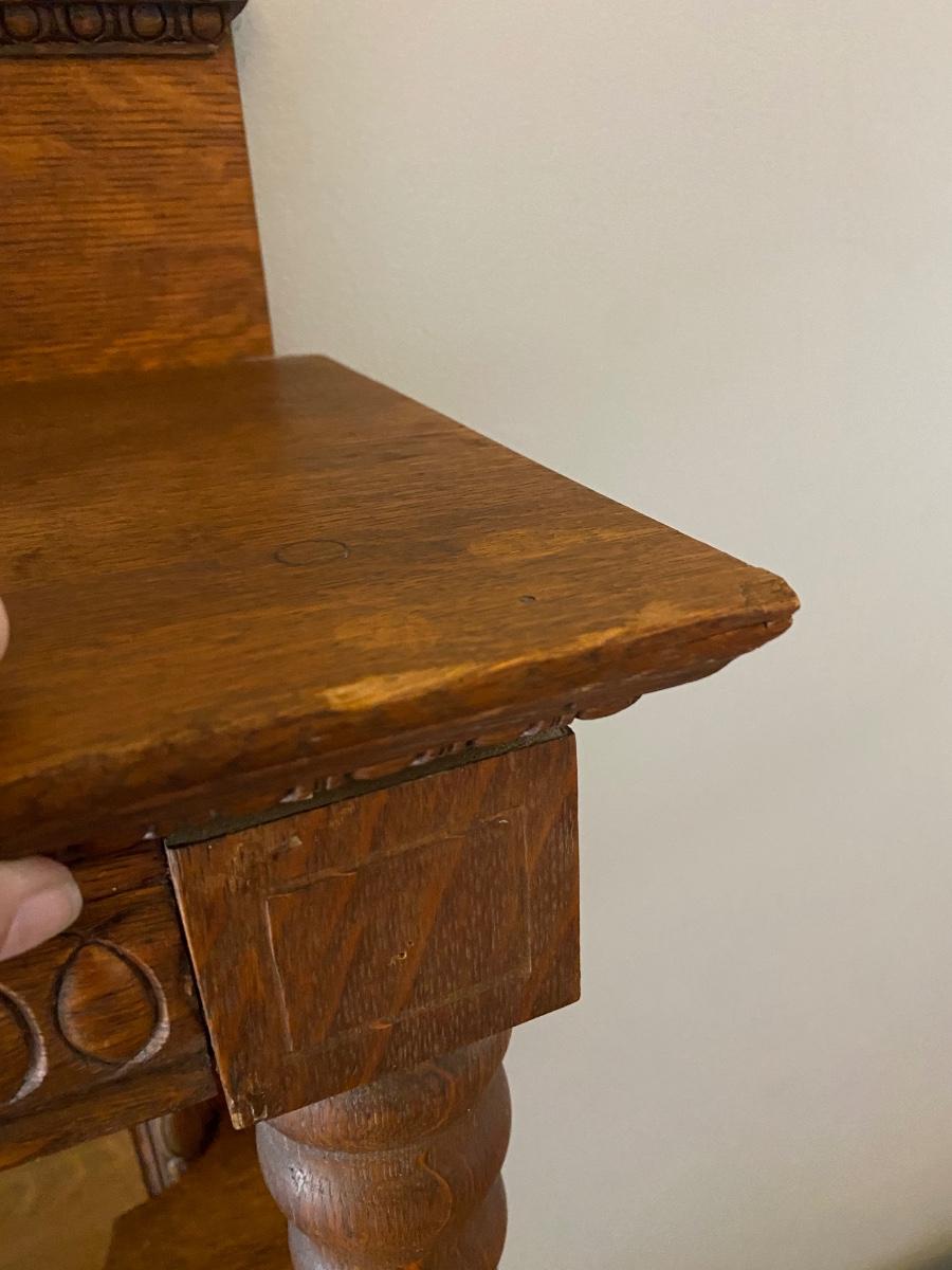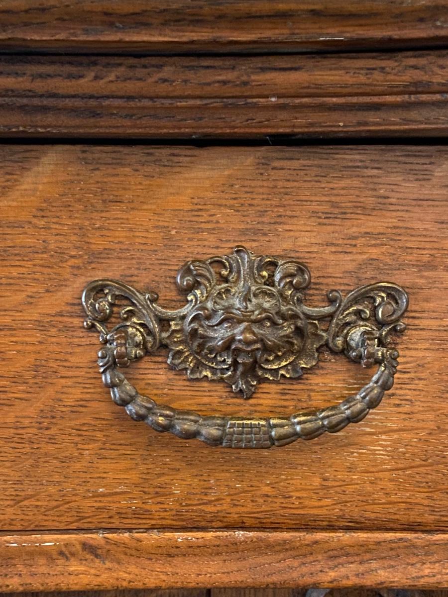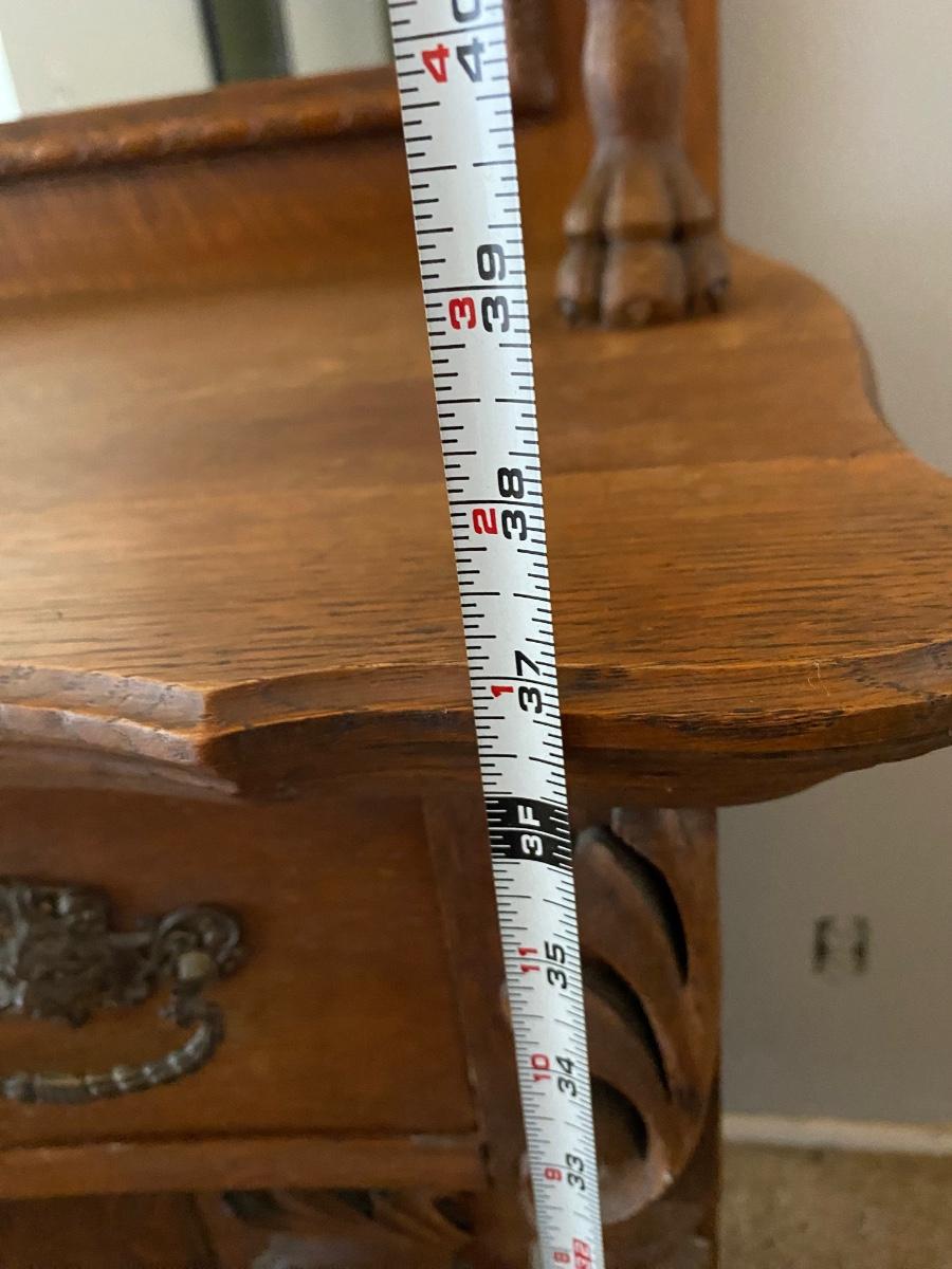 Antique Victorian Gothic Carved Scrolled Wood Mirrored Buffet Sideboard Dresser with Figural Accents. Two-piece buffet, mirrored top half comes off, held in place with screws on back. Quarter sewn oak with turned & carved details. Carved lion/beast heads on the front pillars. Two small drawers, middle cabinet, and large bottom drawer. Figural drawer handles. There is some wear inside drawers, a few small dings along edges, and small stain spots on lower surface. Upper shelf has large discolor spot, unnoticeable unless you stand on step ladder to see it. Total height about 74", cabinet without mirror about 37", 49.5" wide and 22.5" deep. Mirror is in good vintage condition, no haze little to no speckling as seen with old mirrors. PICK UP IN GARDEN GROVE.