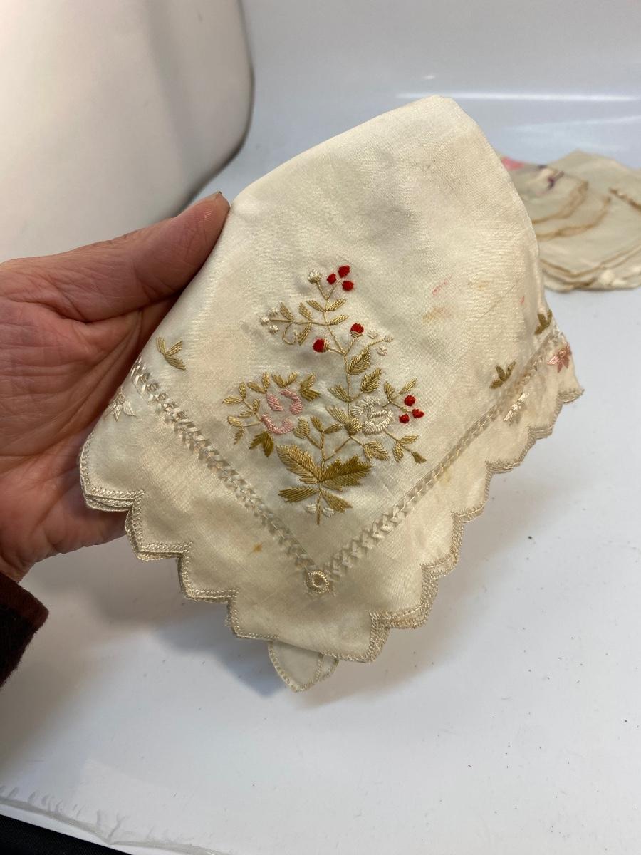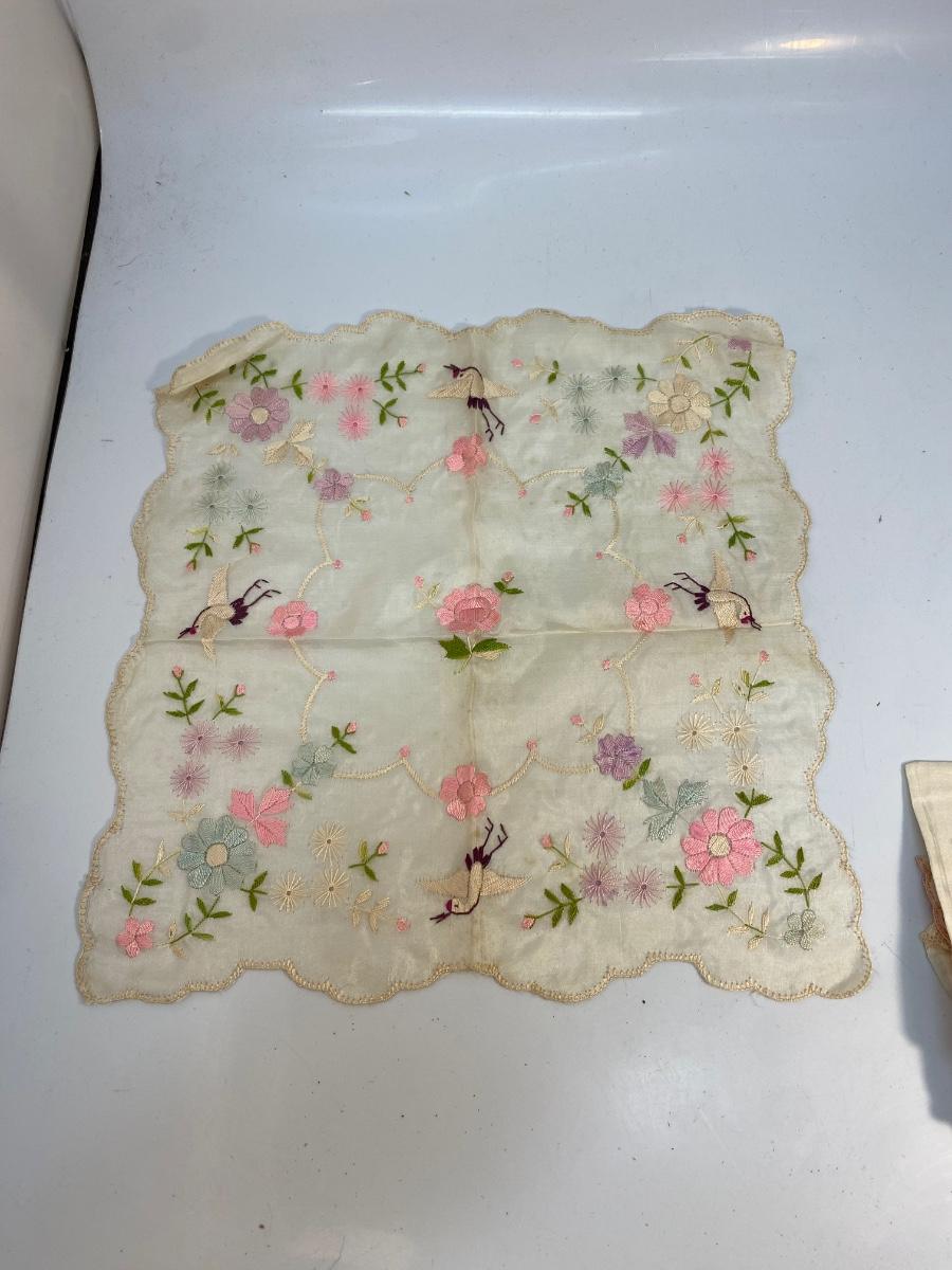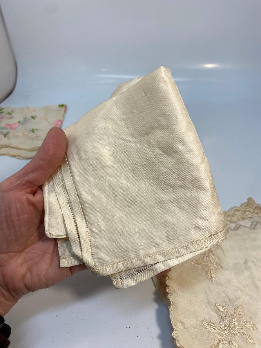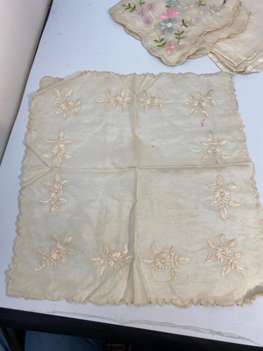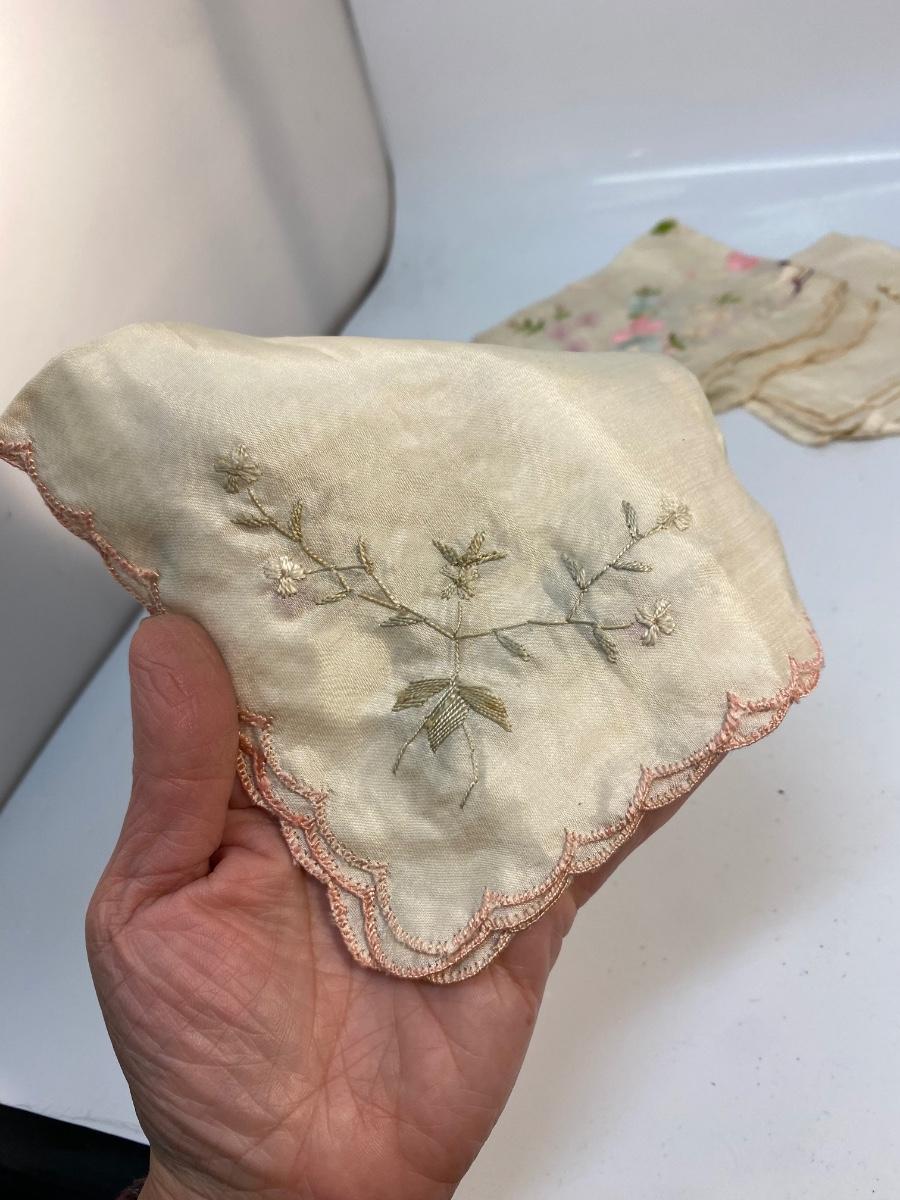 Lot of 6 Vintage Antique Embroidered Hanky Pocket Square Handkerchiefs. Each one different, there is one that is plain, and one what is white on white, the rest have color embroidery. Some light spots and discolor from age.