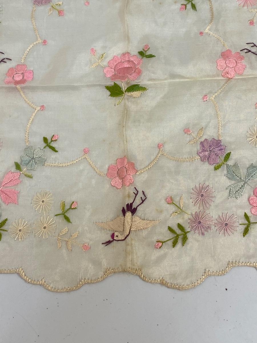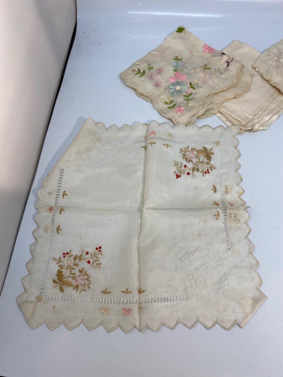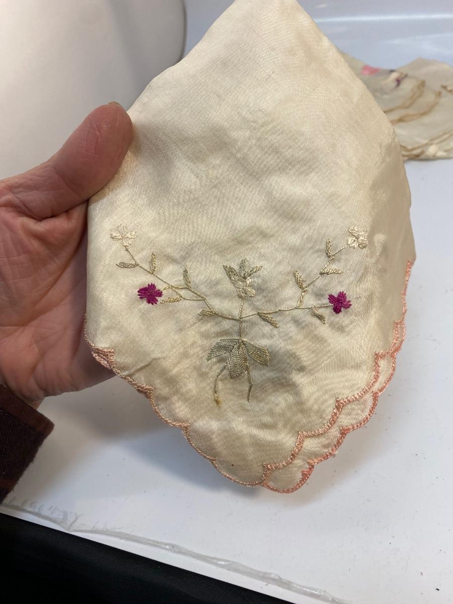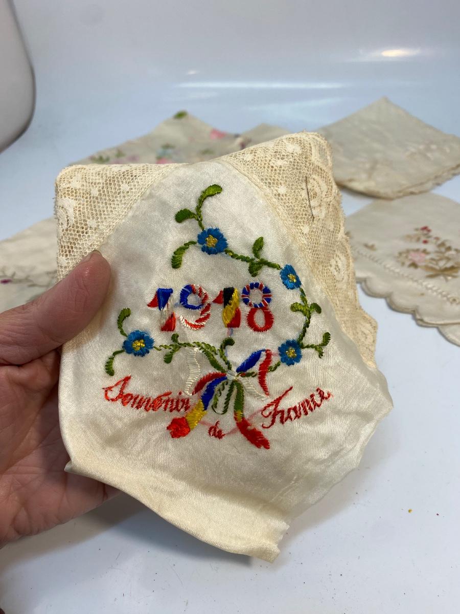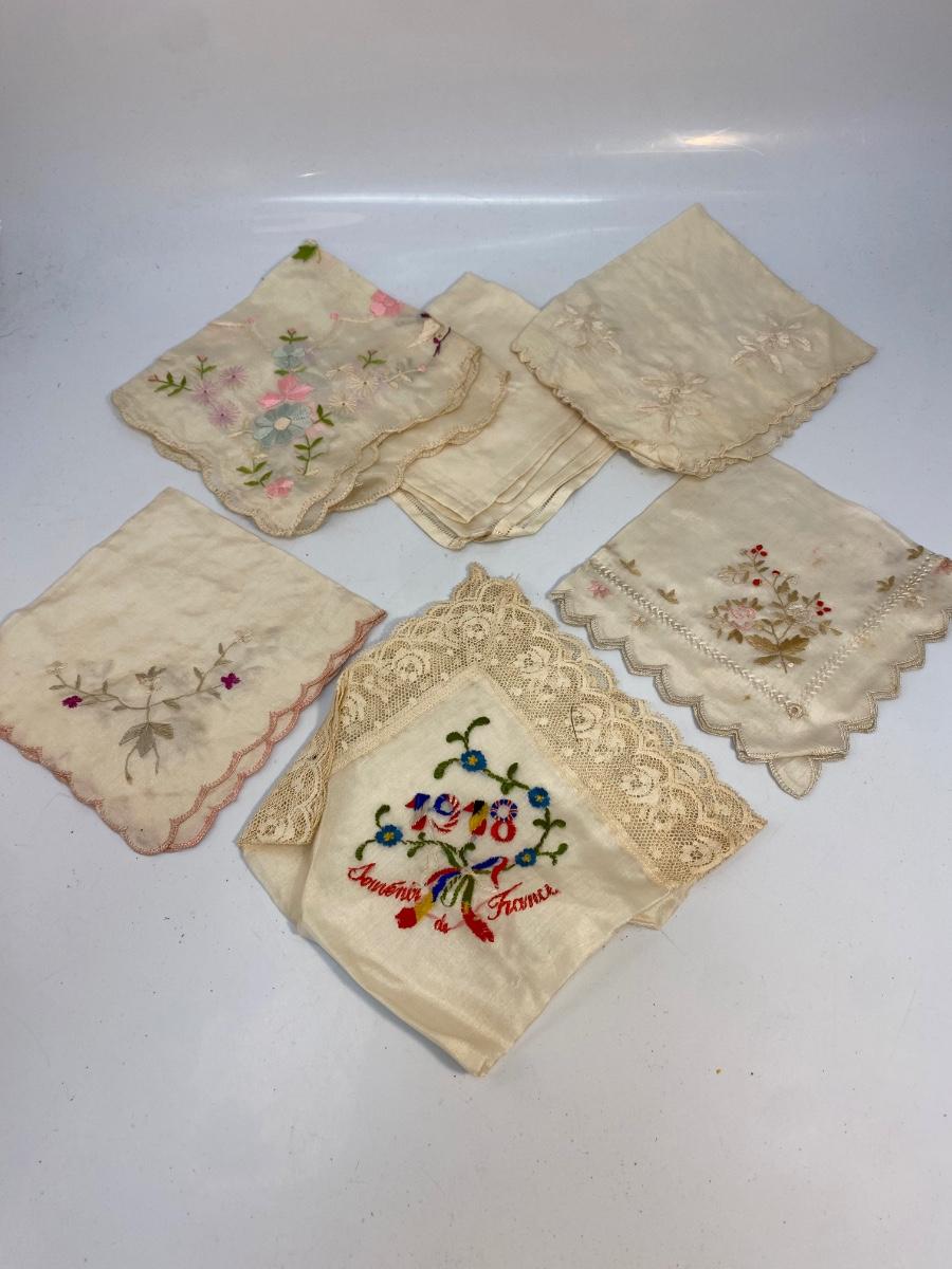 Lot of 6 Vintage Antique Embroidered Hanky Pocket Square Handkerchiefs. Each one different, there is one that is plain, and one what is white on white, the rest have color embroidery. Some light spots and discolor from age.