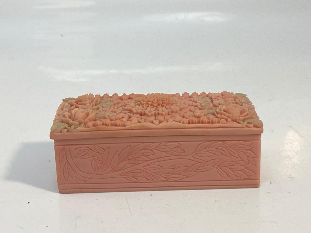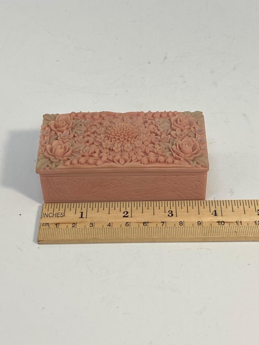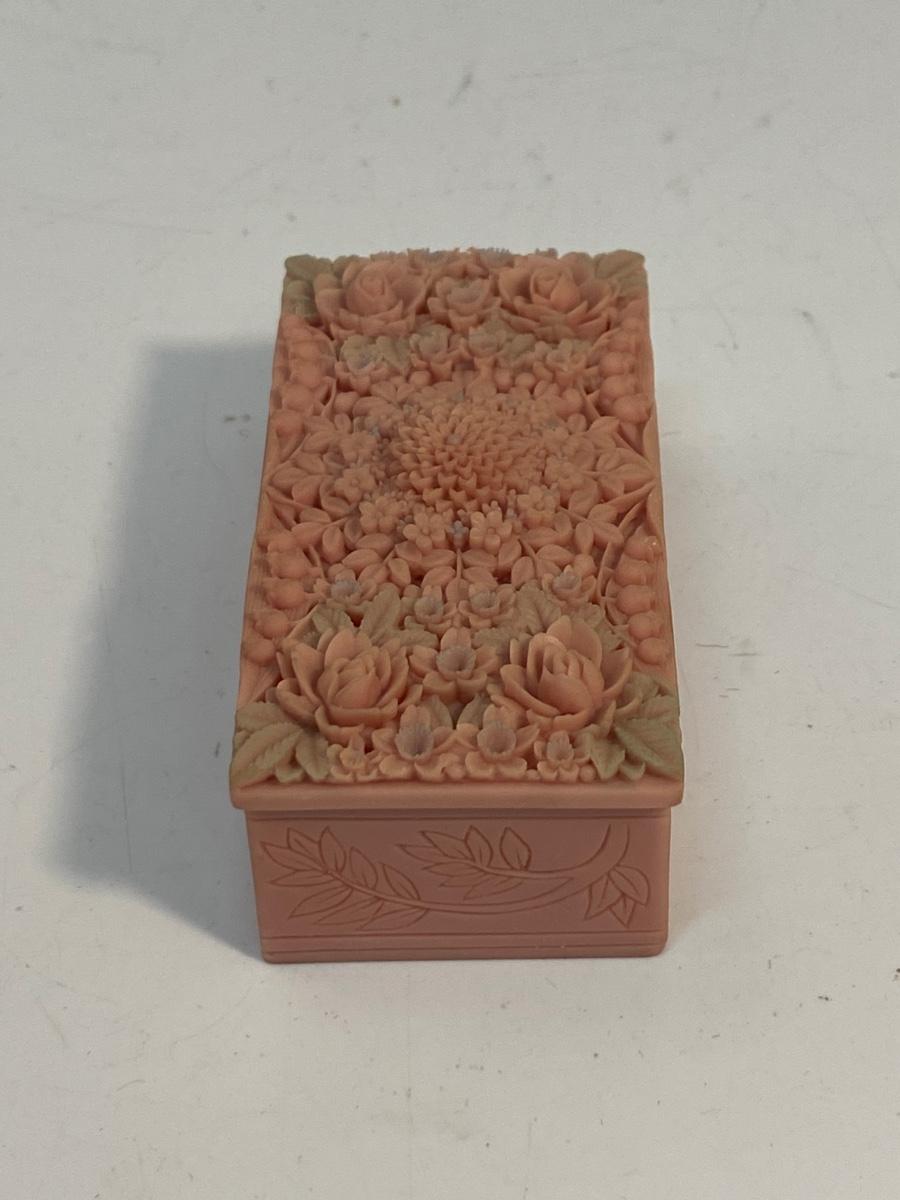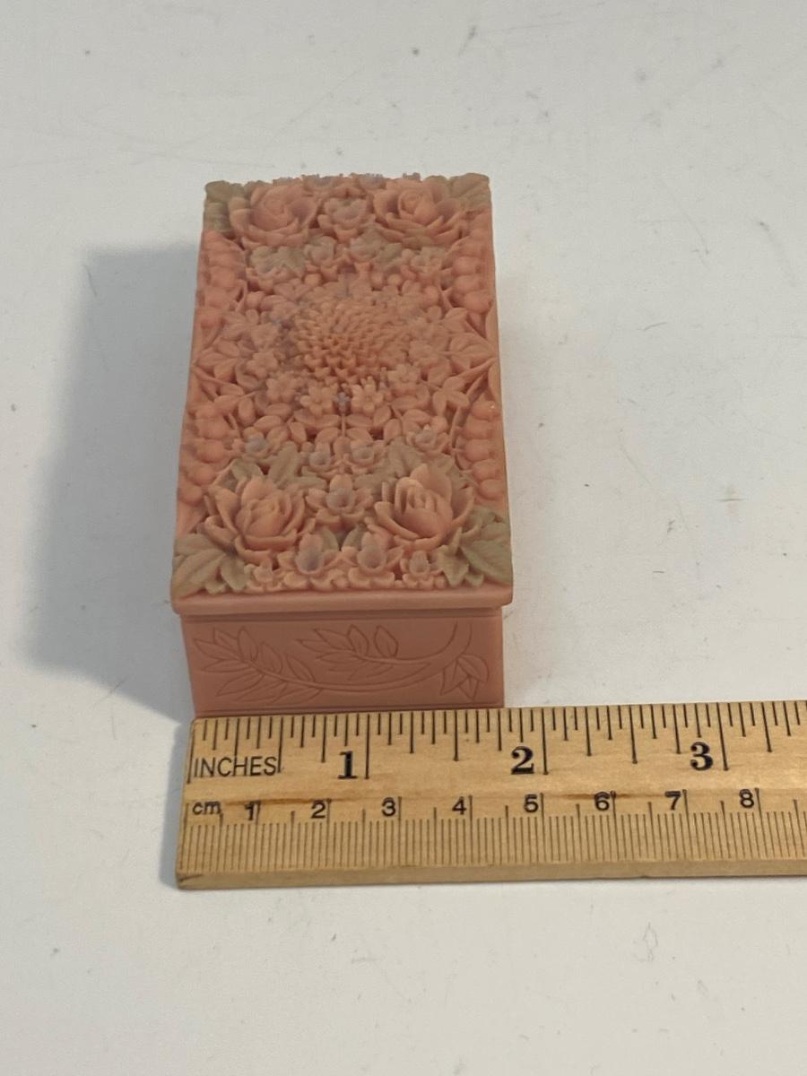 Small Pink Vintage Floral Carved Soapstone Trinket Box. Ornate delicate floral carved top. Looks like the leaves have been tinted a pale green. In good vintage condition. Under 4" size.