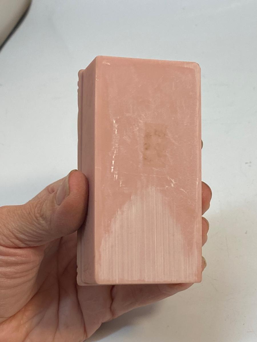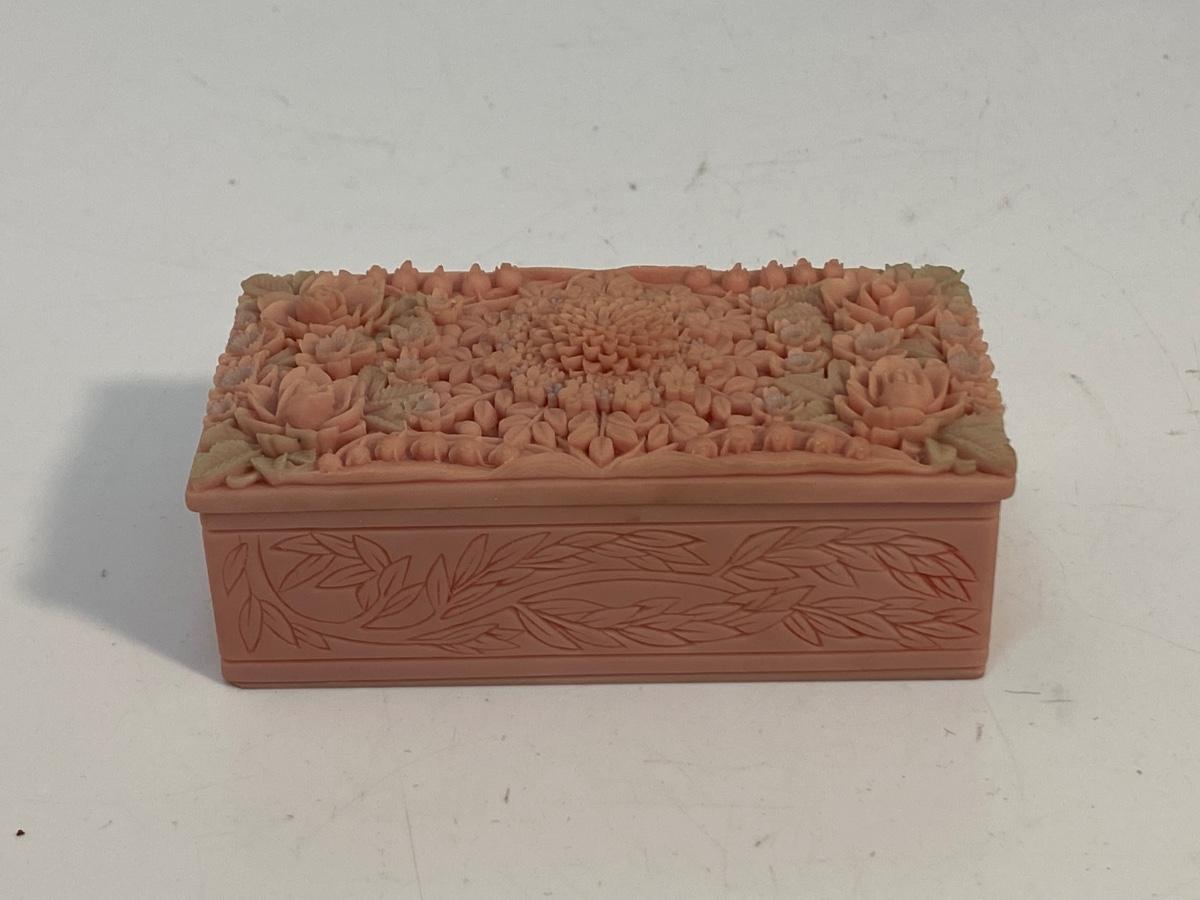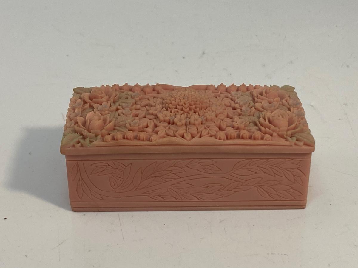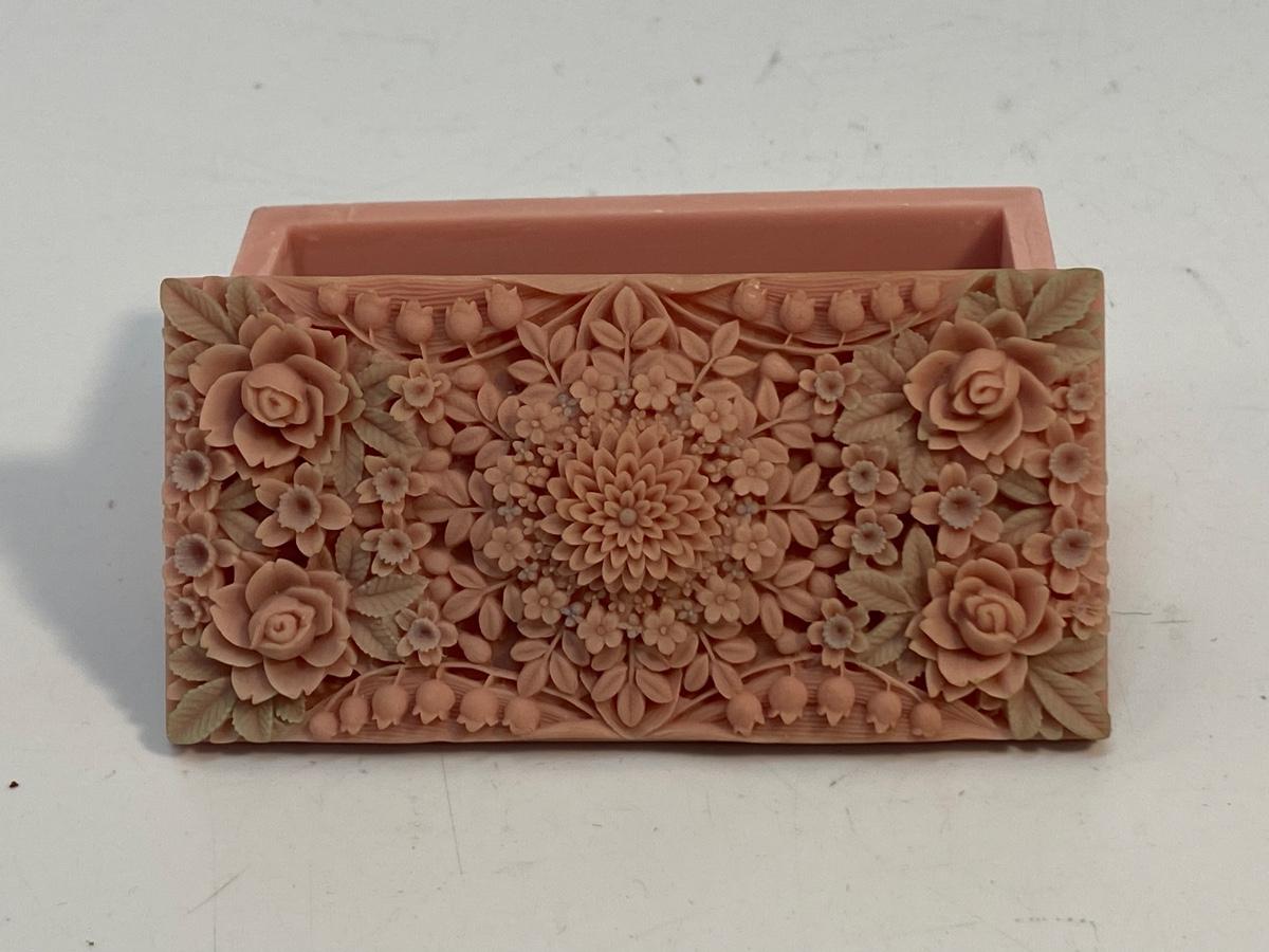 Small Pink Vintage Floral Carved Soapstone Trinket Box. Ornate delicate floral carved top. Looks like the leaves have been tinted a pale green. In good vintage condition. Under 4" size.