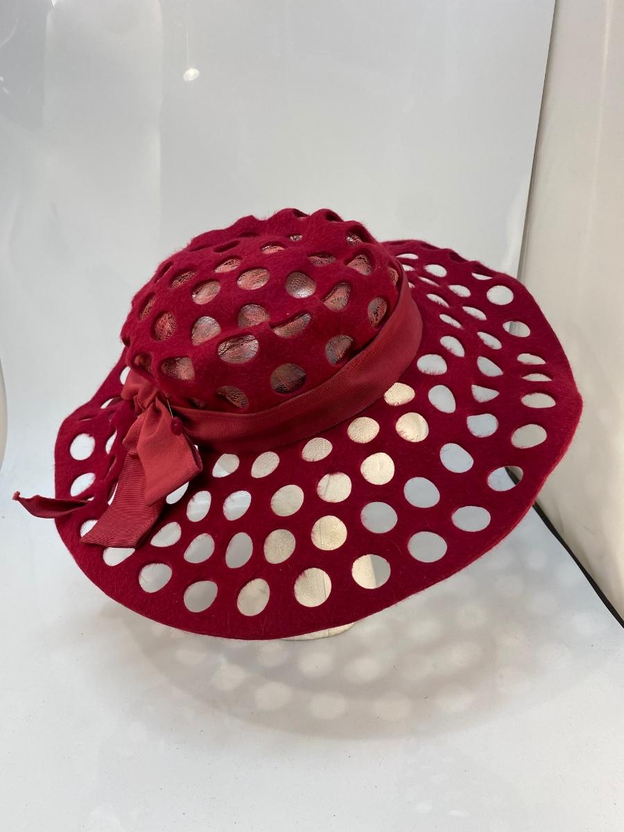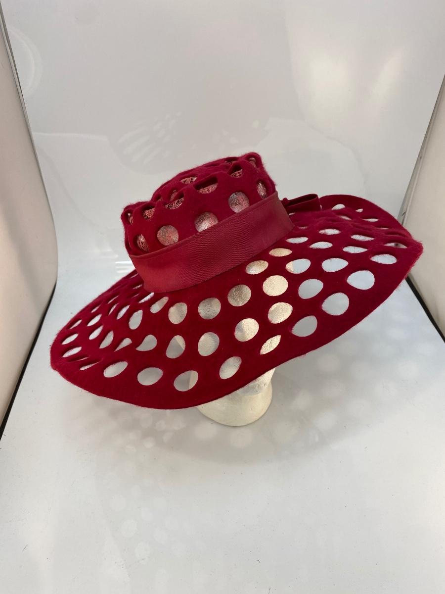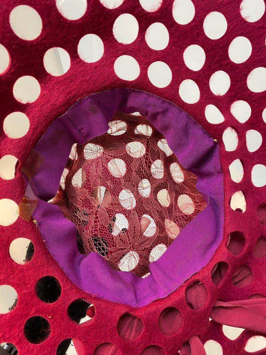 Vintage Fuchsia Burgandy Polka Dot Wide Brim Advant Garde Hat. Felt hat with polka dot holes. Good condition.