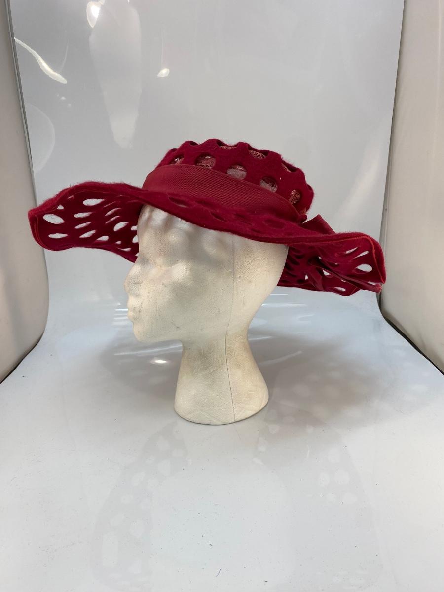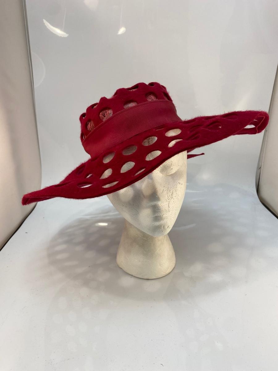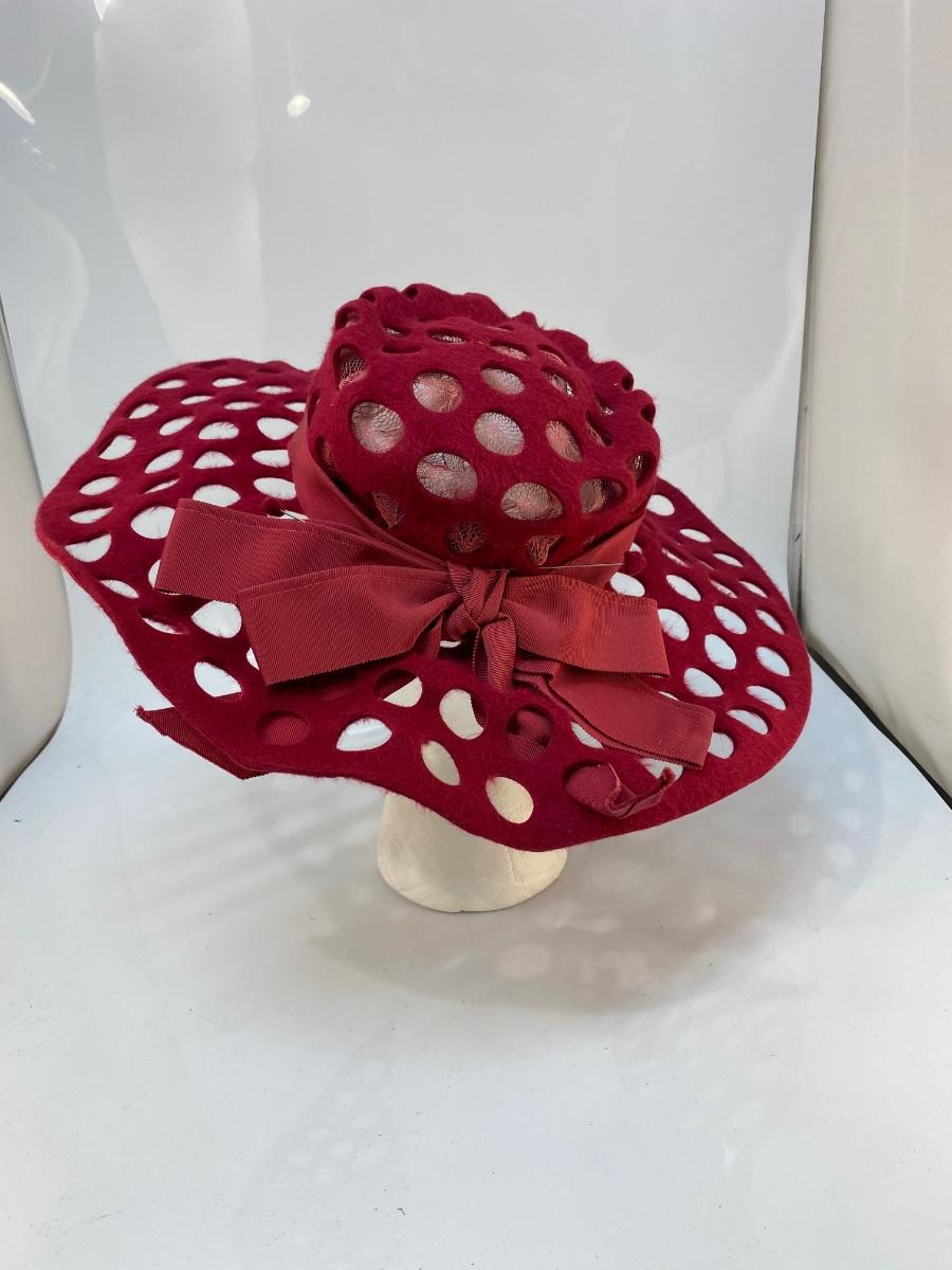 Vintage Fuchsia Burgandy Polka Dot Wide Brim Advant Garde Hat. Felt hat with polka dot holes. Good condition.