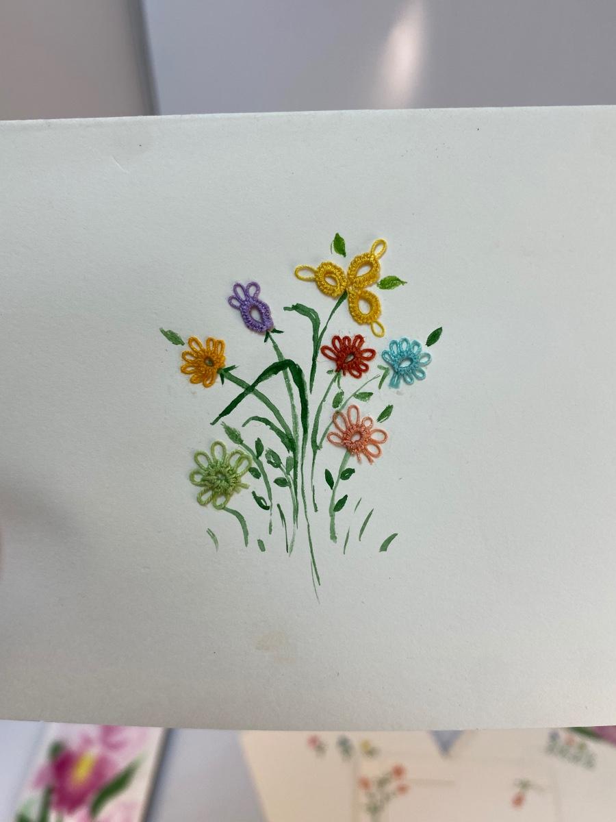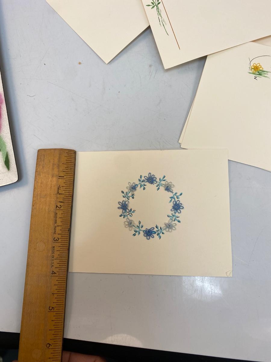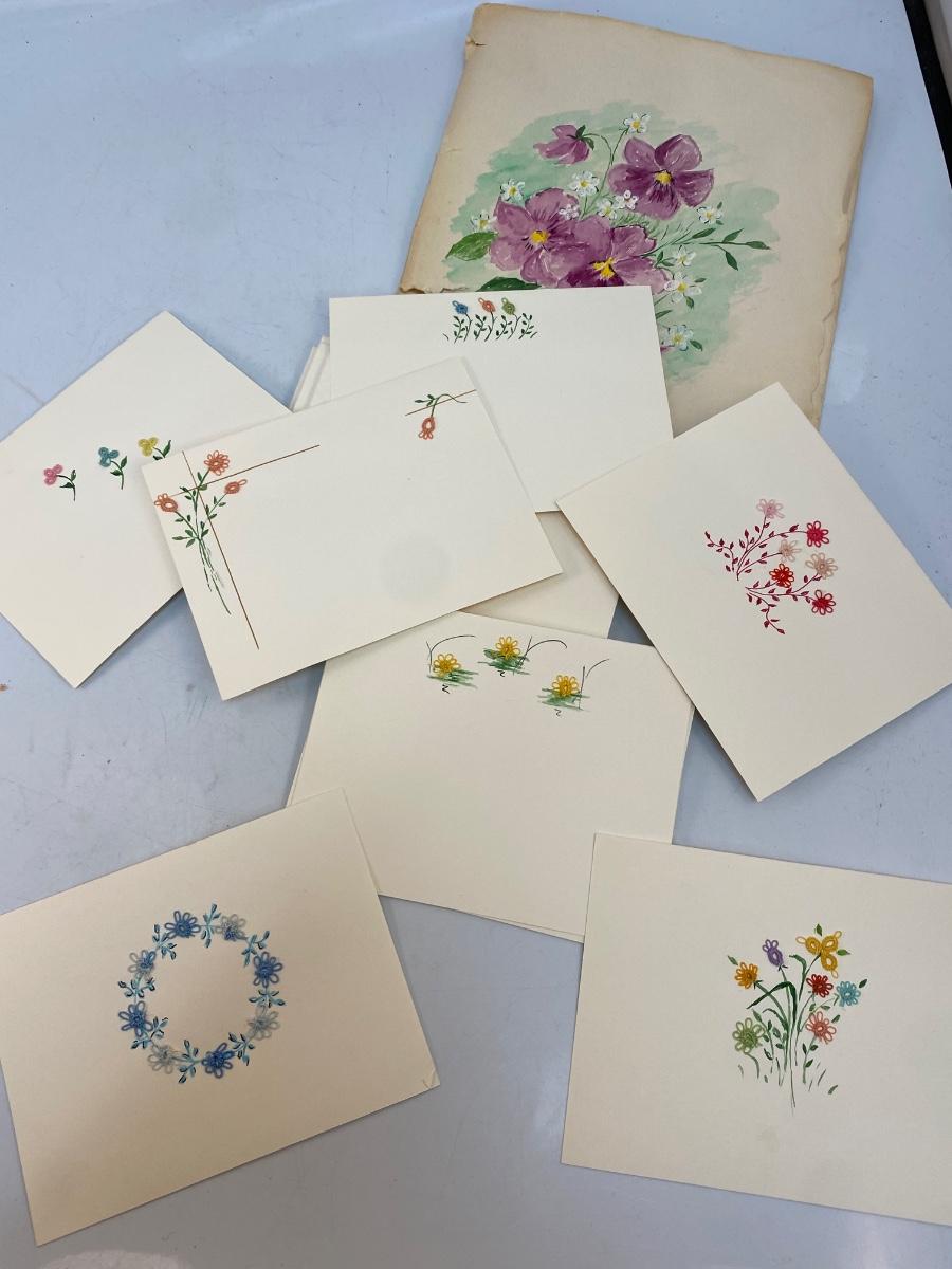 Vintage Embroidery Floss Floral Blank Inside Cards and Iris Flower Pen Trinket Tray. The cards are small size, with envelopes. Each one is a different flower pattern. Designs are made with small crochet flowers and painted greenery. See photos.