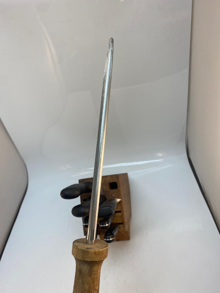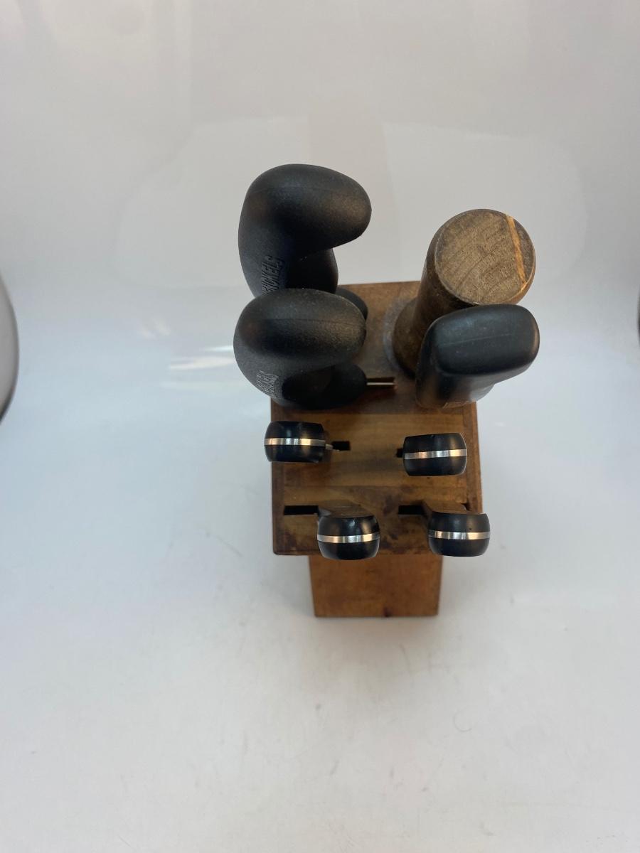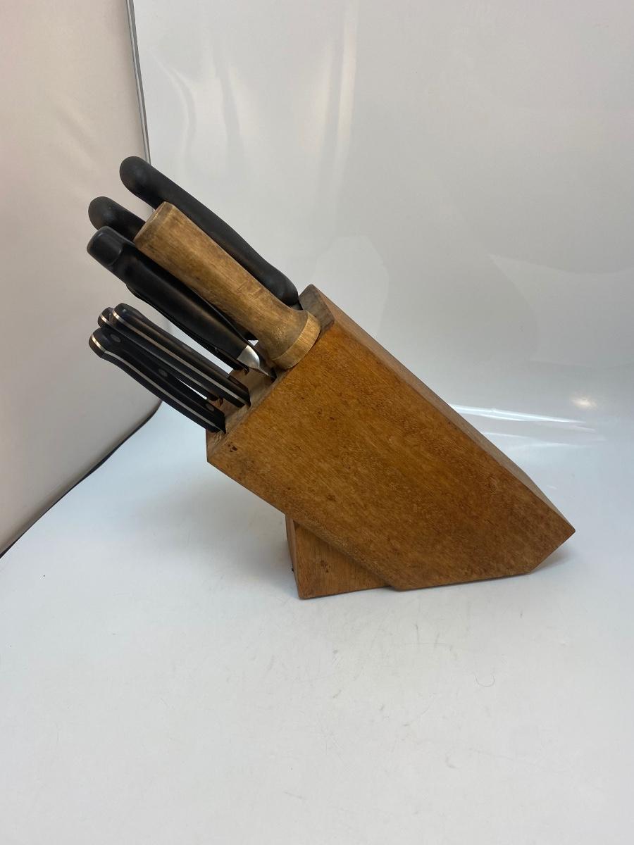 Wood Countertop Knife Block with Knives and Sharpener. Knives are in good condition, block shows age.