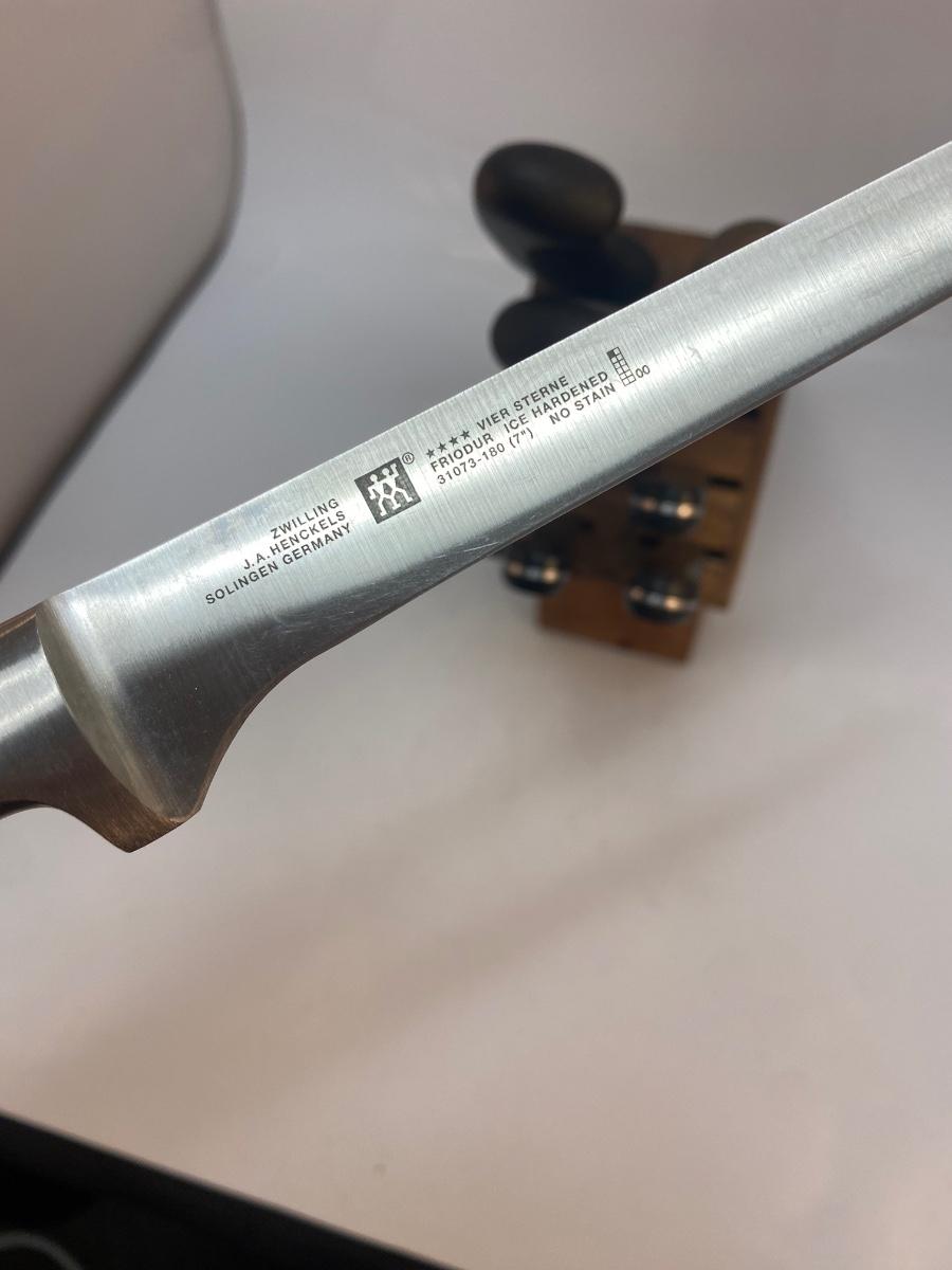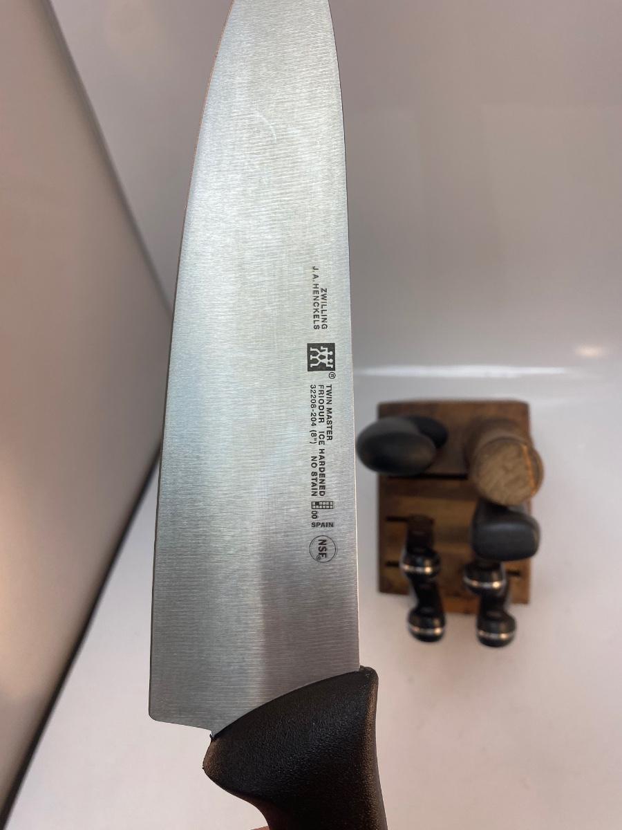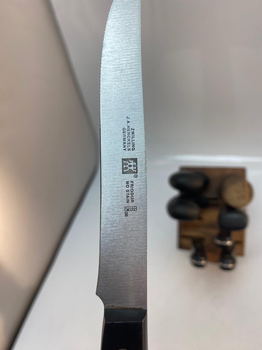 Wood Countertop Knife Block with Knives and Sharpener. Knives are in good condition, block shows age.