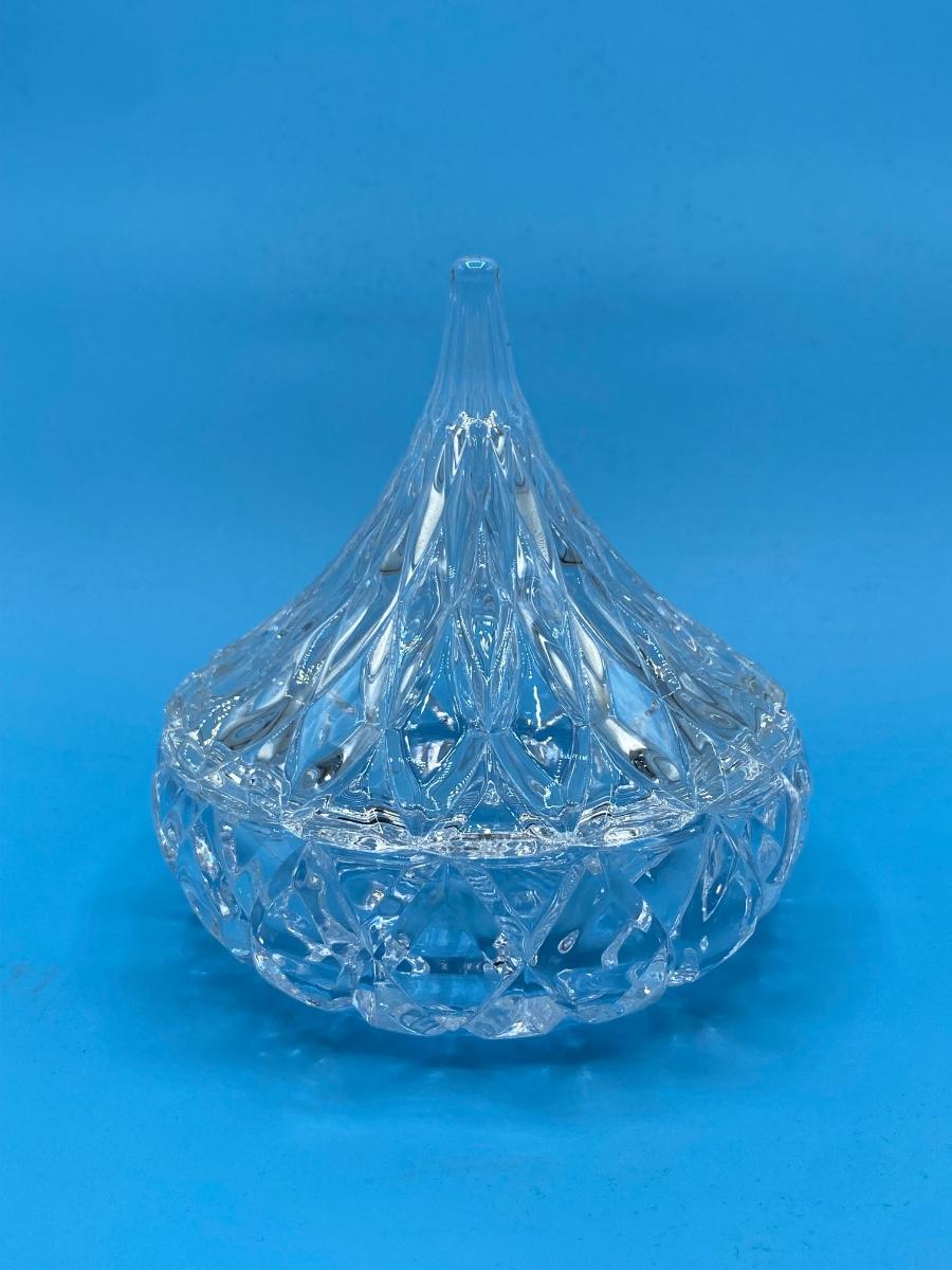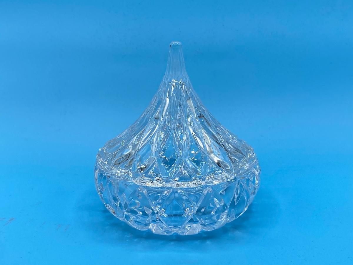 Vintage Hershey Kiss Shaped Crystal Candy Trinket Dish. In very good condition. Nice thick quality crystal. No maker name found on it. No chips. About 5.5" size.