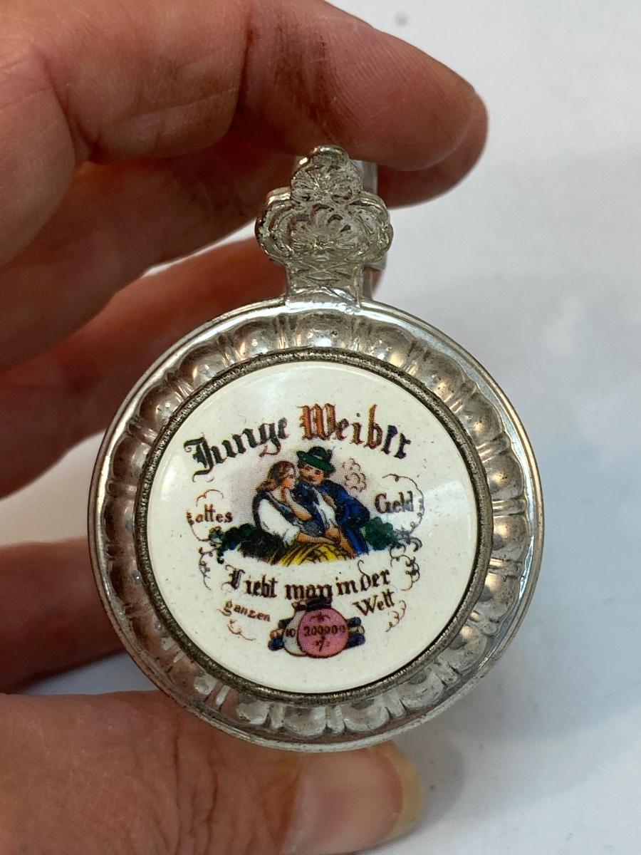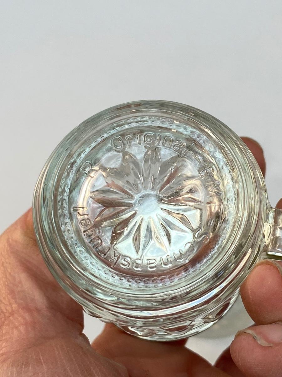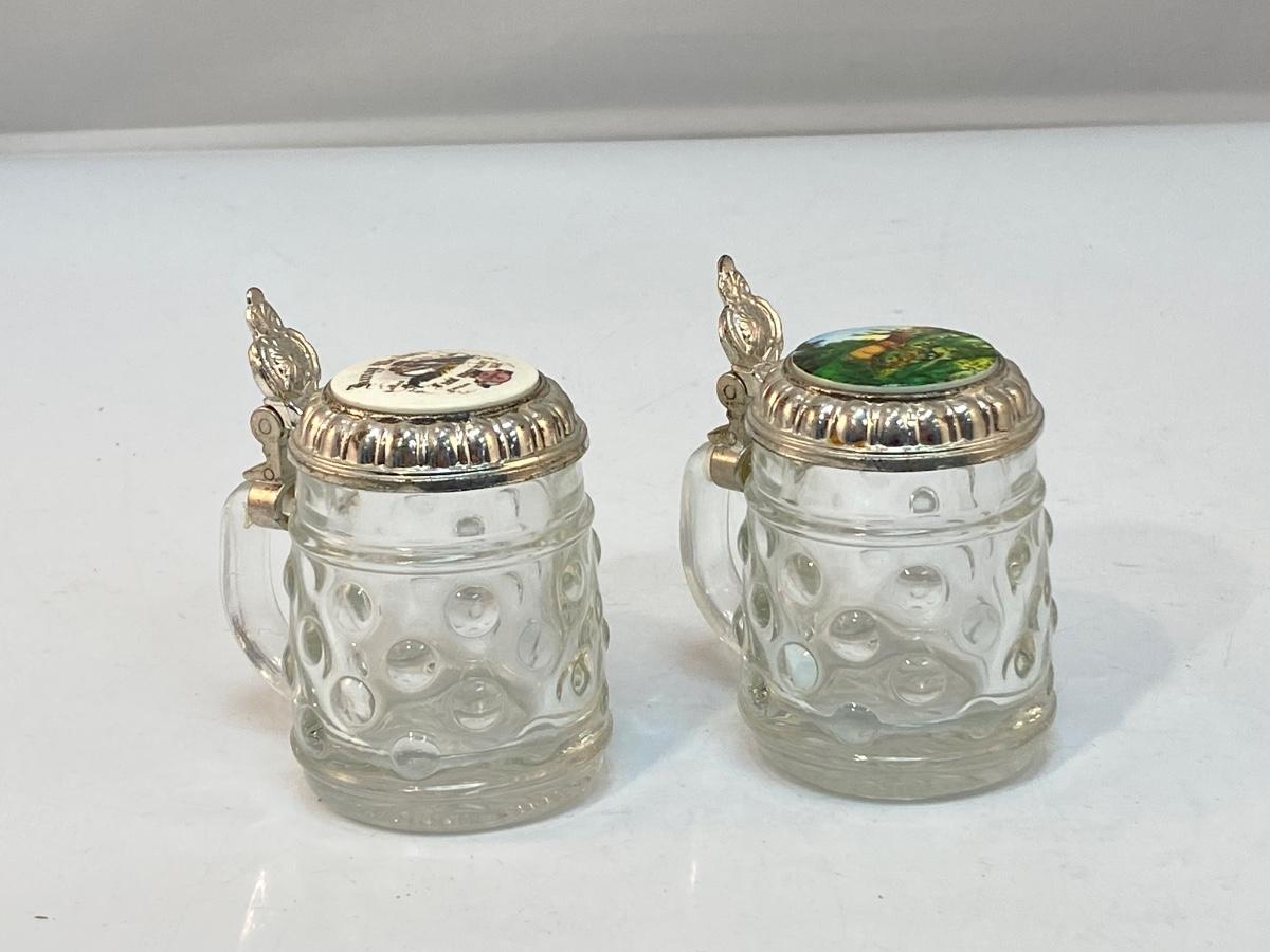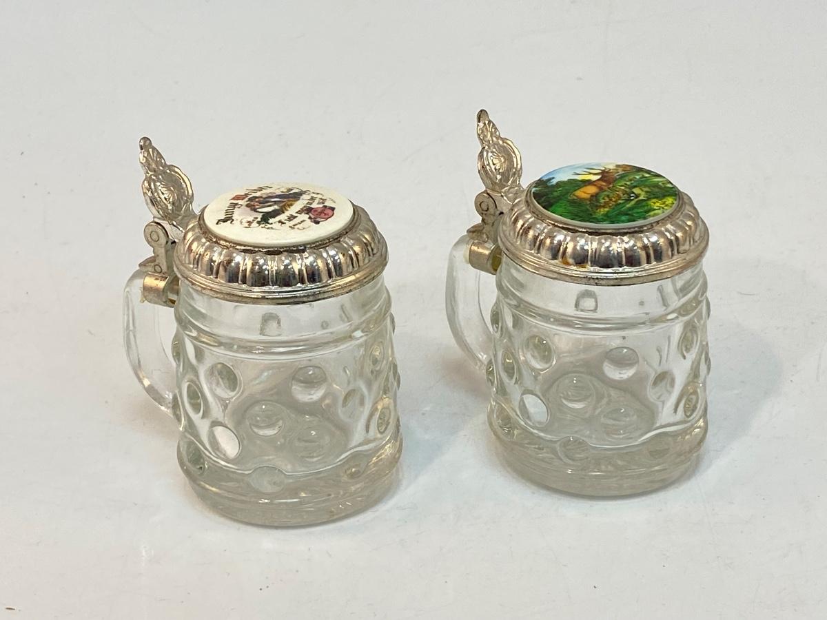 Pair of Miniature Lidded German Beer Steins Original BMF Bierseidel Hobnail Pressed Glass. In good condition. Different lid designs. About 3" size.