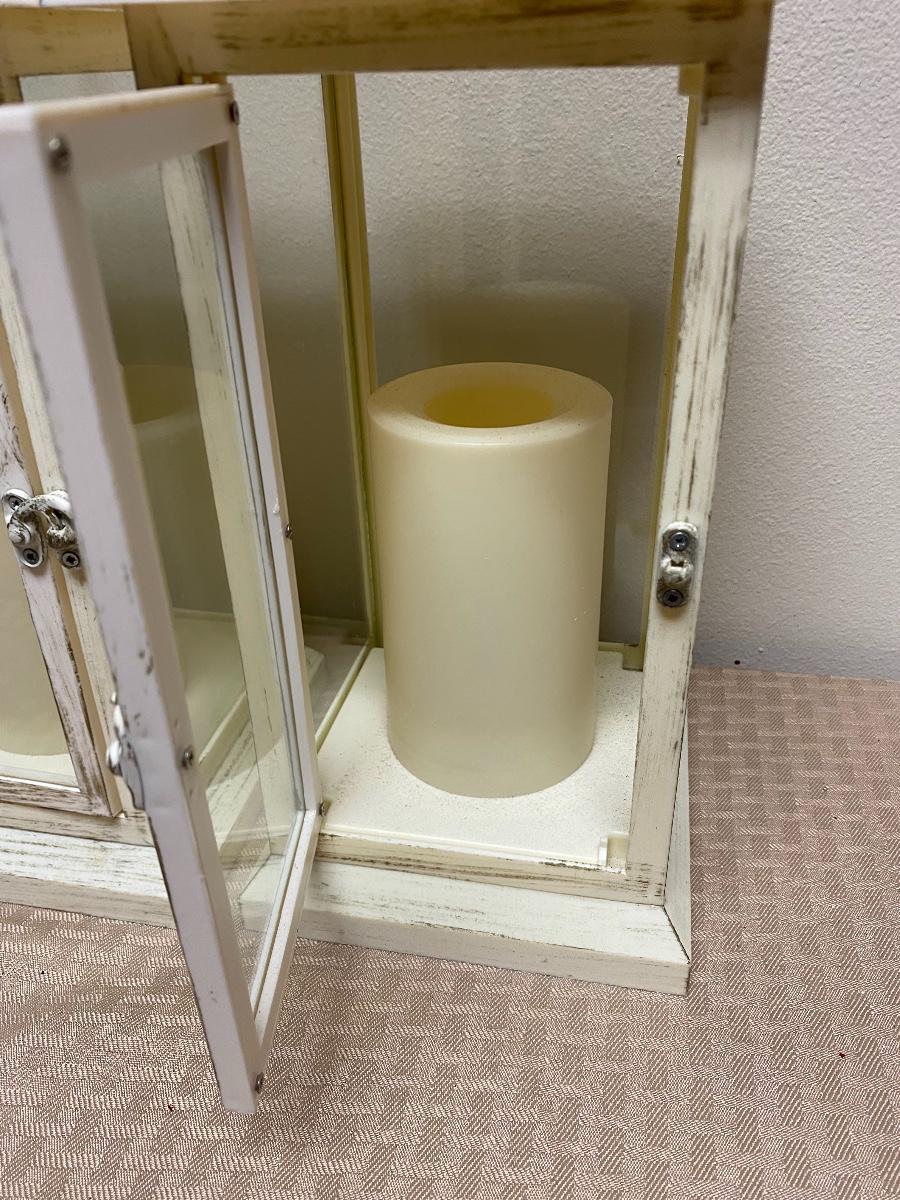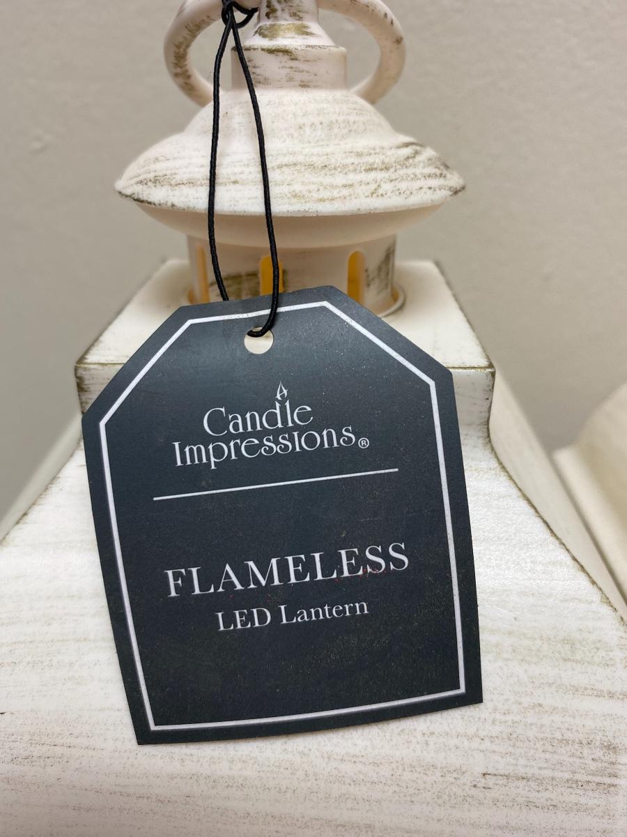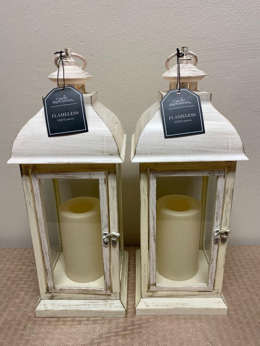 Battery Operated Flameless Candle Lantern Pair with Tags. Rustic white finish. Great for indoors or outside decor. Over 12" size.