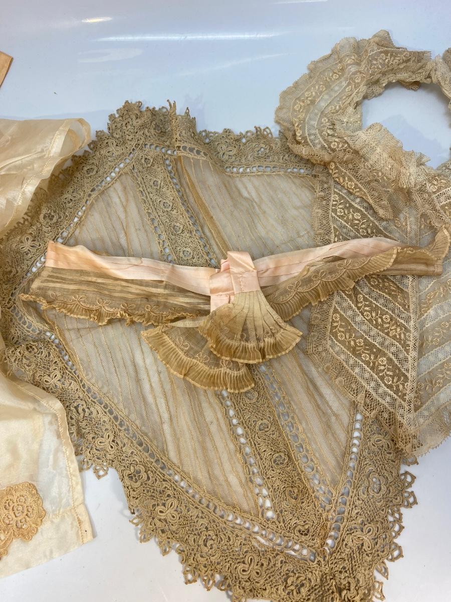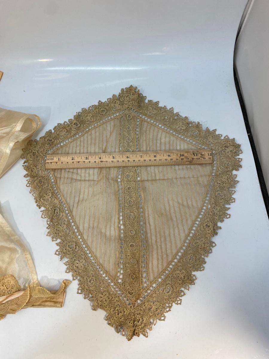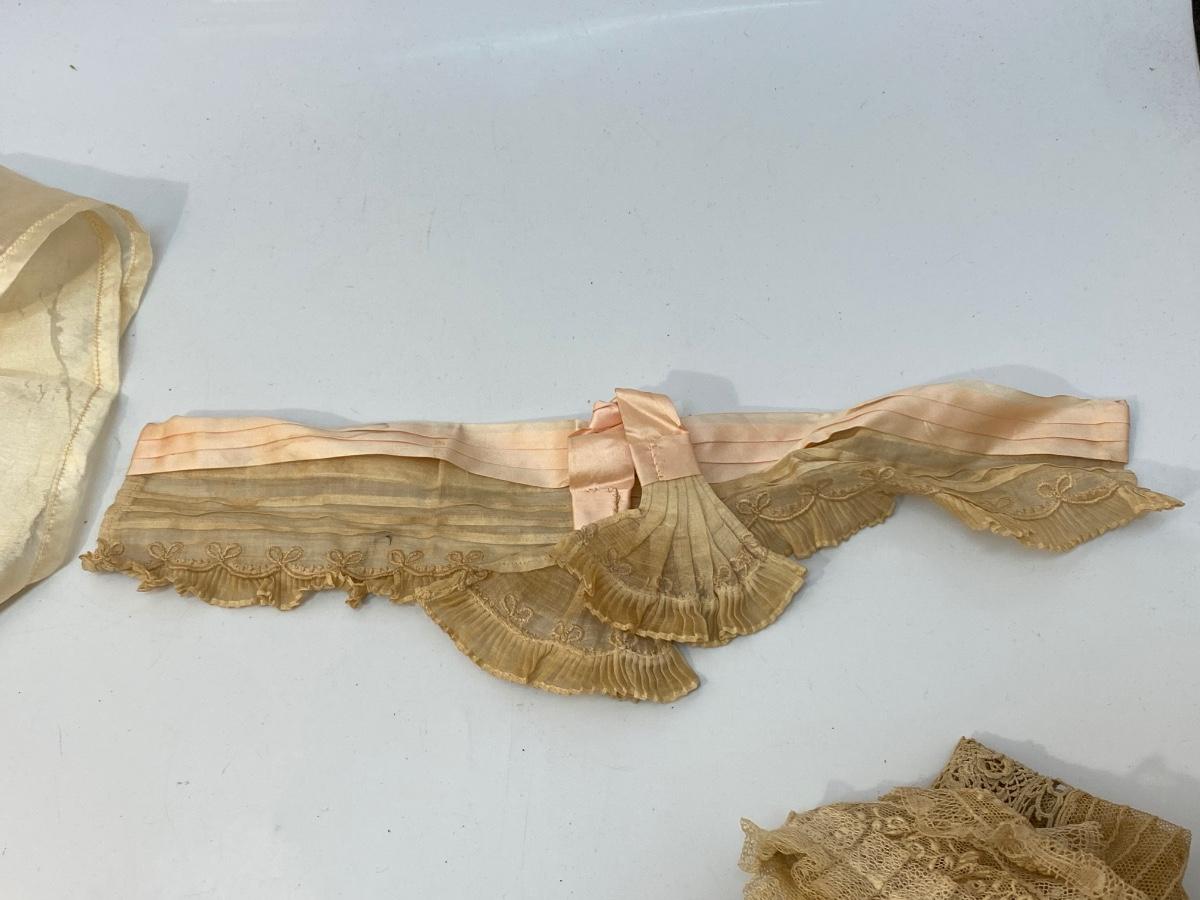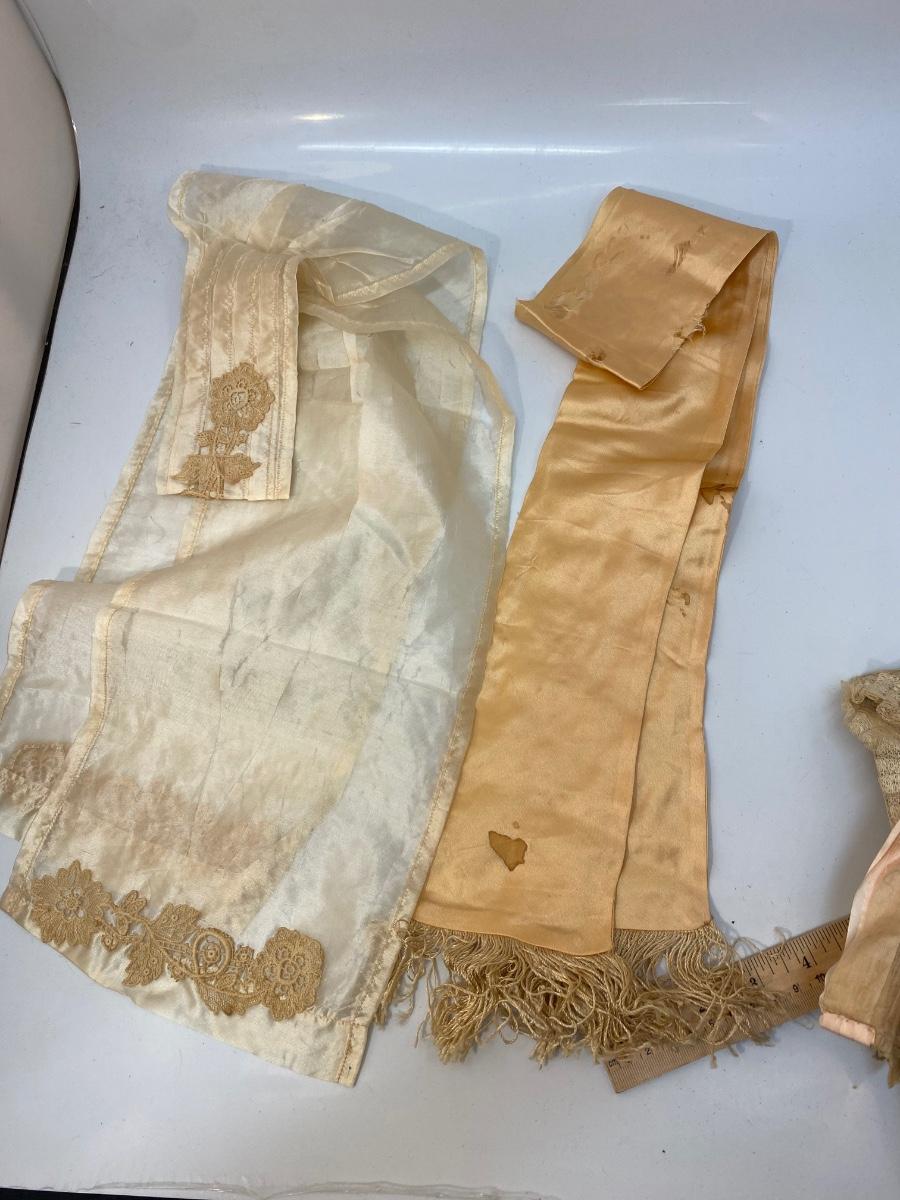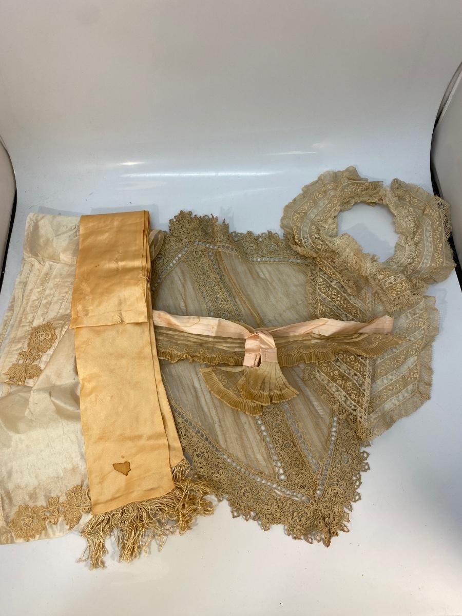 Mixed Lot of Lace Collars Sashes Ties. Mixed lot of items. Discolor on all the material on sashes is fragile and does have tears. See photos for details on lot.
