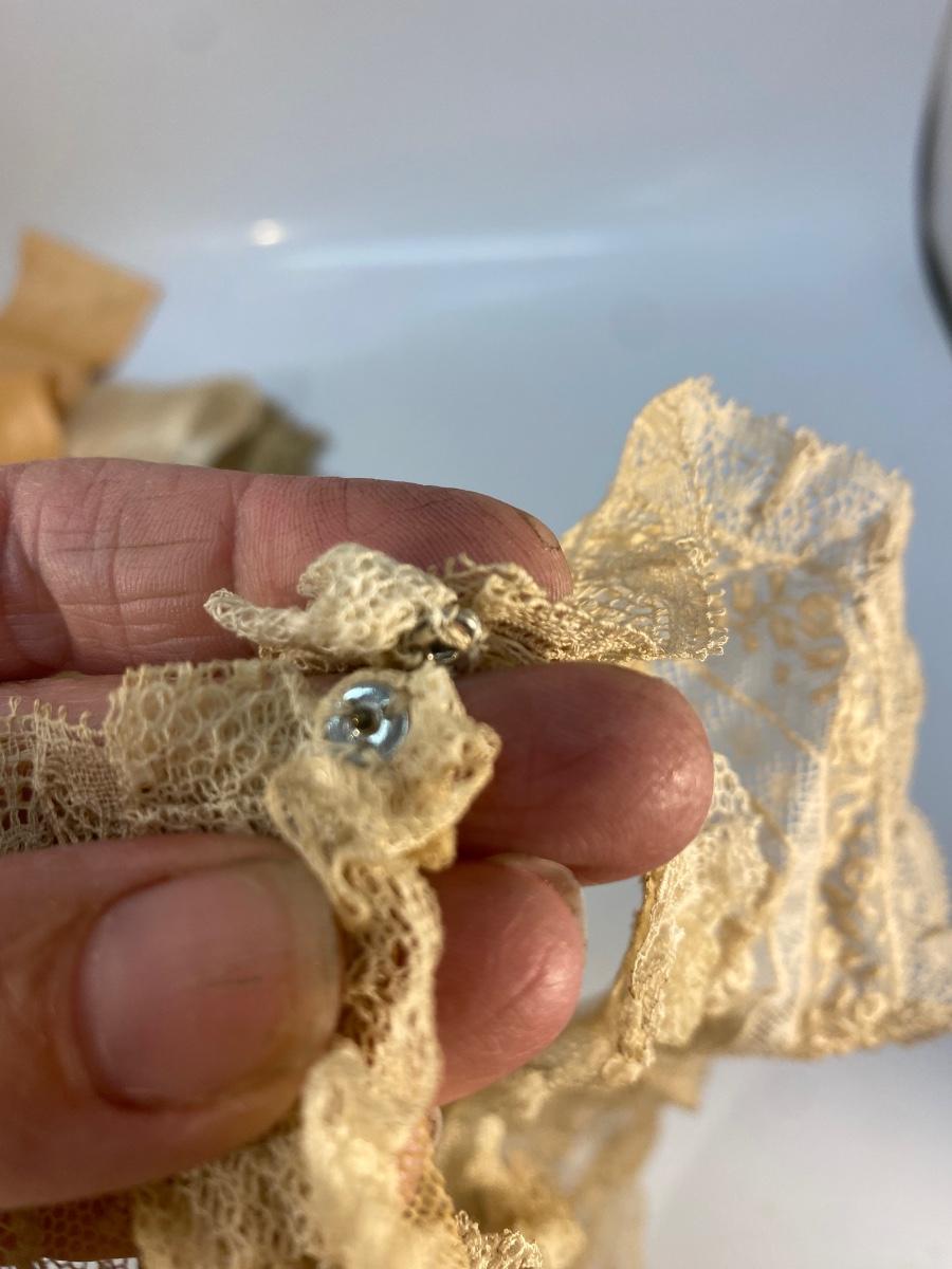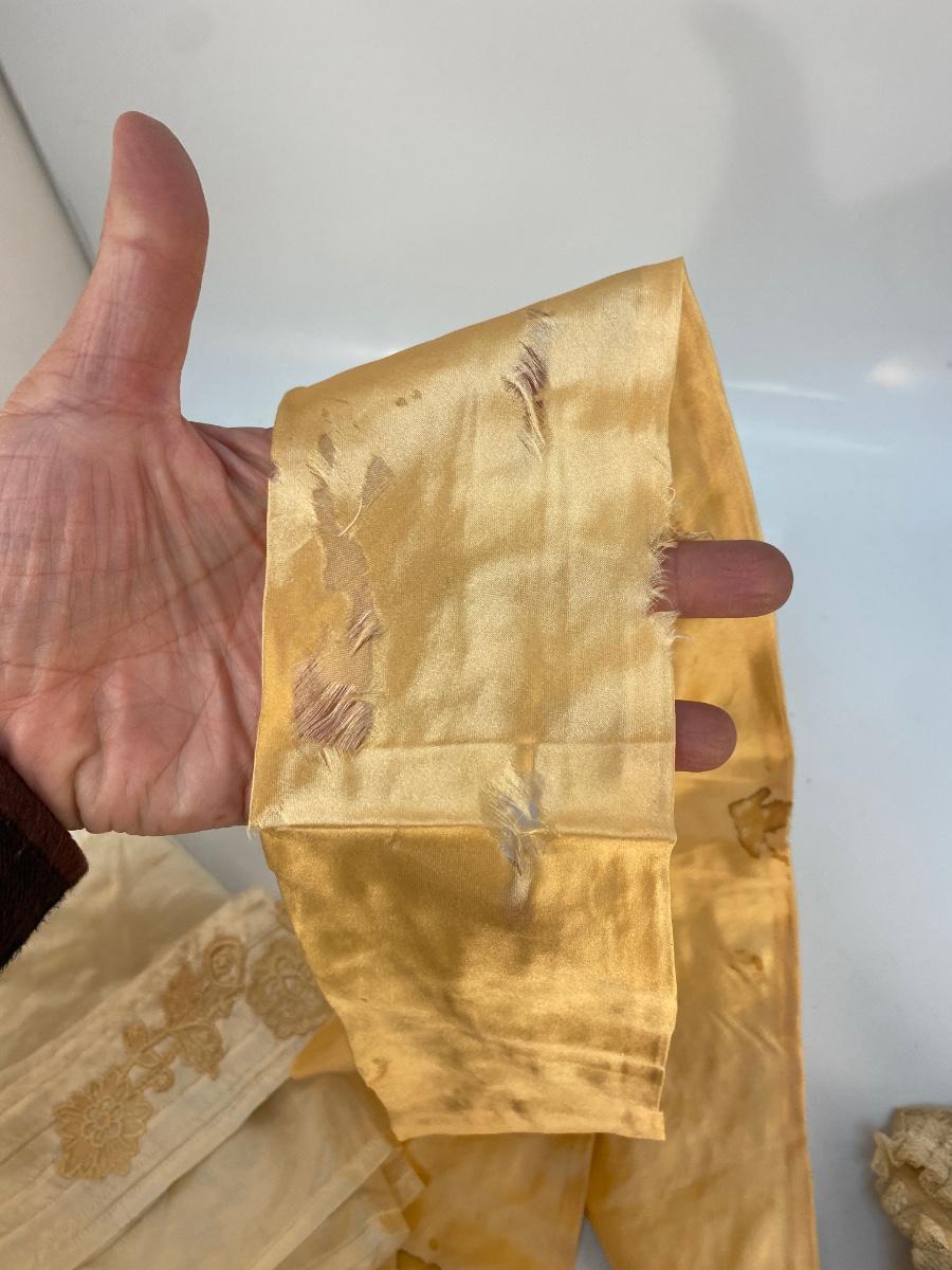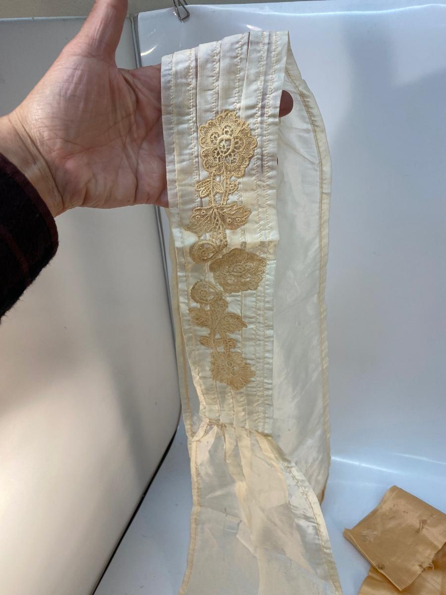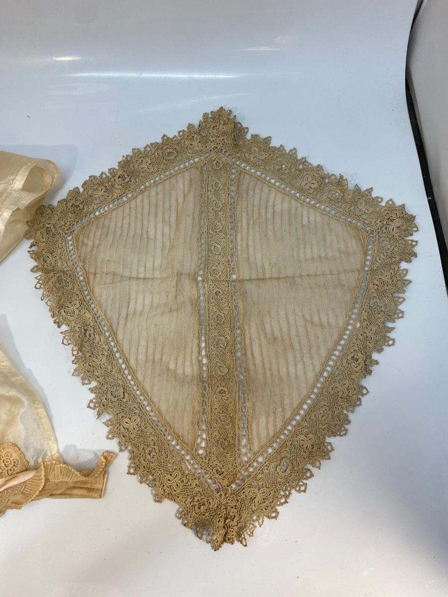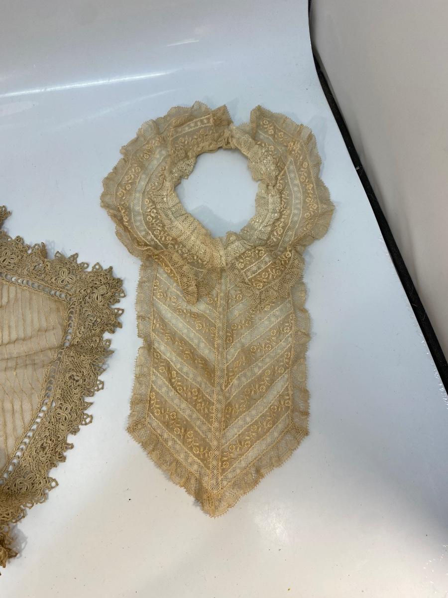 Mixed Lot of Lace Collars Sashes Ties. Mixed lot of items. Discolor on all the material on sashes is fragile and does have tears. See photos for details on lot.