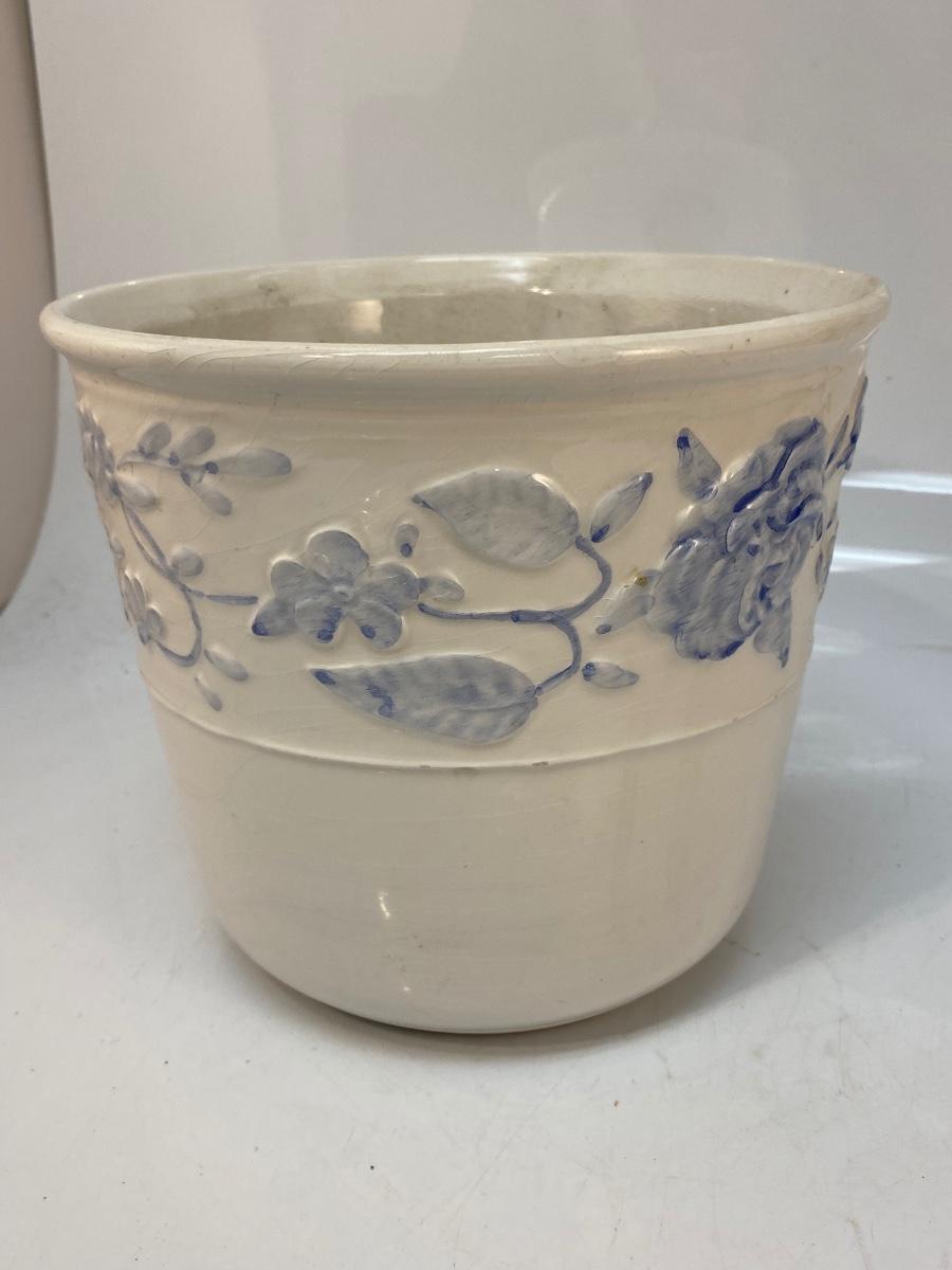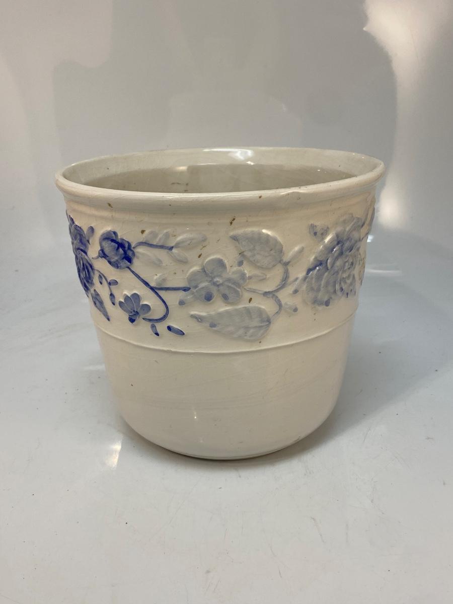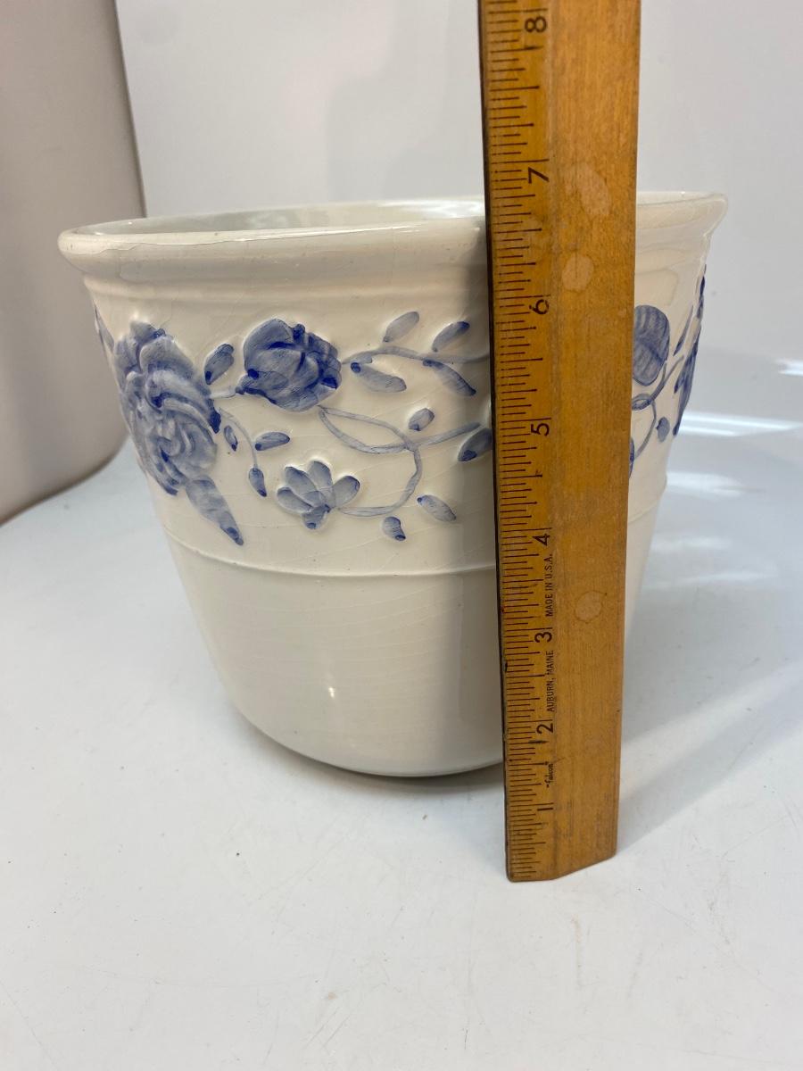 White Ceramic with Blue Floral Pattern Planter Pot. Pot is crazed but would still display nicely. 7" size.