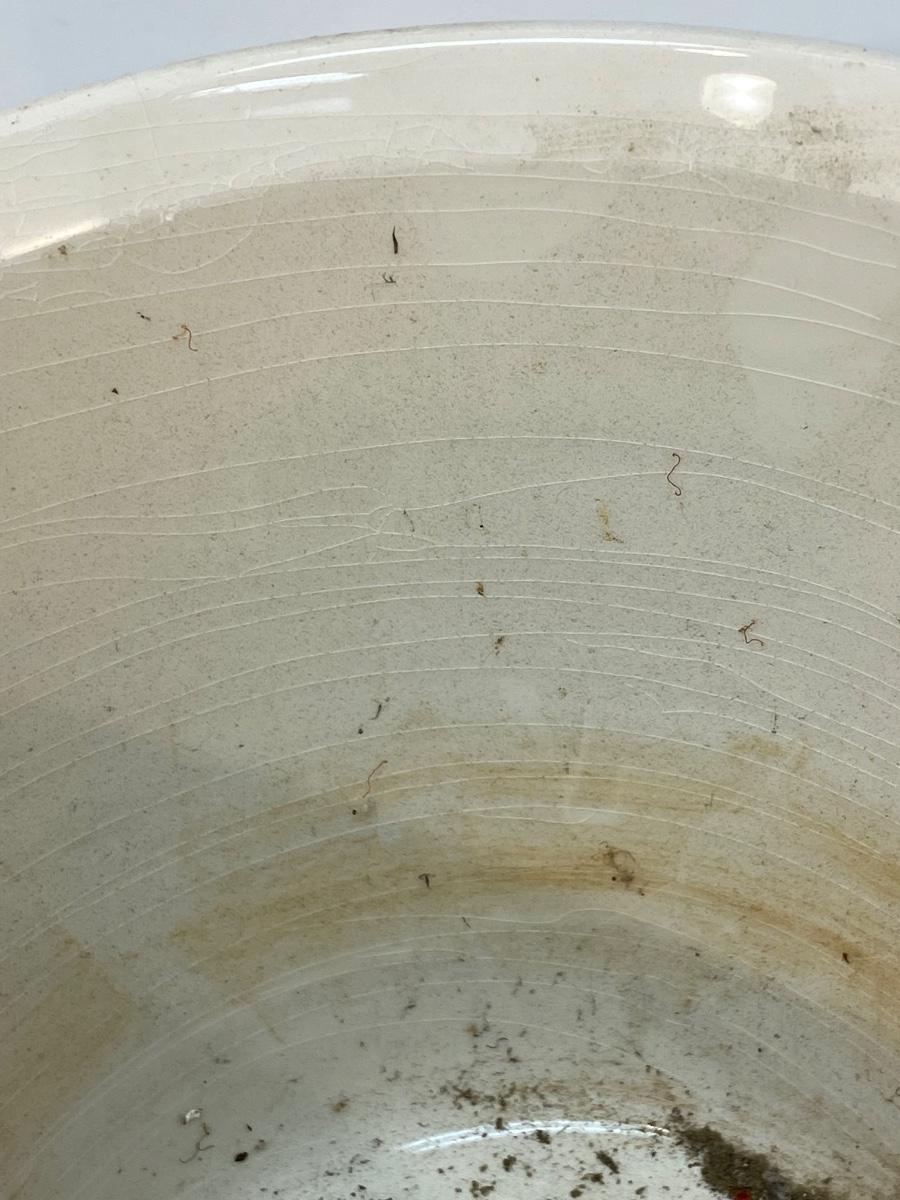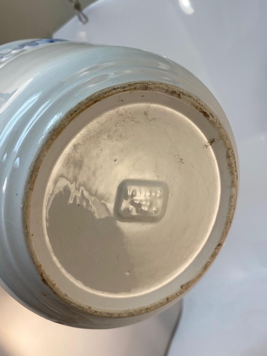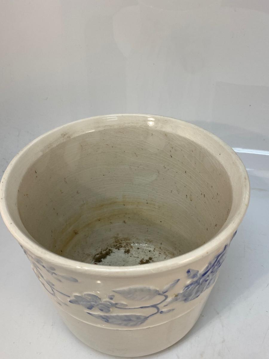 White Ceramic with Blue Floral Pattern Planter Pot. Pot is crazed but would still display nicely. 7" size.