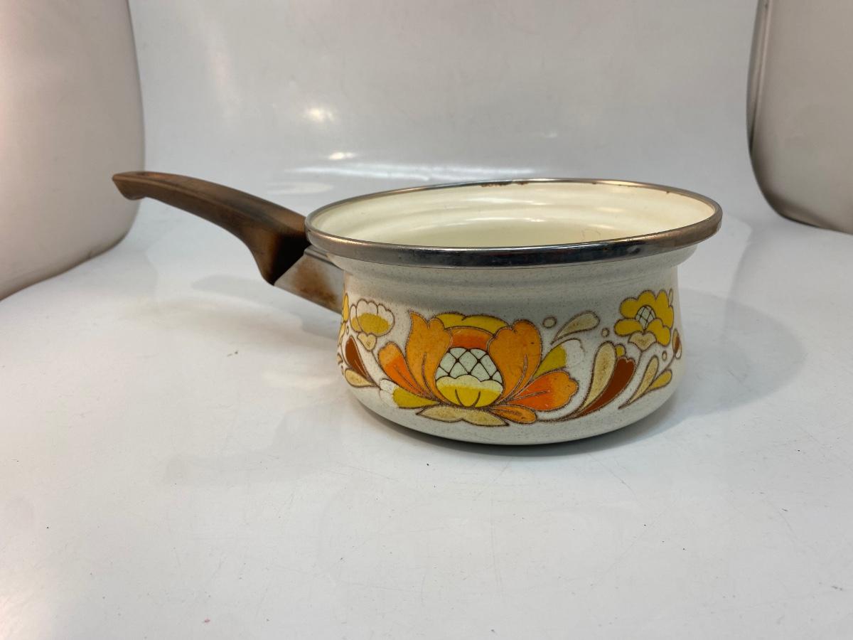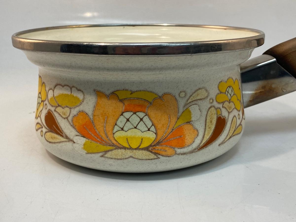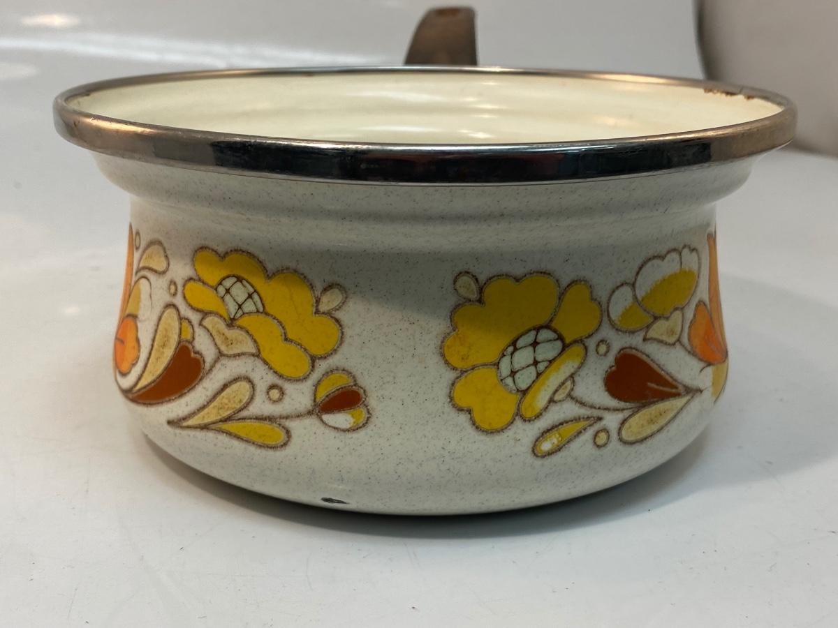 Retro Sanko Ware Japan Country Flowers Porcelain Enameled Cookware Orange & Yellow Flowers Small Saucepan. In previously used condition. Would display great. No lid.