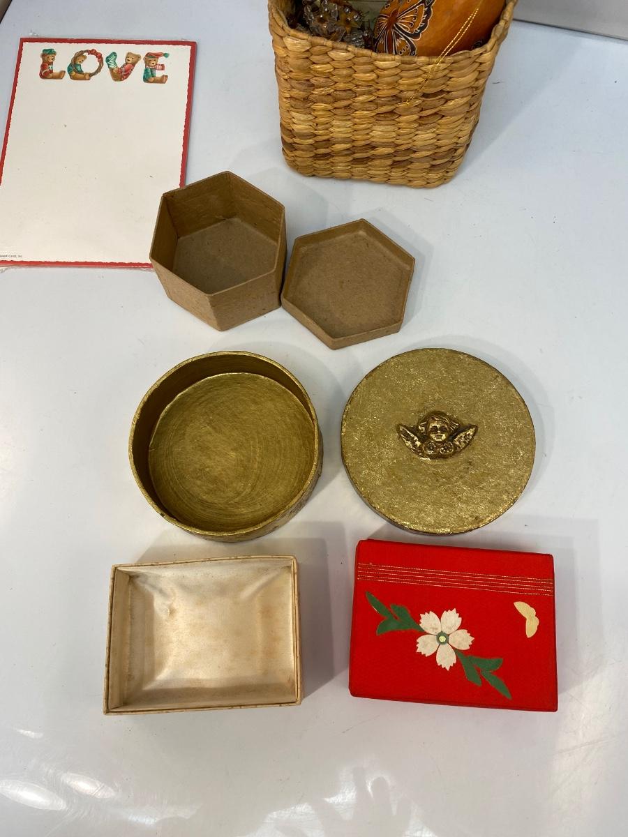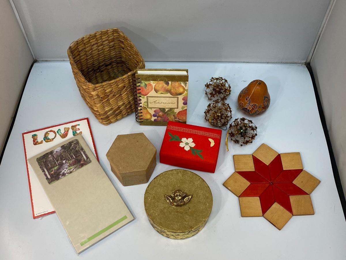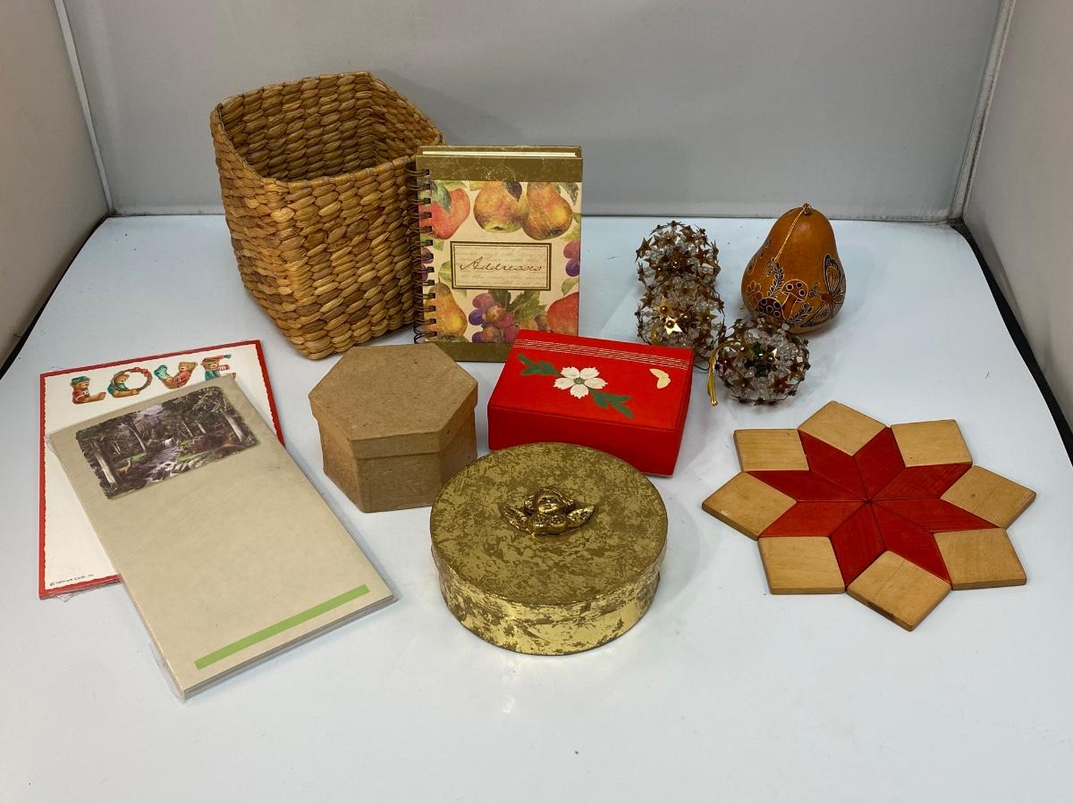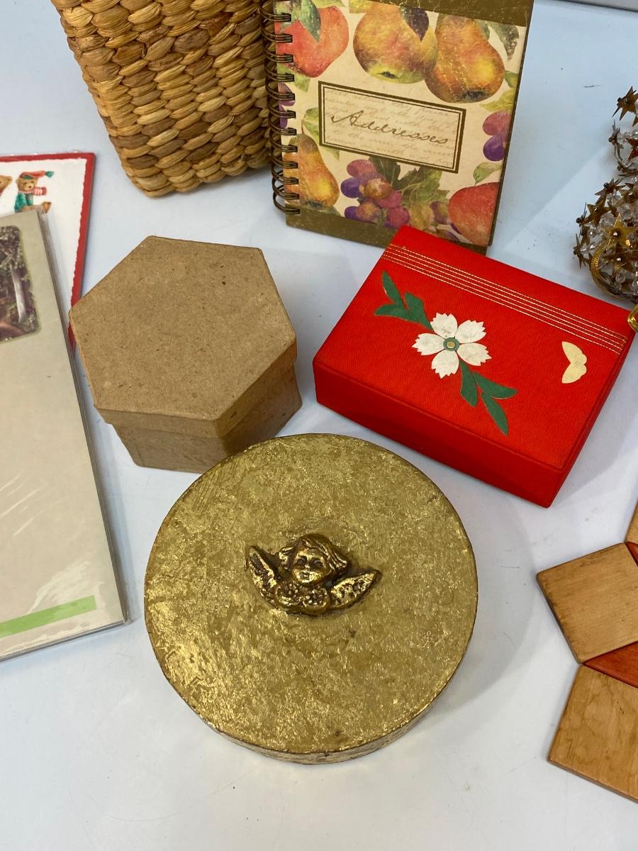 Mixed Lot of Trinket Boxes Stationary Shelf Decor and More. In good condition. The trinket boxes are Cardboard materials, Both notepads and address book are like new unused. Wood Trivet is a vacation souvenir from Niagara Falls but displays well upside down.