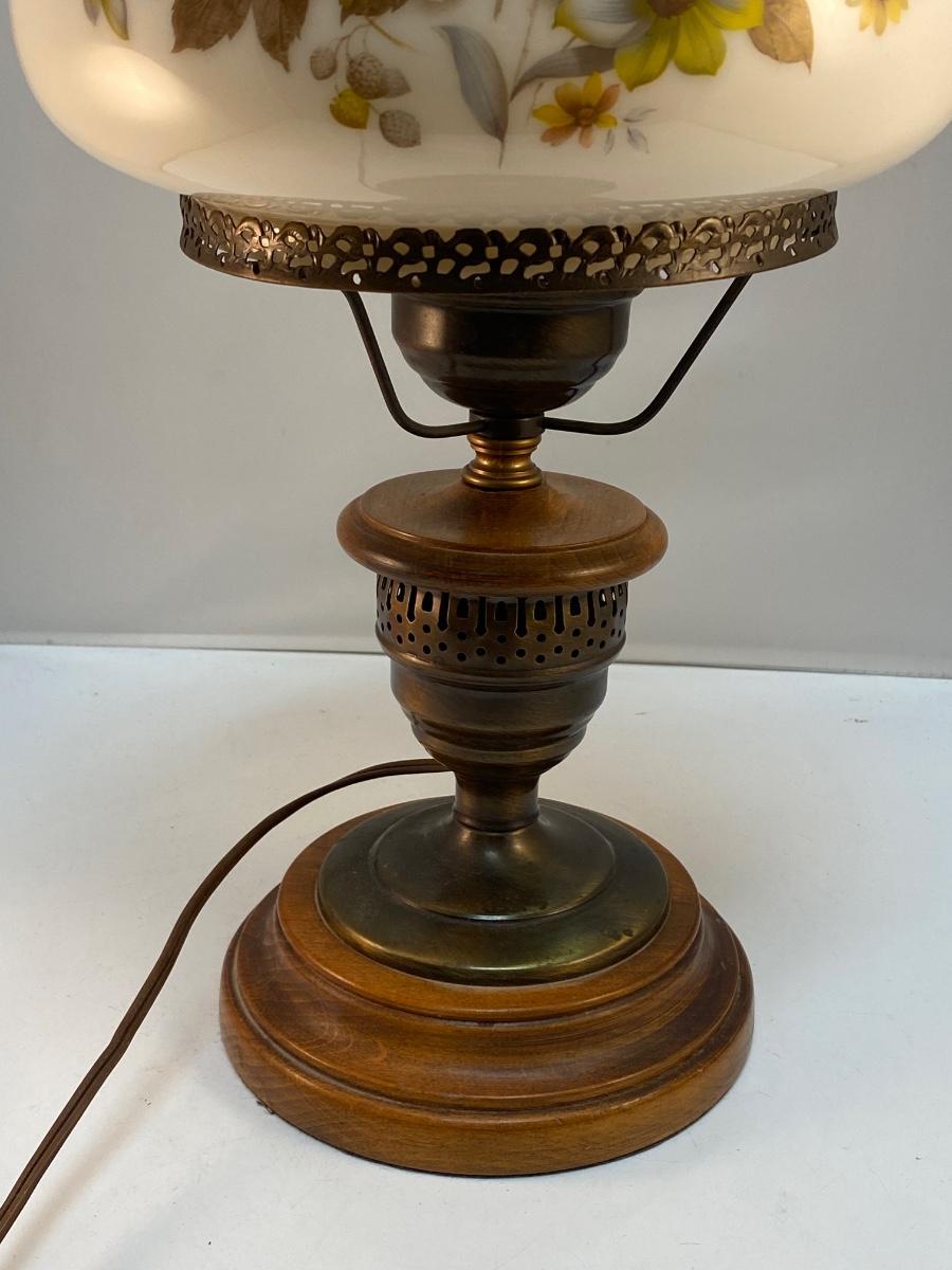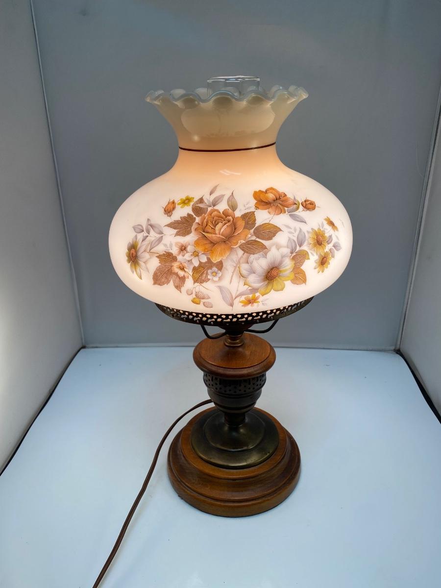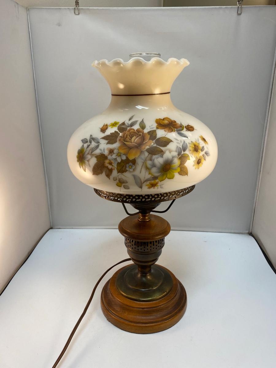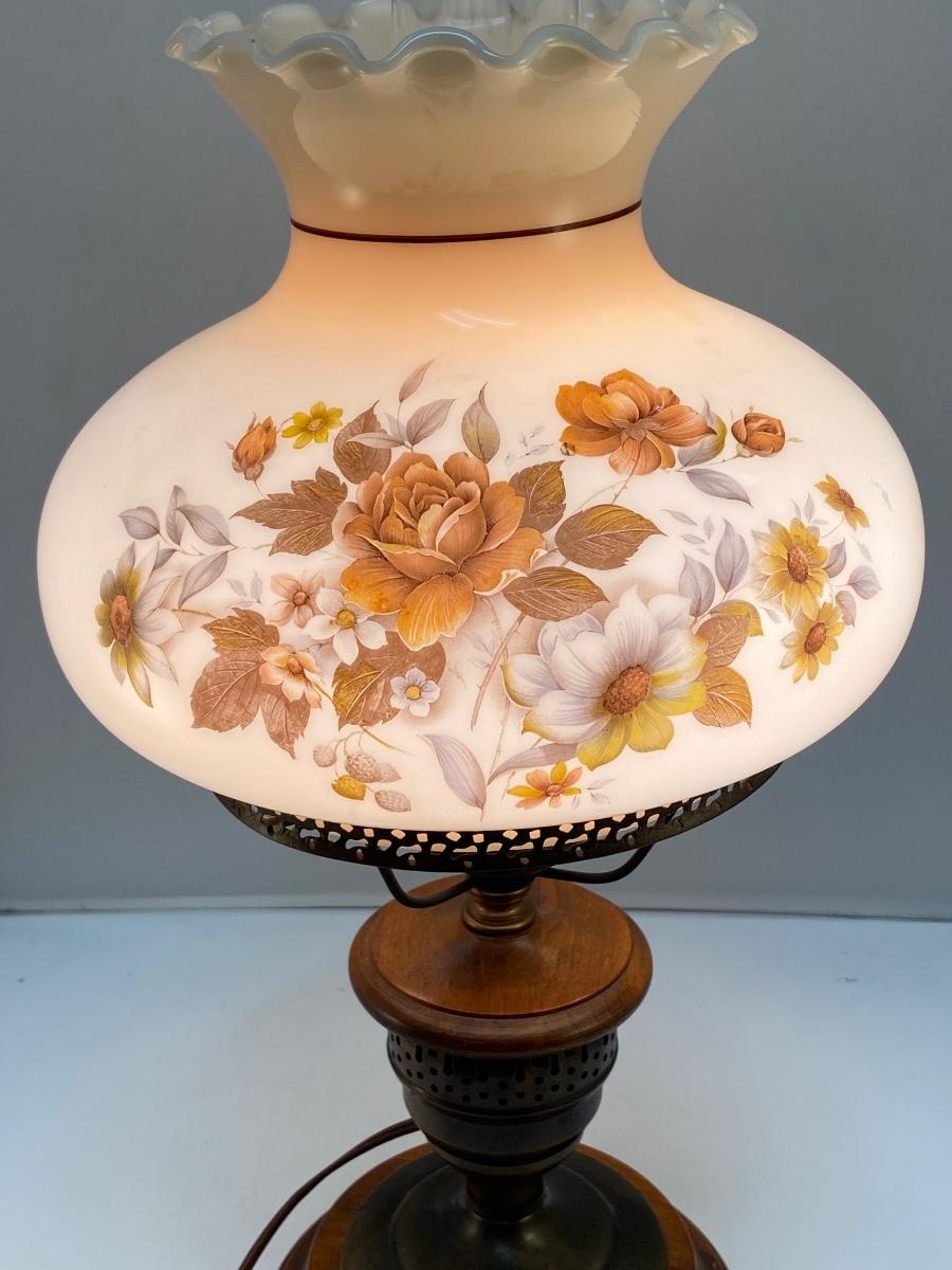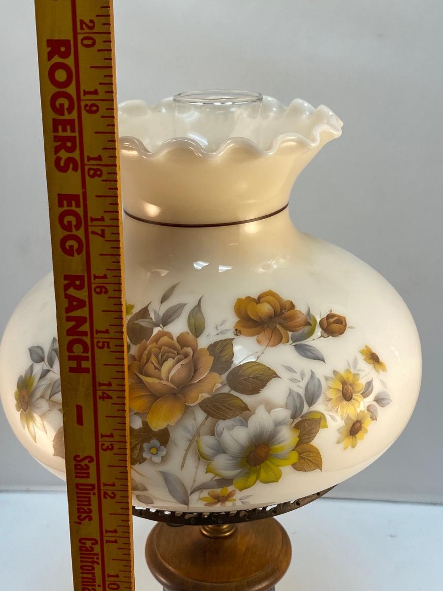 Vintage Country Rustic Wood Base Warm Tone Flower Painted Globe Hurricane Parlor Table Lamp. In good condition. Works. Stands about 19" tall.