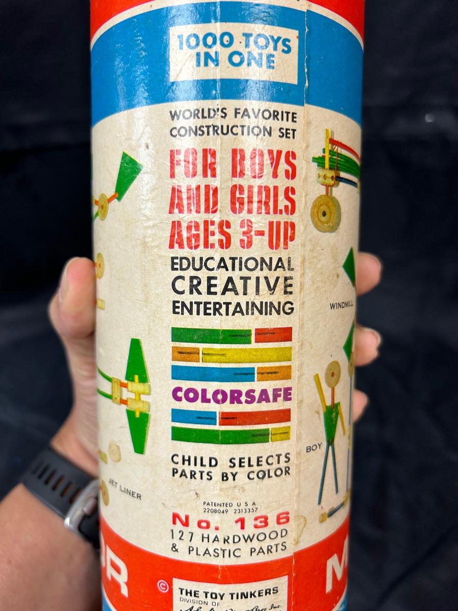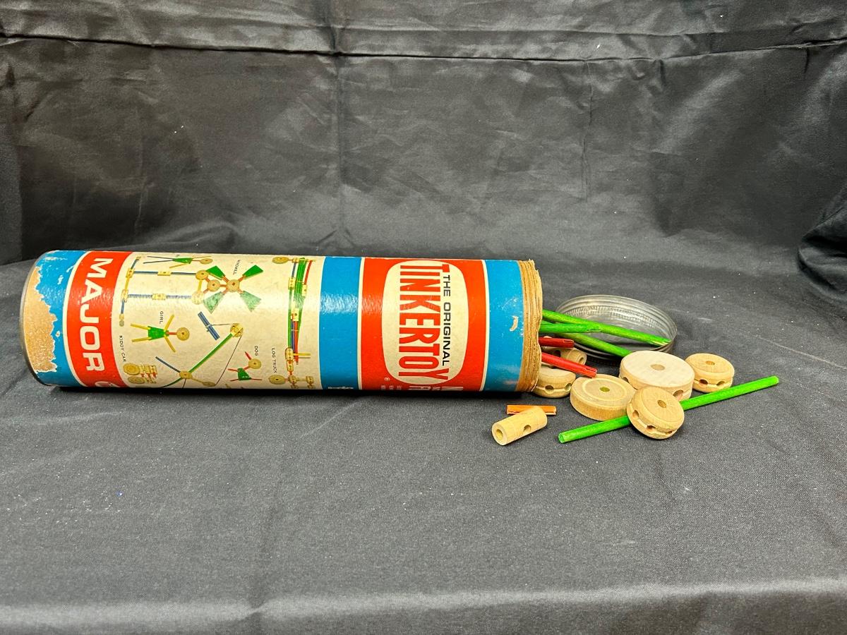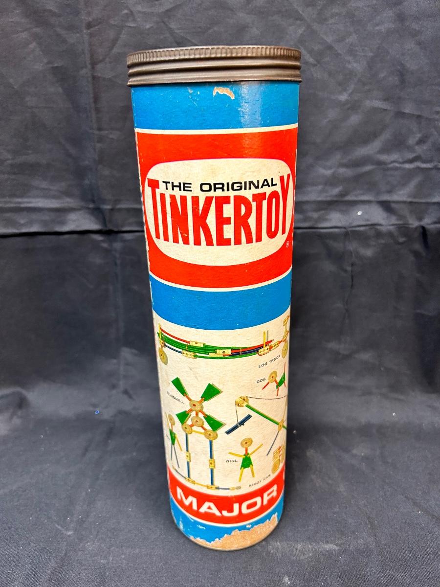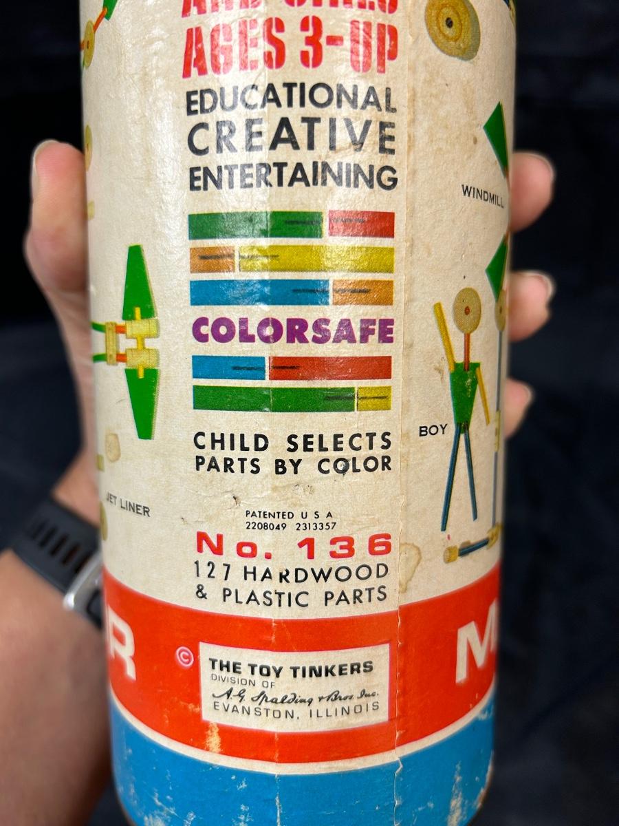 Vintage The Original Tinkertoy Wood Building Playset in Cardboard Tube Packaging