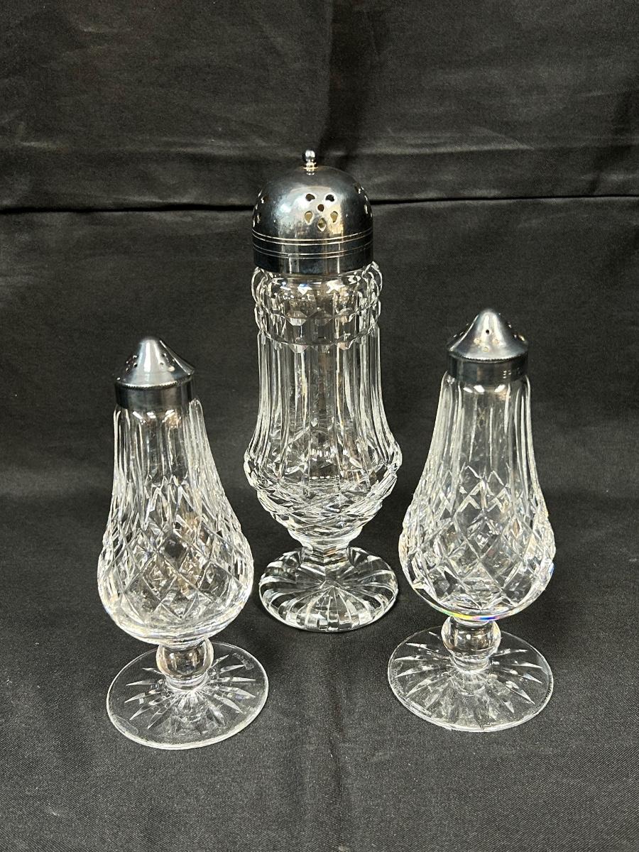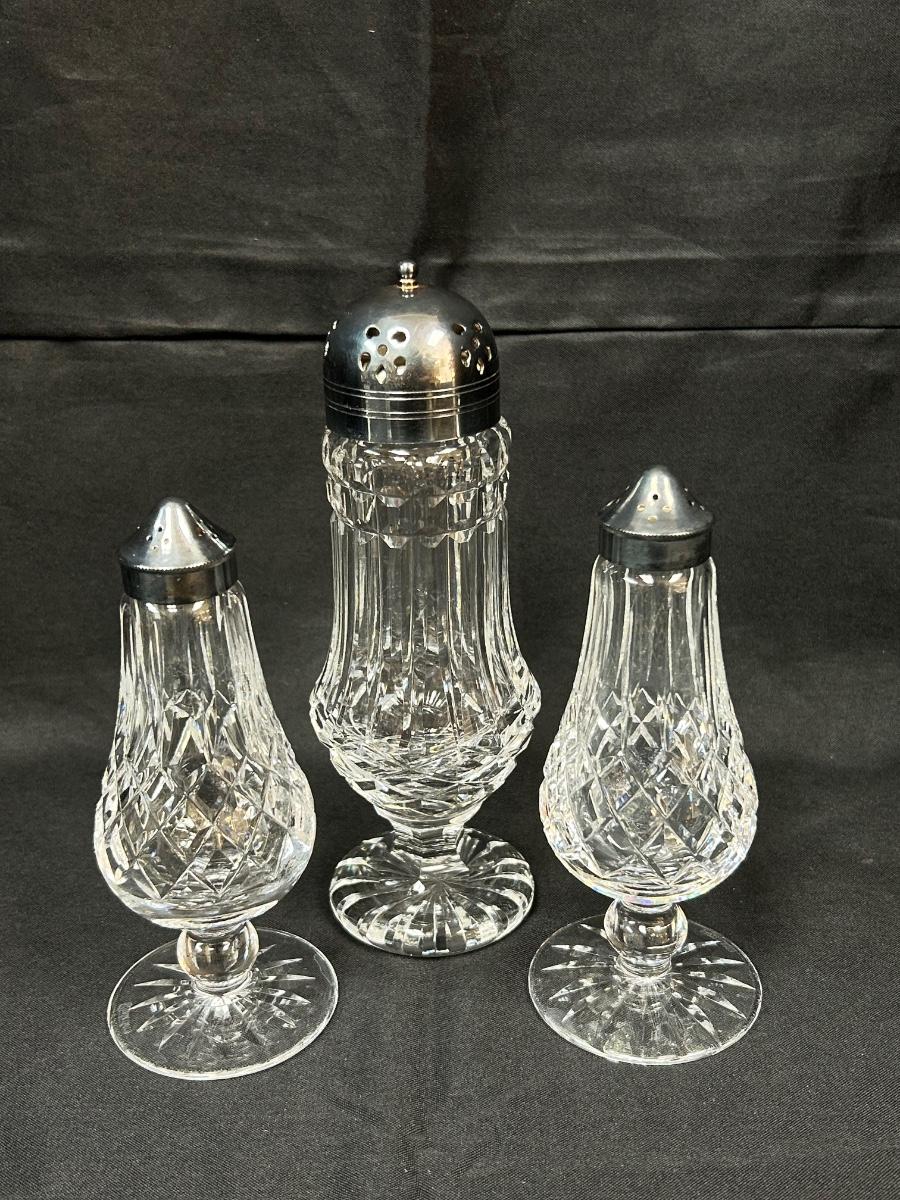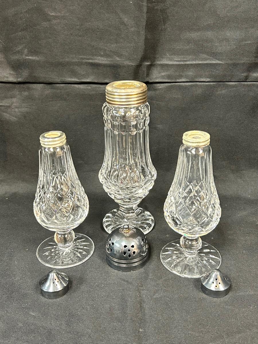 Vintage Waterford Crystal Footed Master Muffineer Shaker with Two Smaller Salt & Pepper Shakers