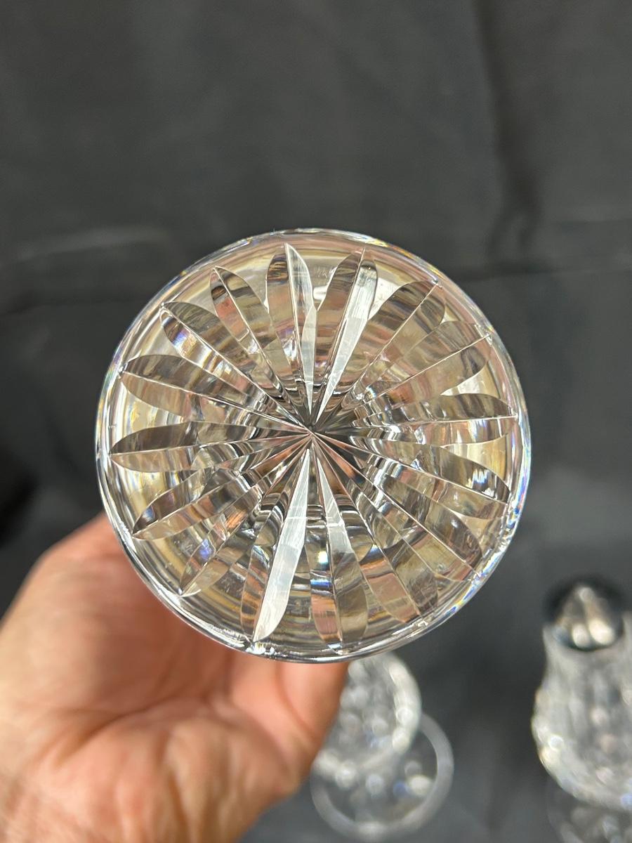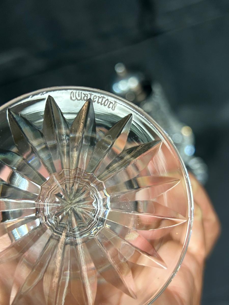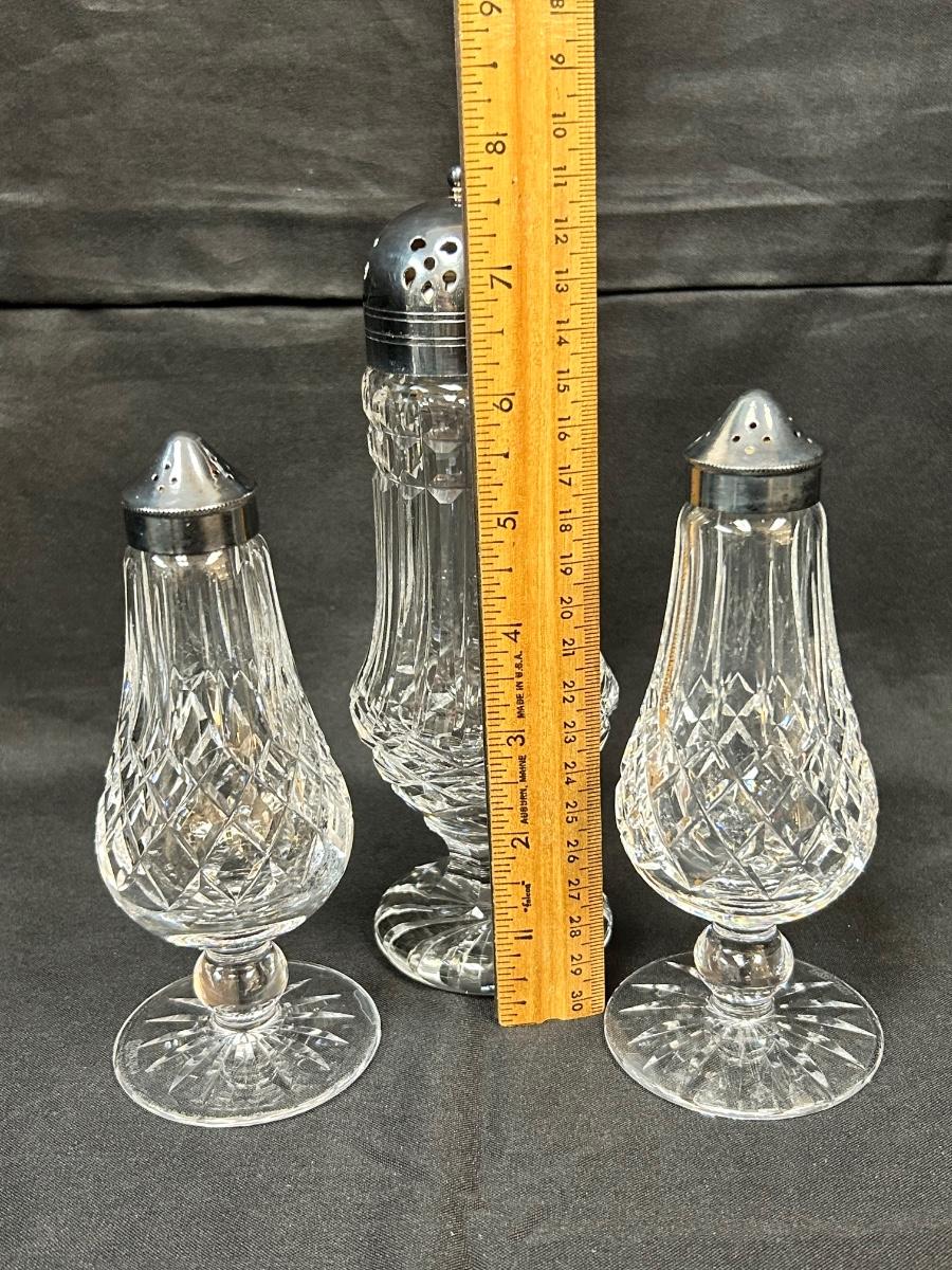 Vintage Waterford Crystal Footed Muffineer Shaker with Two Smaller Salt & Pepper Shakers. In good vintage condition. Silver plate caps and threads along opening of shakers. All pieces have the Waterford stamp, just hard to see on the muffineer shaker. Cut patterns are different from the pair and master. 8" size and 6" size.