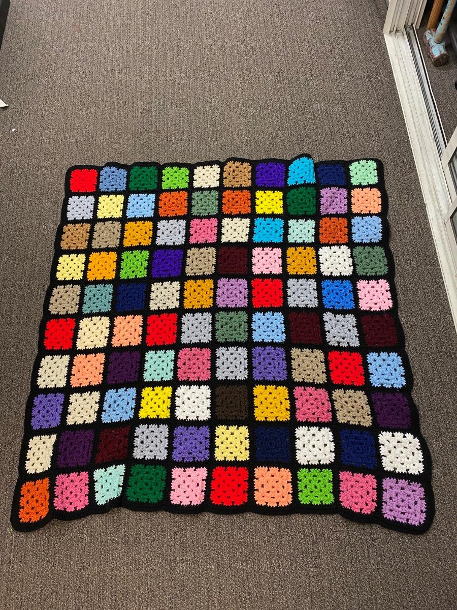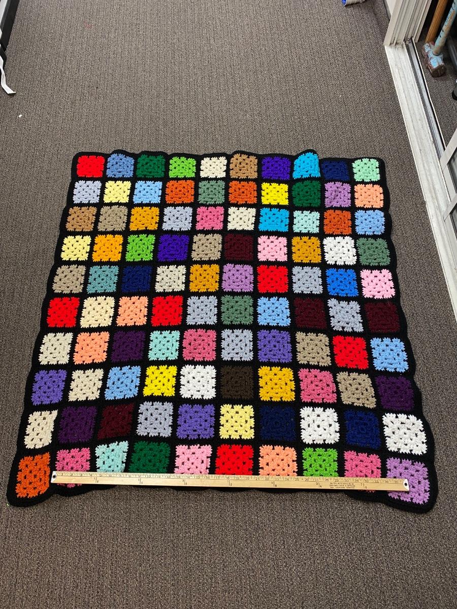 Small Colorful Block Pattern Crochet Afghan Throw Blanket. A little over 3' square. In good condition.