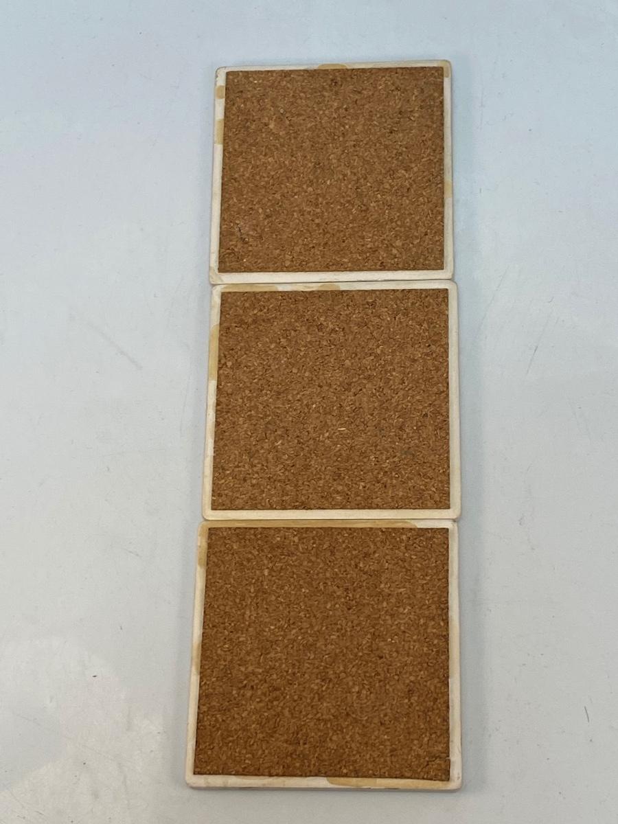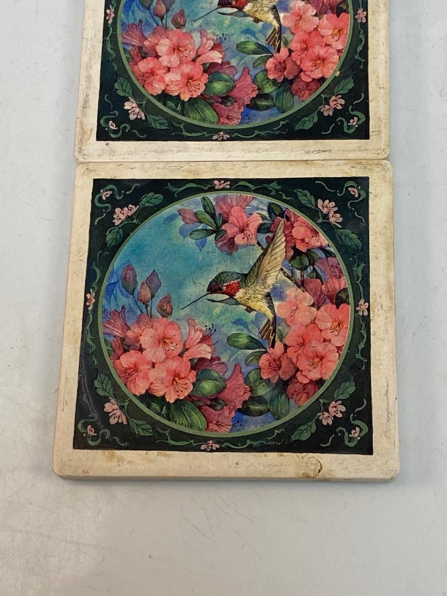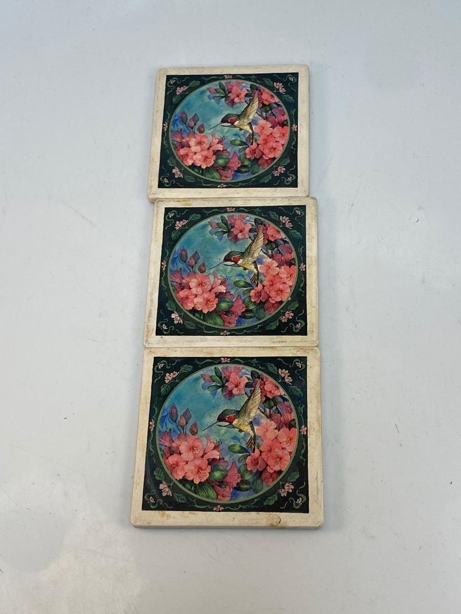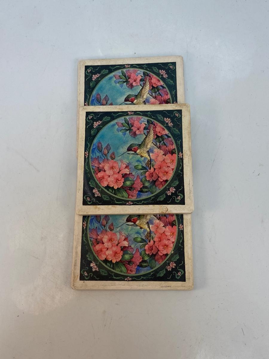 Set of 3 Hummingbird and Flower Coasters Cork Back. Some discolor and signs of use. Standard coaster size.