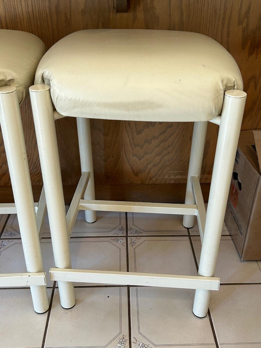 Pair of Retro 1980s Metal Barstools Cream Colored Vinyl Seats. In good vintage condition.