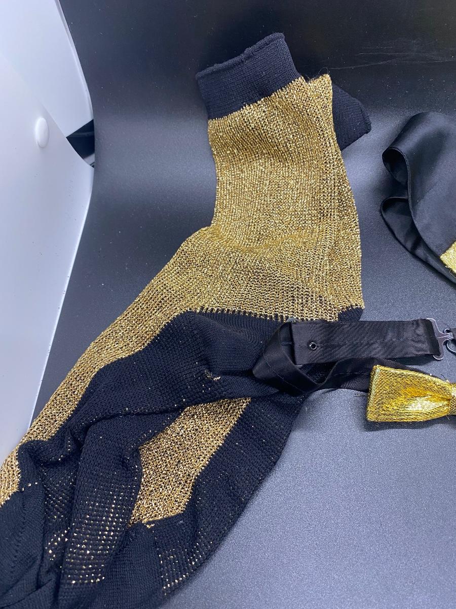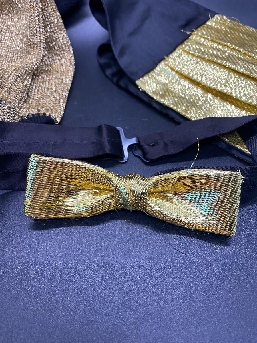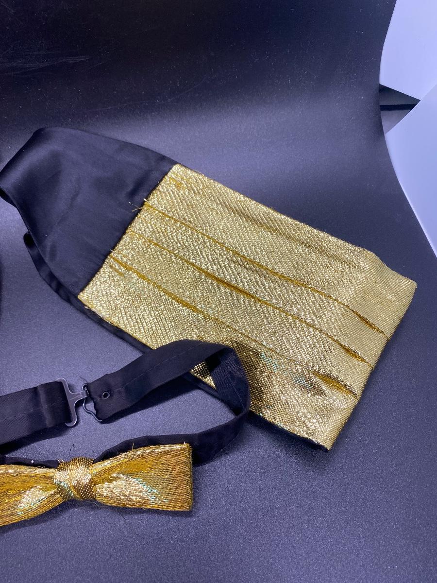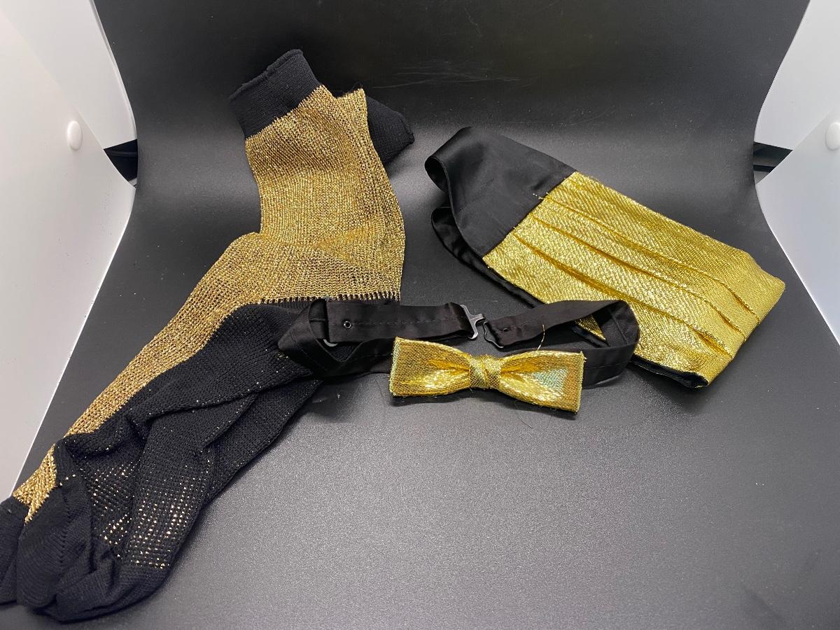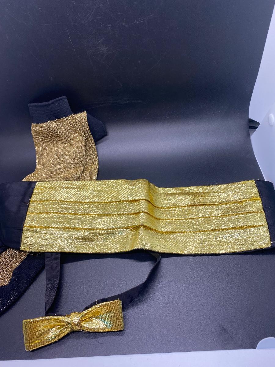 Three piece black and gold formal accessory set. Cummerbund, bow tie, and socks. Gold material is thin. Cummerbund doesn't have a size but it seems on the small size.