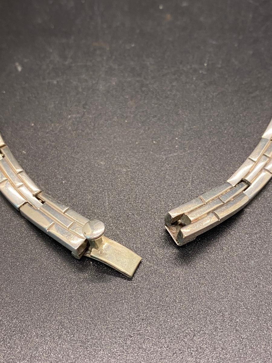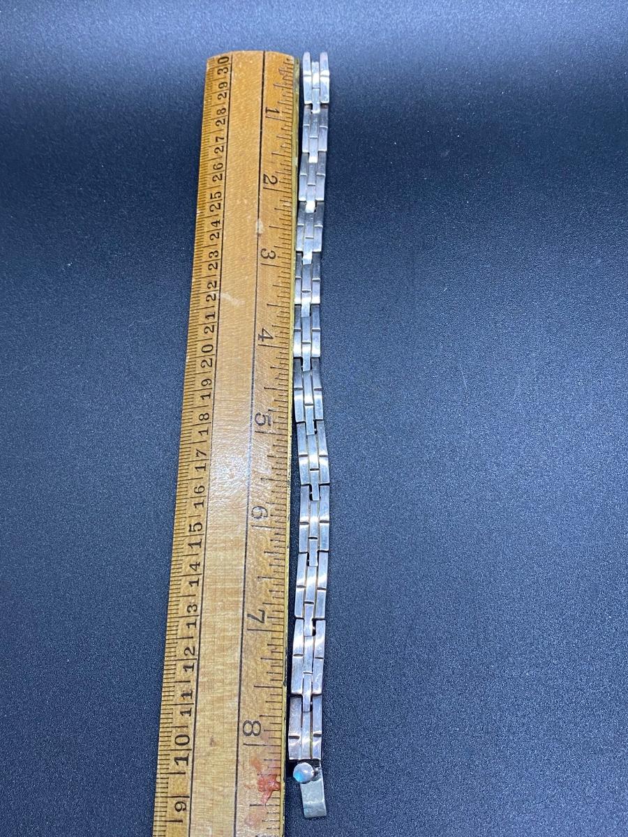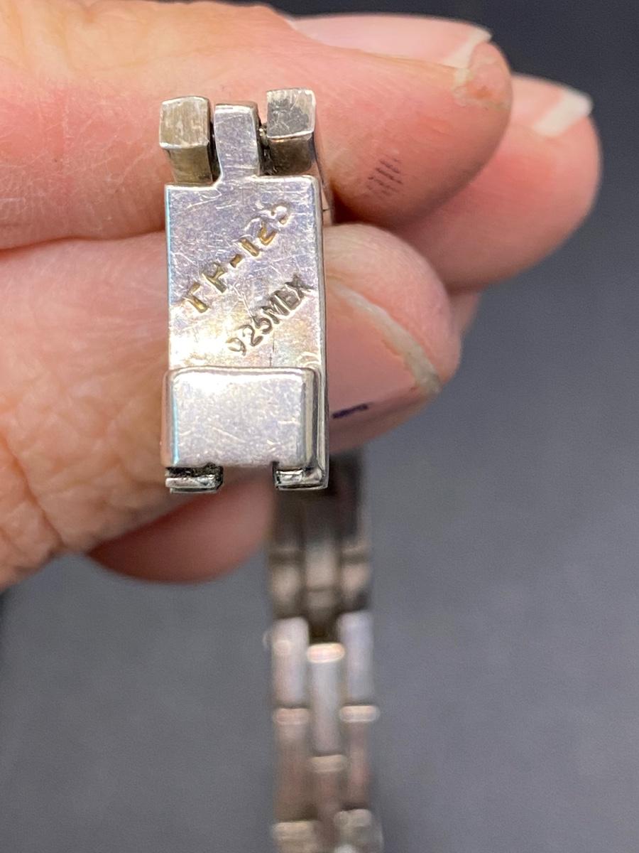 Matching sterling silver 925 bracelet and necklace set. Subway tile style link chain. Marked at the ends. Heavy. Necklace sits at about collar bone. Bracelet is 8". Total weight for both pieces is 147.3g. Made in Mexico.