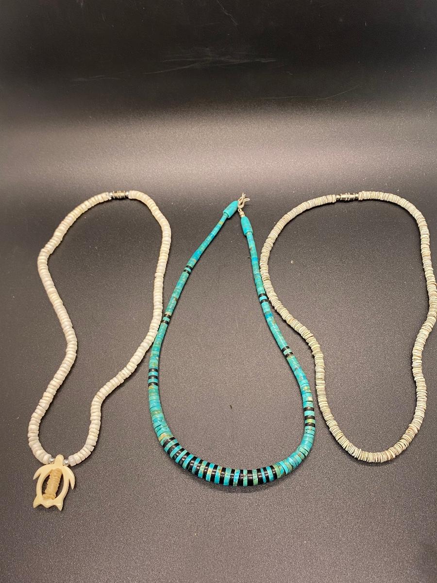 Set of 3 surf style pukka shell necklaces. One looks like turquoise and not shell. Good condition.