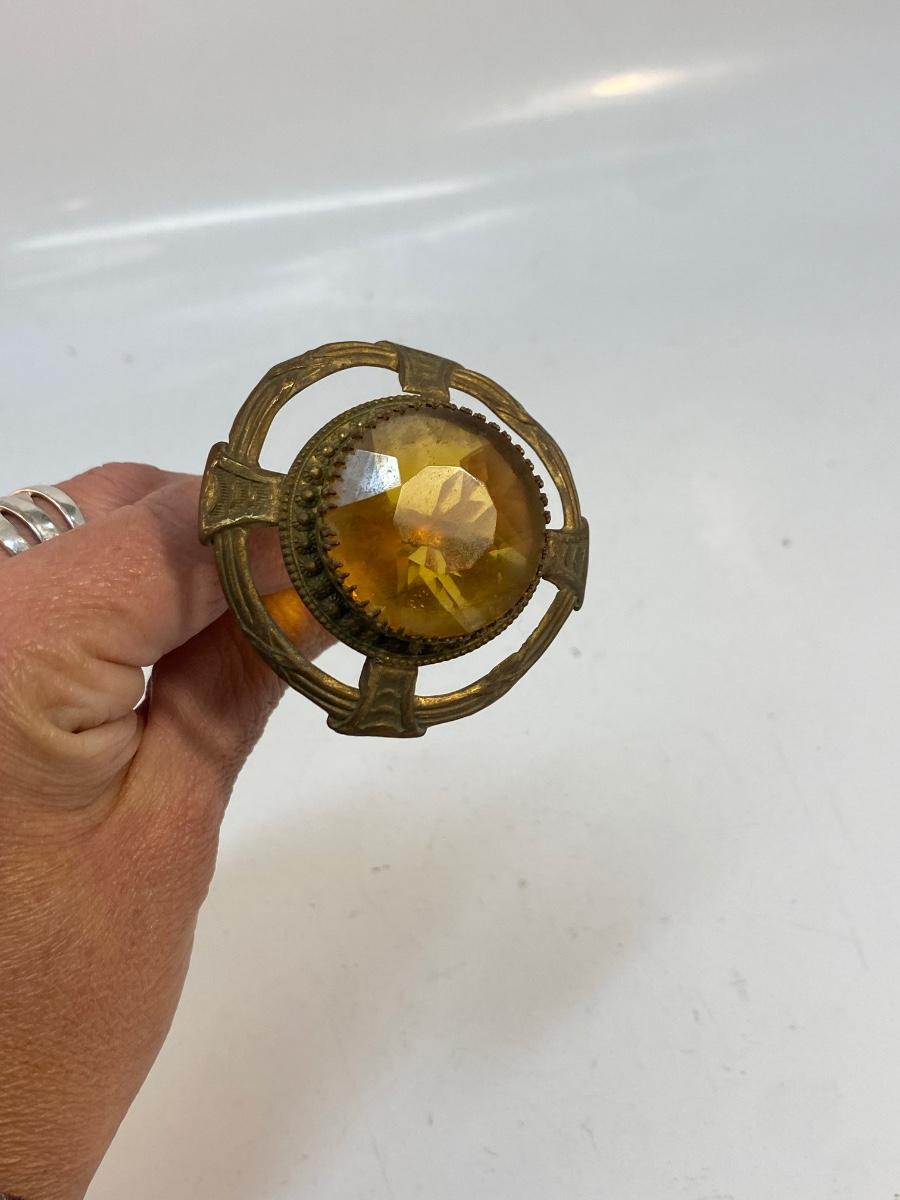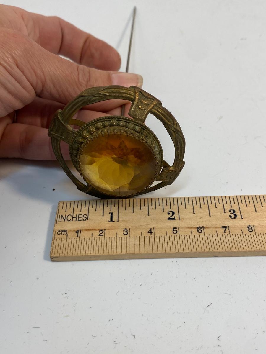 Antique Victorian Large Yellow Stone Medallion Hat Stick Pin. Large single golden yellow center stone in medallion. About 2" size. Some signs of age, needs to be cleaned.