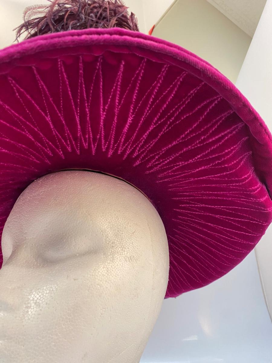 Vintage Victorian Wide Brim Fuchsia Velvet Hat with Feathers. In good vintage condition. Great stitch work detail on the underside of the brim. See photos.