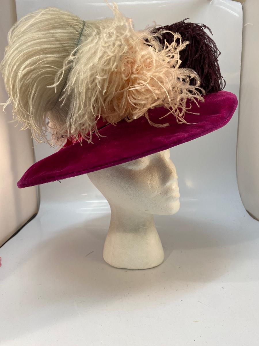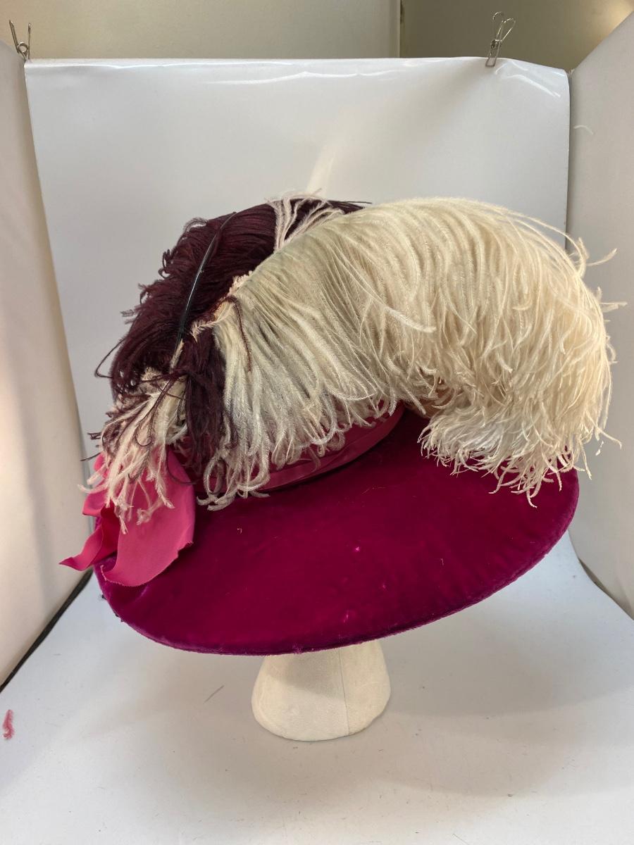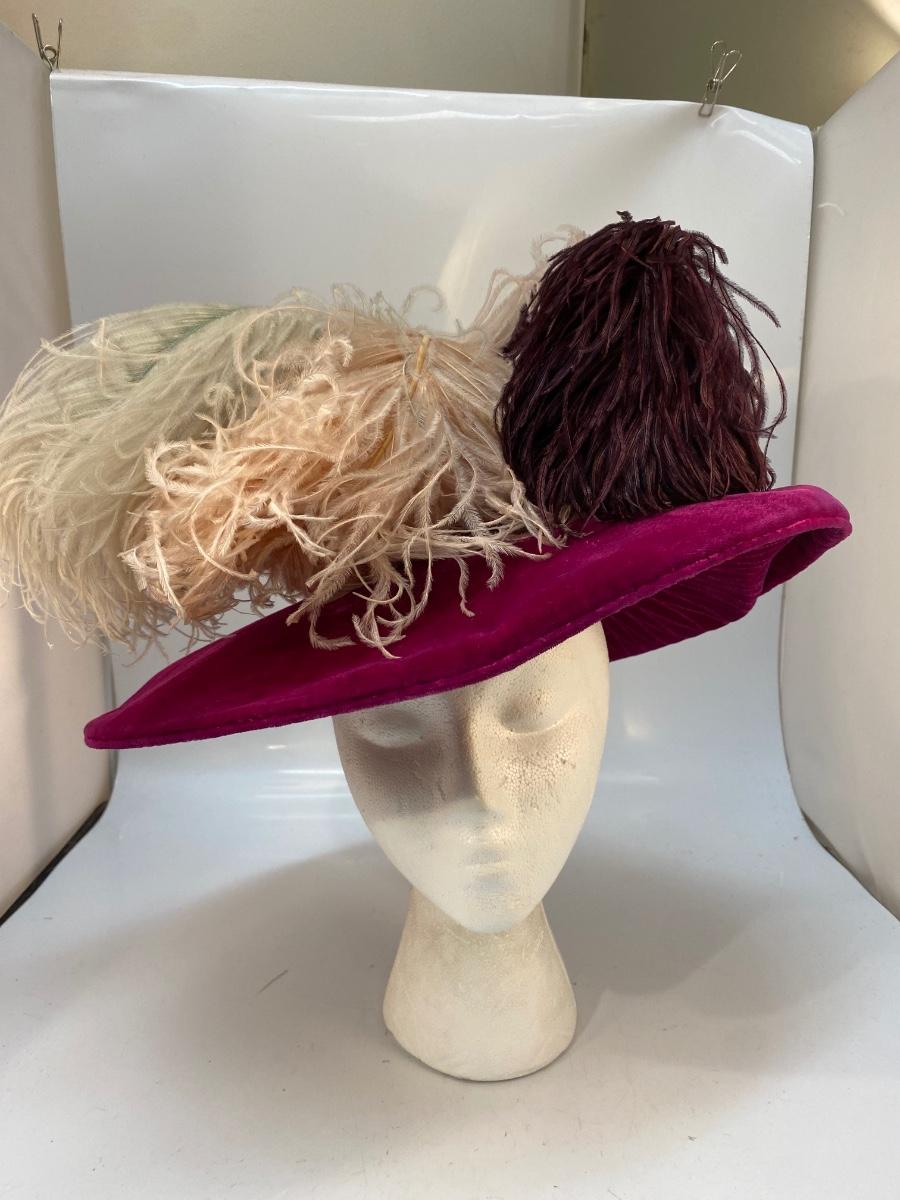 Vintage Victorian Wide Brim Fuchsia Velvet Hat with Feathers