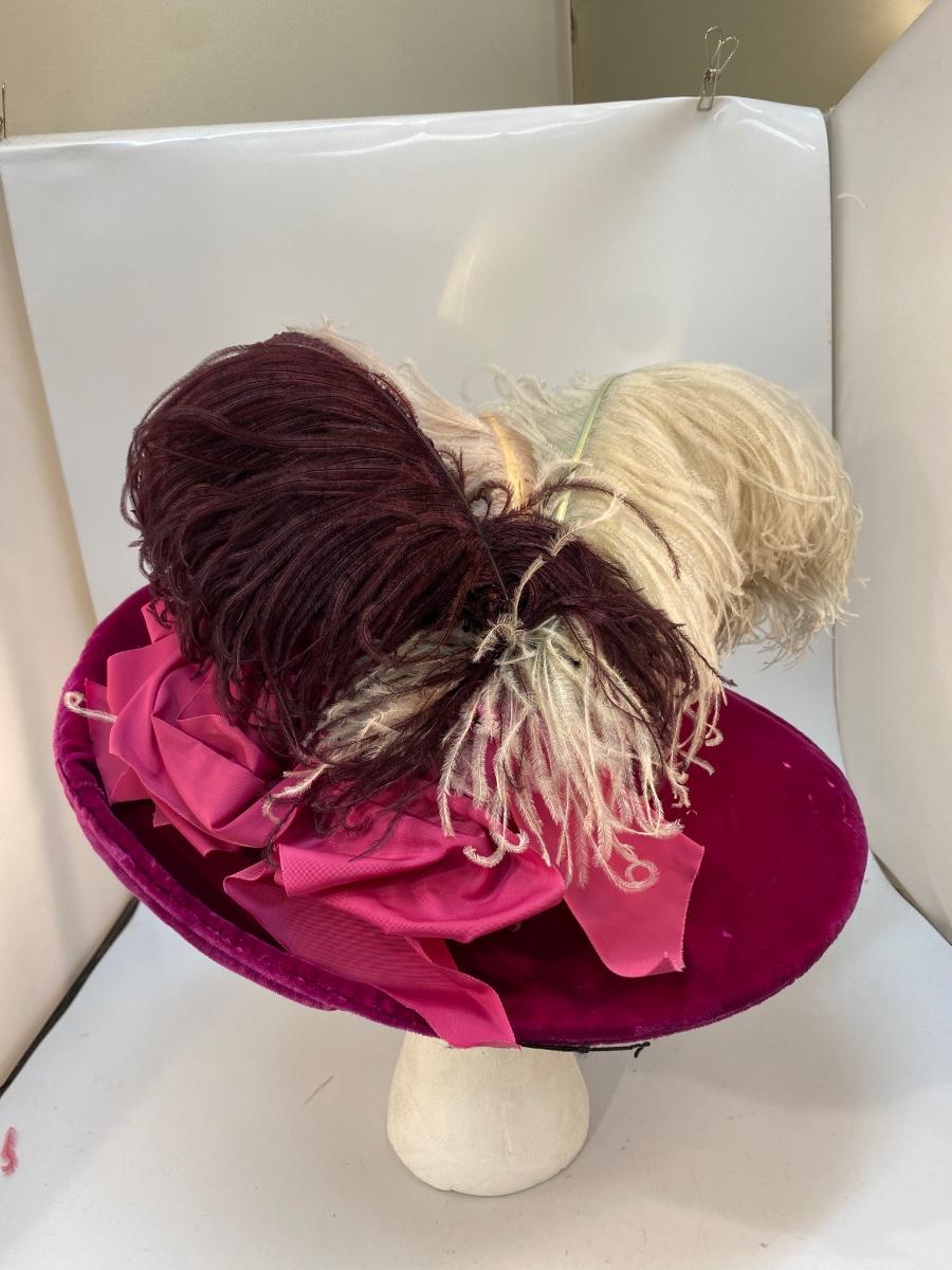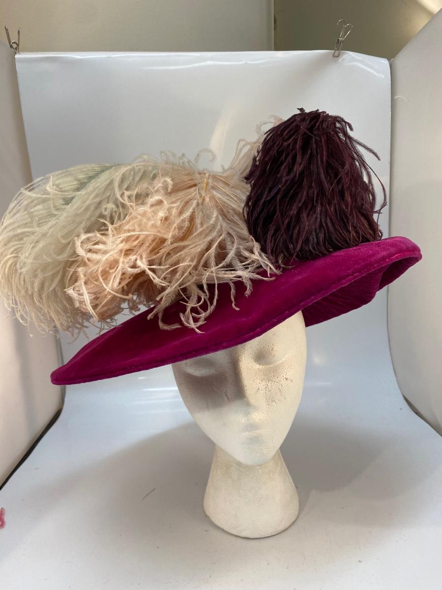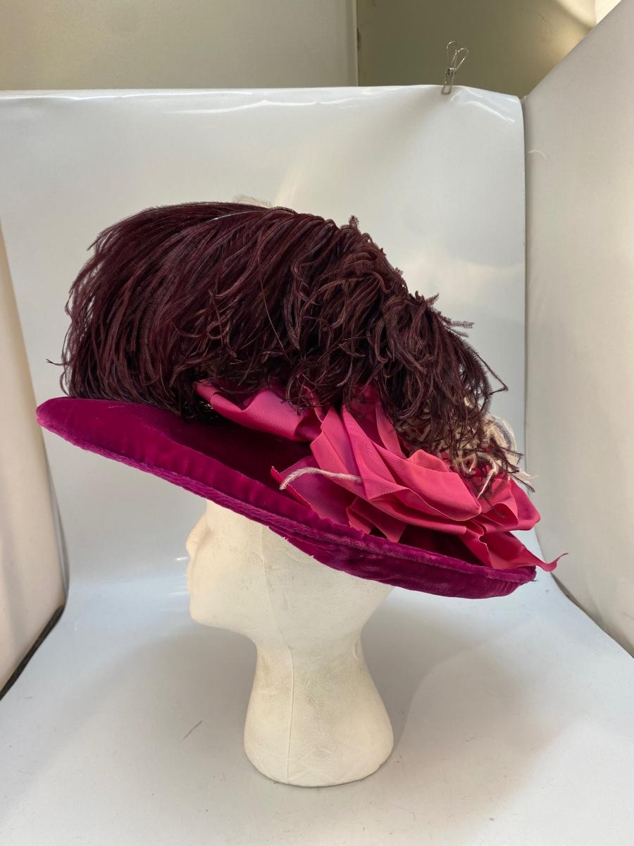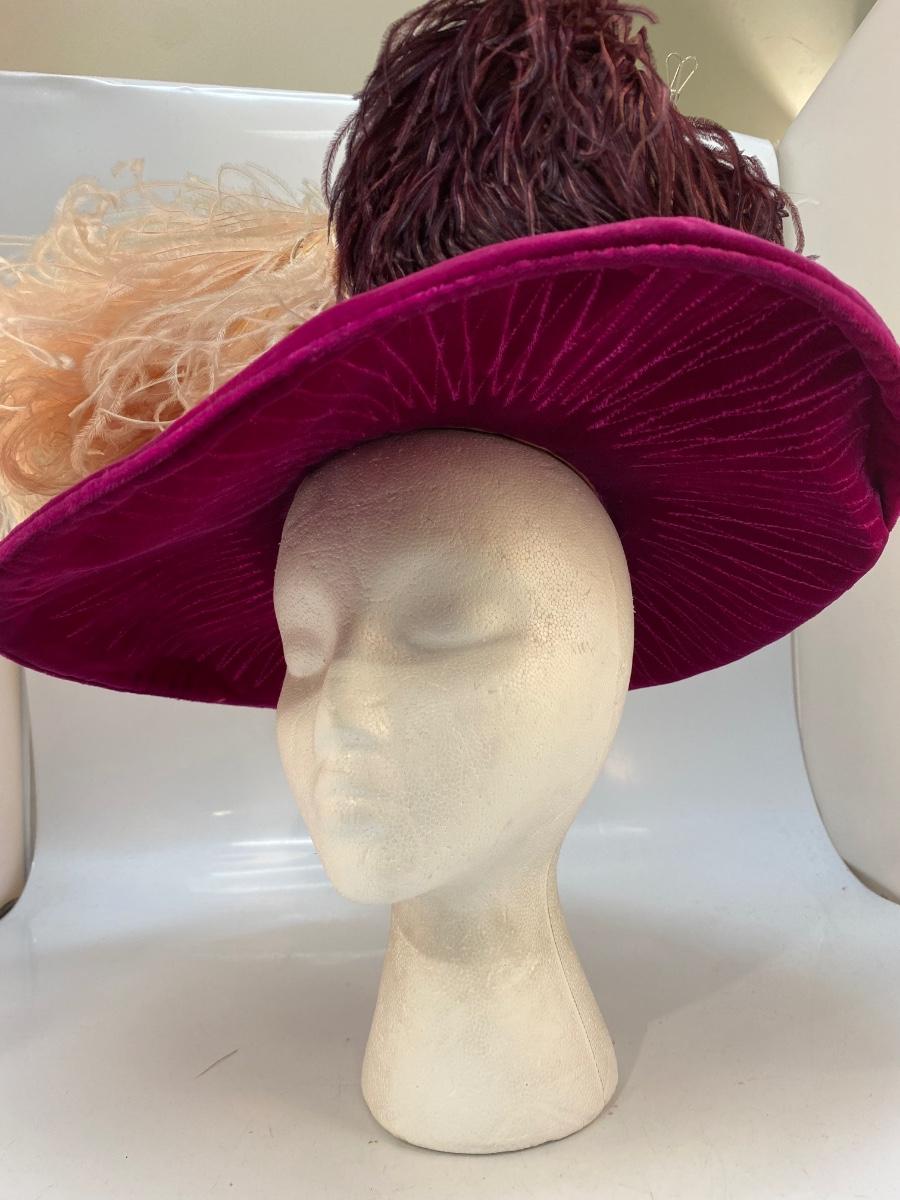 Vintage Victorian Wide Brim Fuchsia Velvet Hat with Feathers