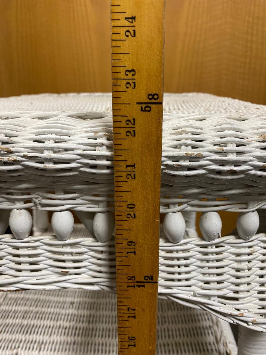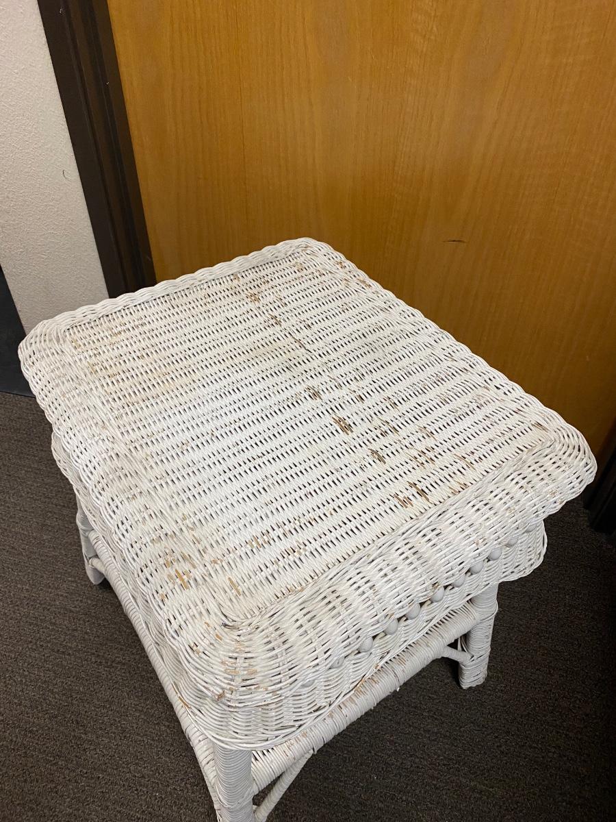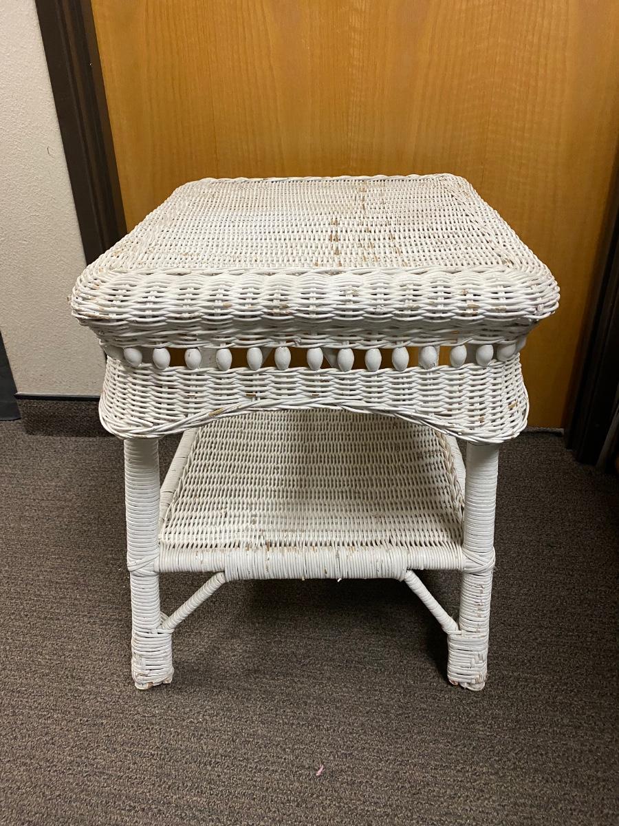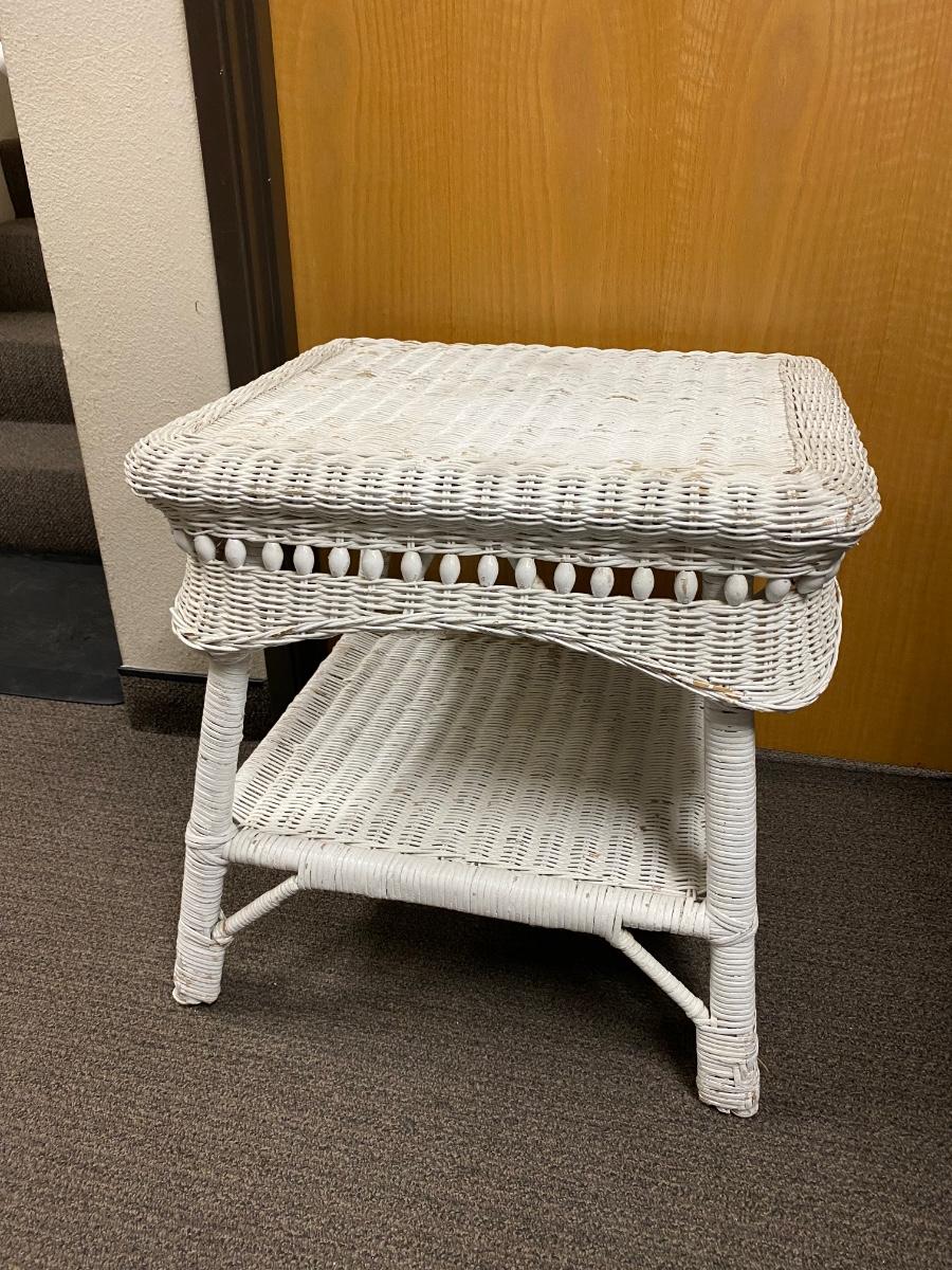 Vintage White Painted Wicker Square Side End Table. In good condition, sturdy. Some light wear to the painted surface, easily repaint as desired. About 22" tall, 22"x18" surface. Does have lower surface for storage as well.