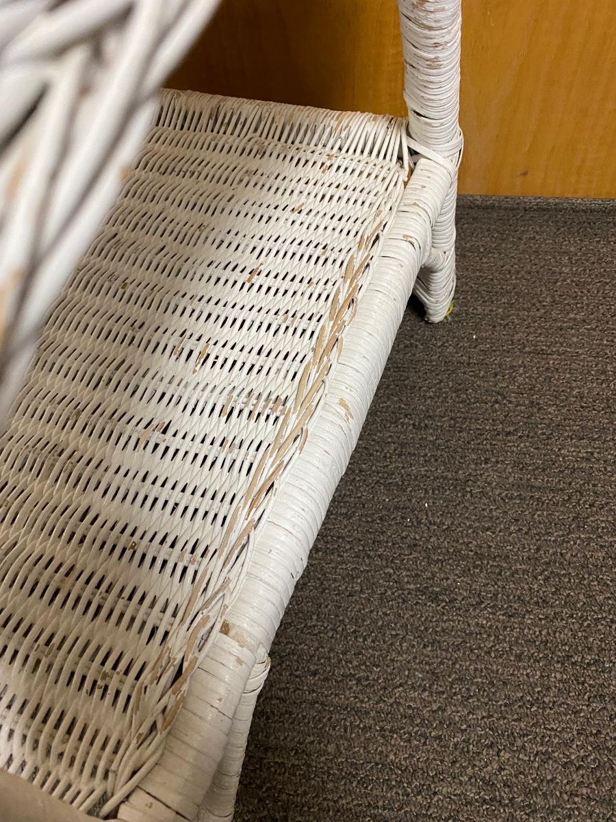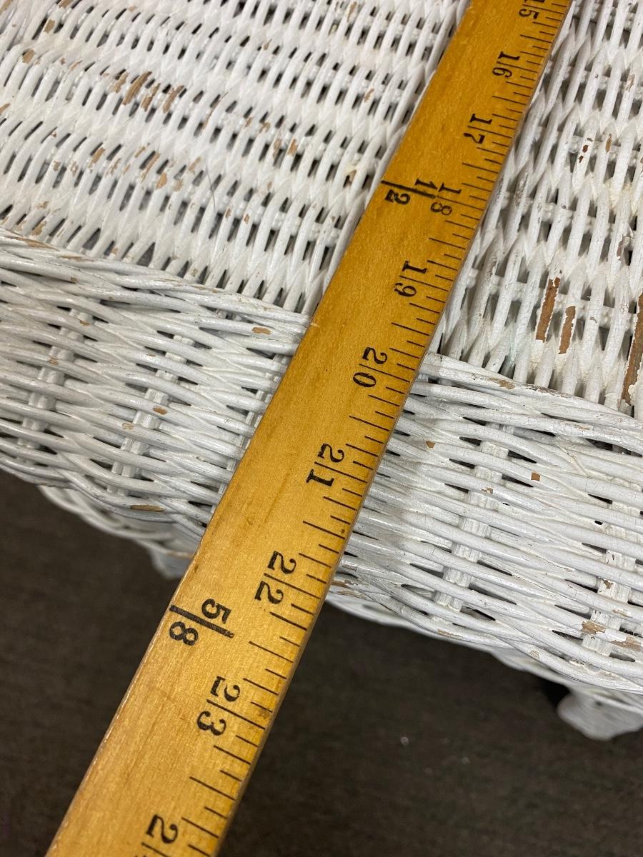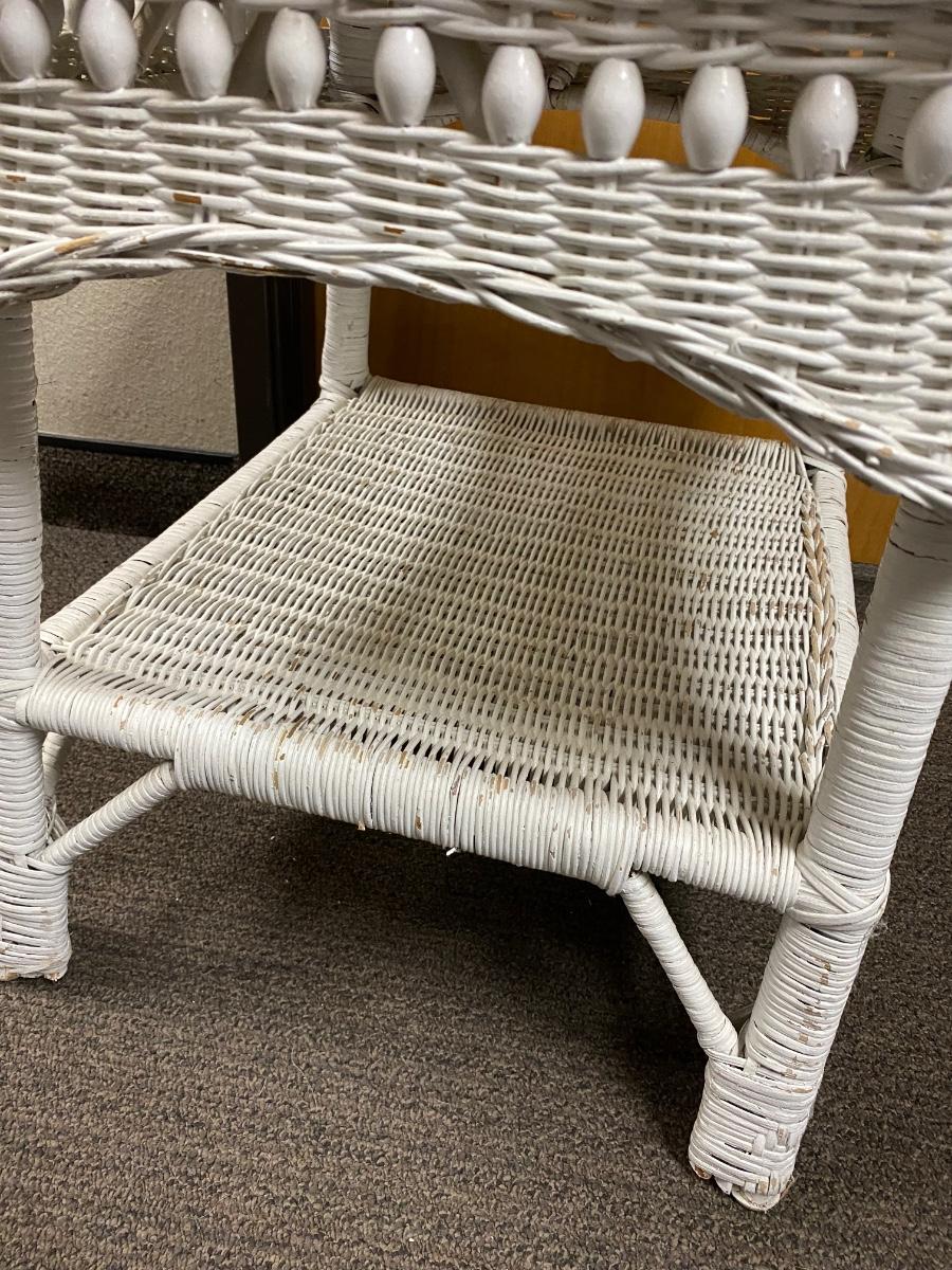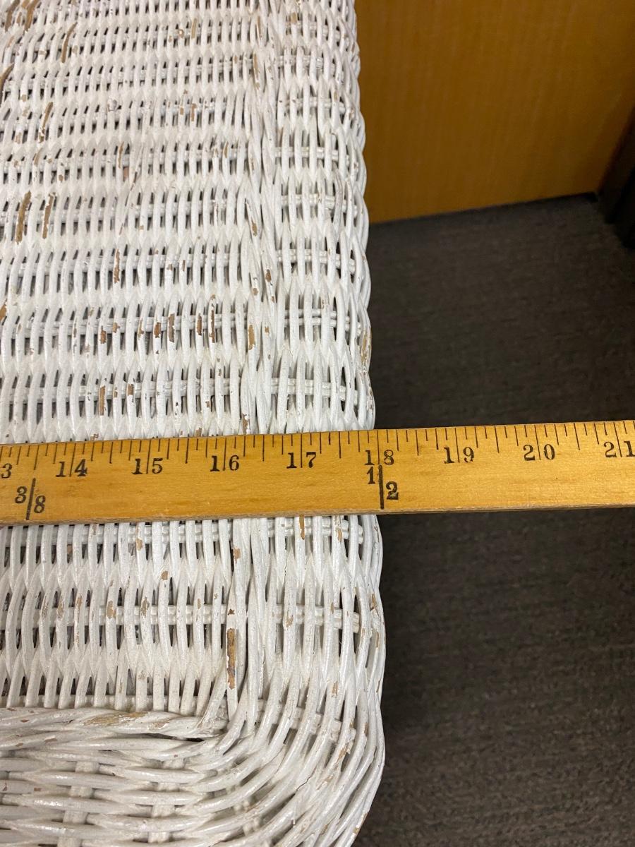 Vintage White Painted Wicker Square Side End Table. In good condition, sturdy. Some light wear to the painted surface, easily repaint as desired. About 22" tall, 22"x18" surface. Does have lower surface for storage as well.