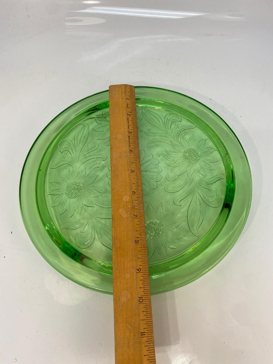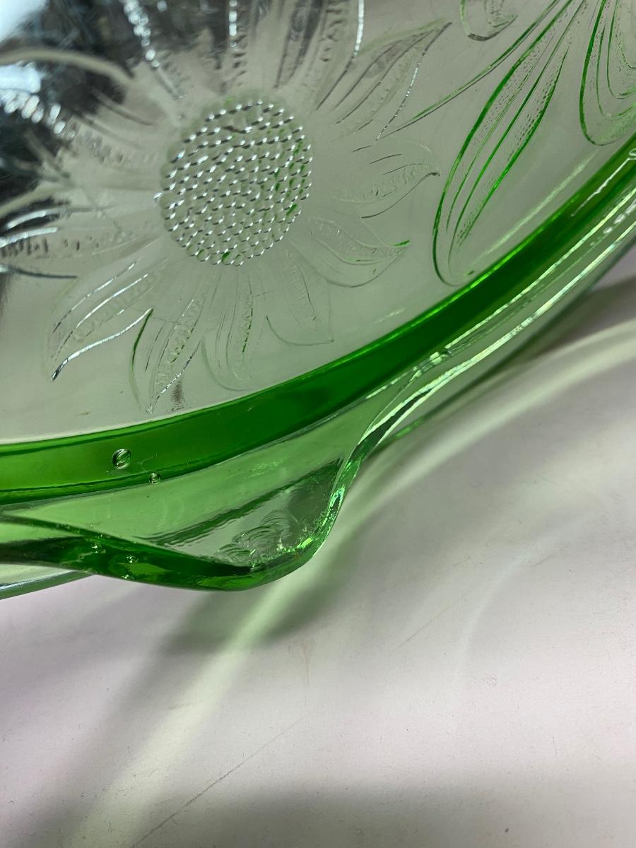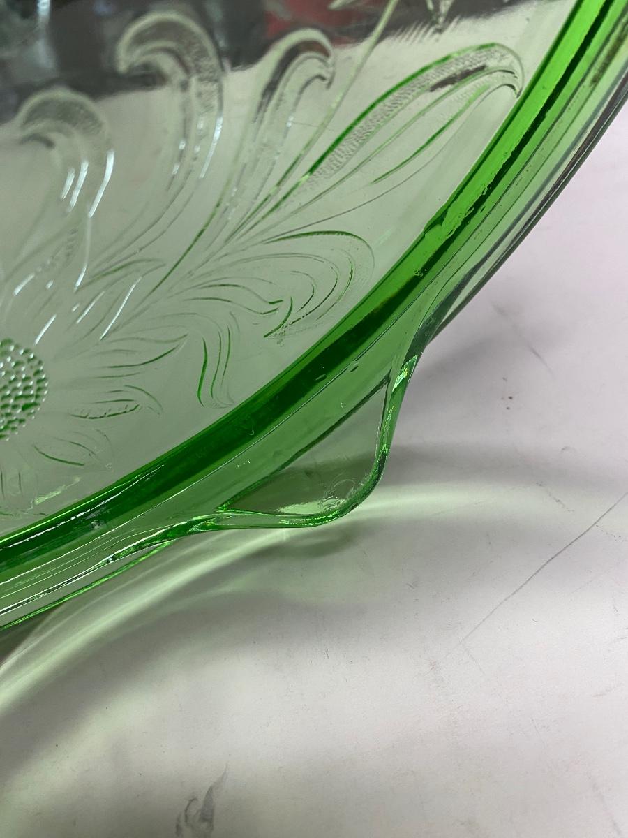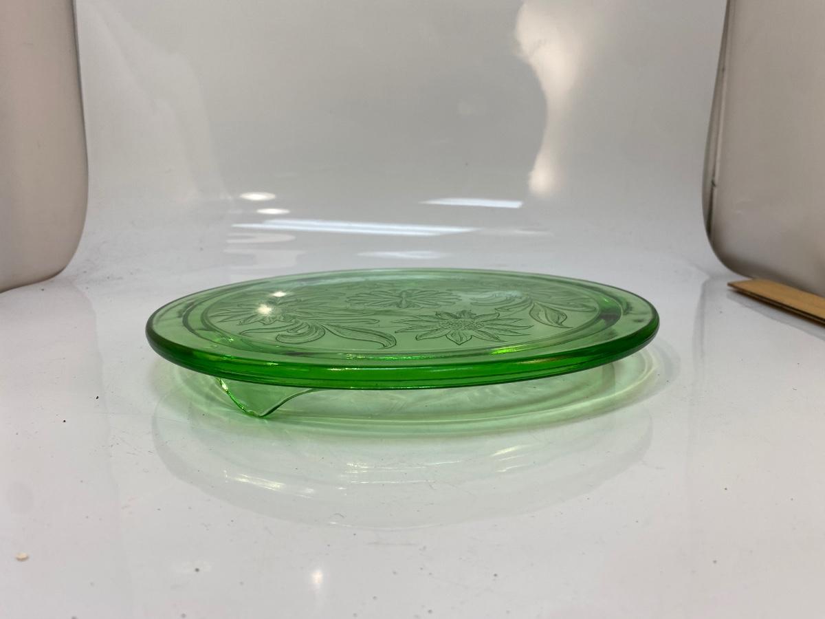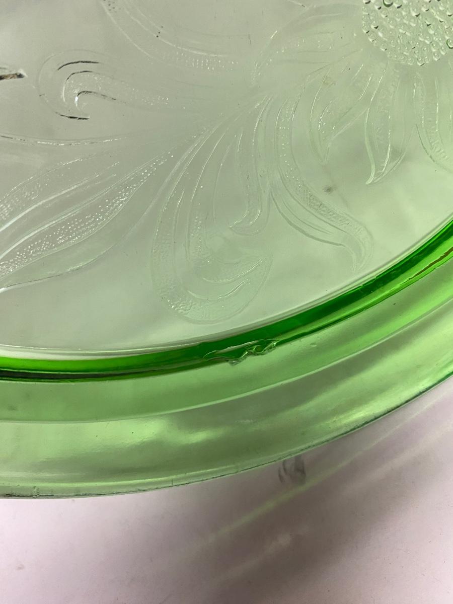 Vintage Green Vaseline Uranium Glass Flower Pattern Footed Cake Plate. Glows nicely. There are utensil scratches to the surface and did find small chipping on all three feet but displays nice and is useable. 10" diameter.
