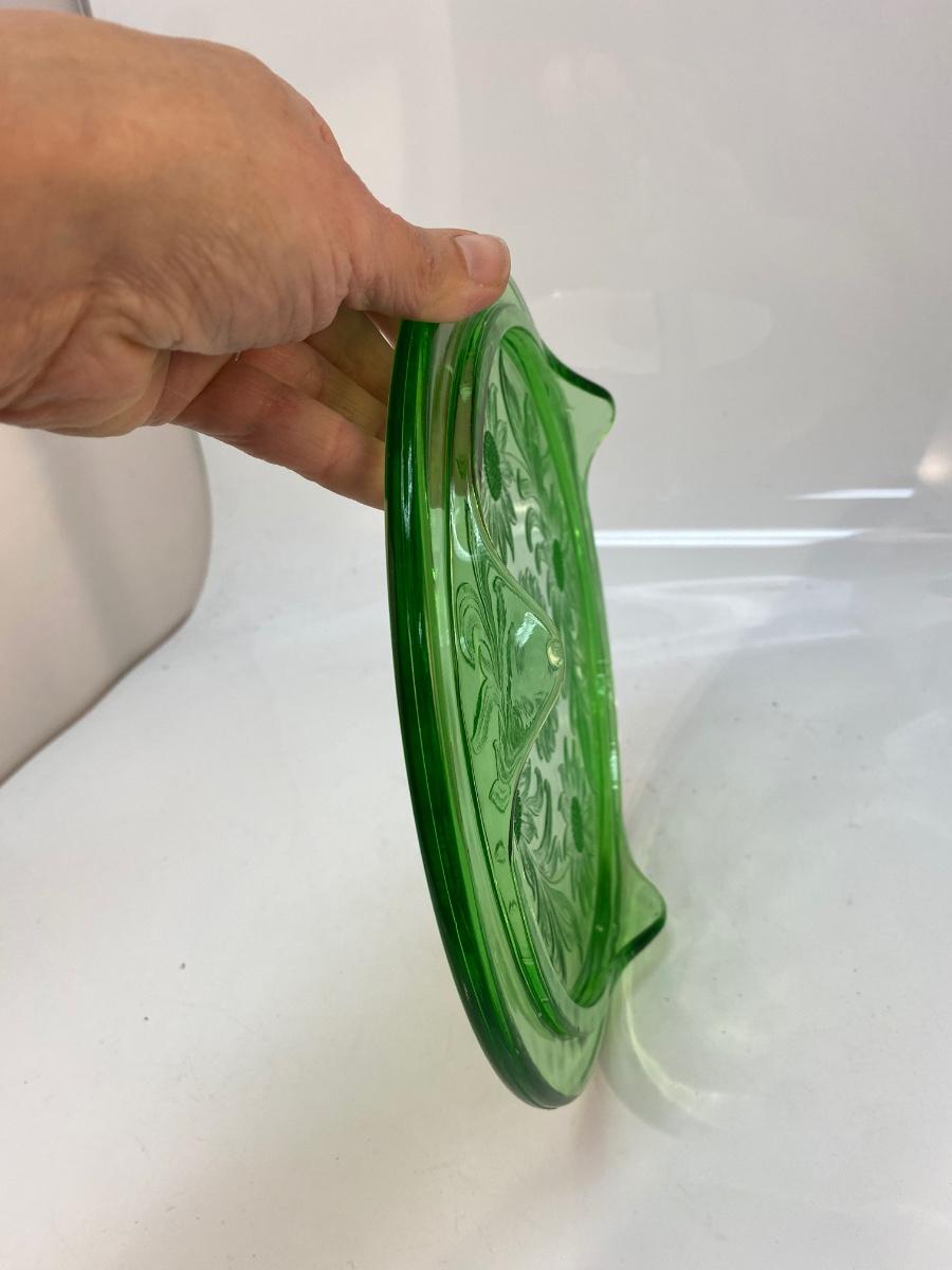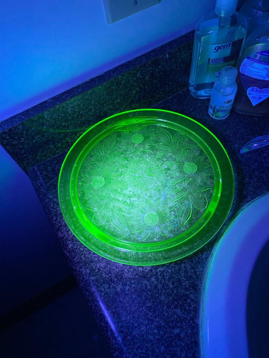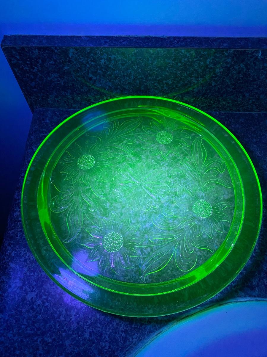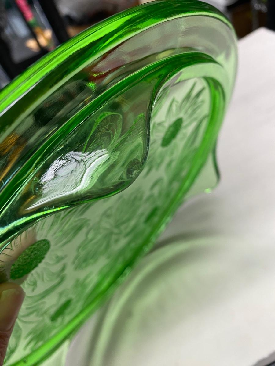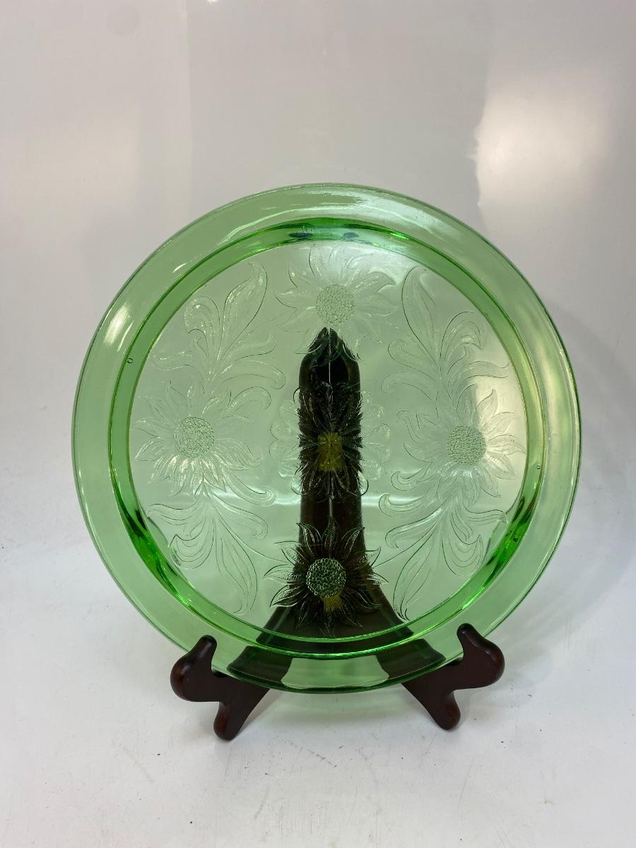 Vintage Green Vaseline Uranium Glass Flower Pattern Footed Cake Plate. Glows nicely. There are utensil scratches to the surface and did find small chipping on all three feet but displays nice and is useable. 10" diameter.