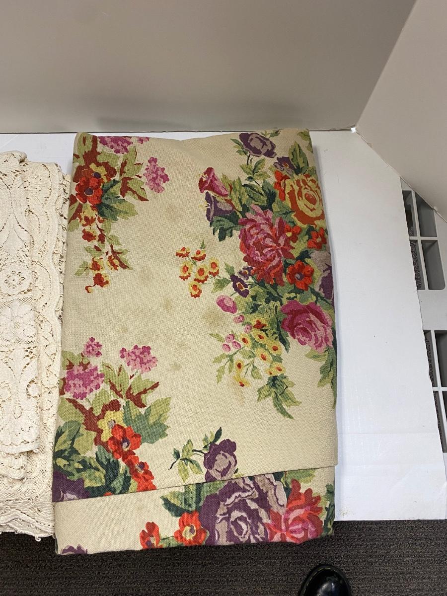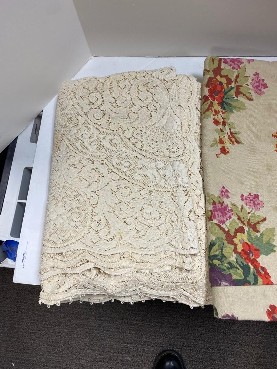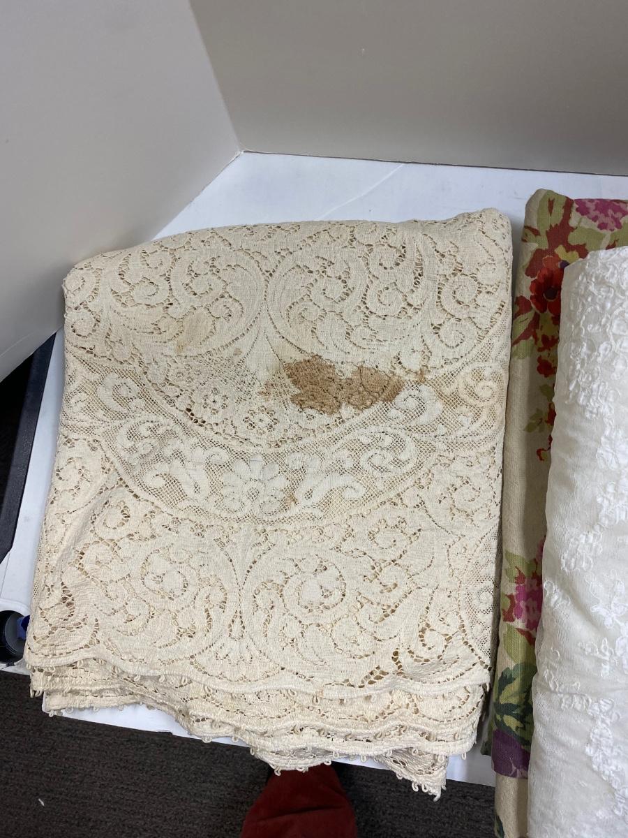 Lot of 3 Large Tablecloths Lace and Floral. Large size, have spots and stains, good for repurposing.