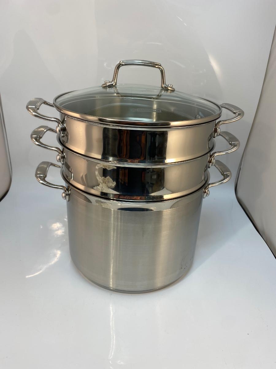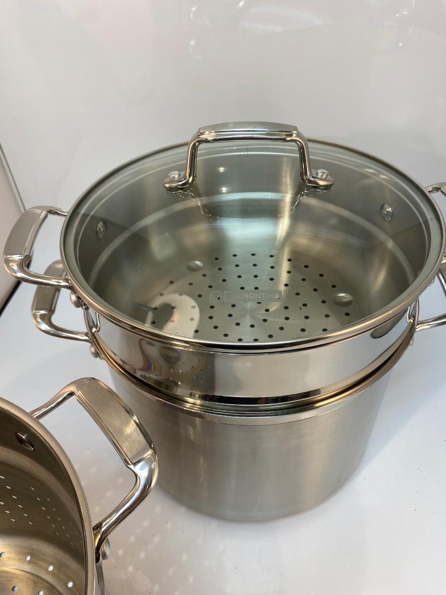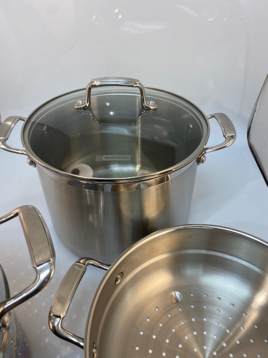 Tramontina Premium Stainless Steel Stock Pot with Steamer & Colander Inserts. In good used condition. Has original box included.