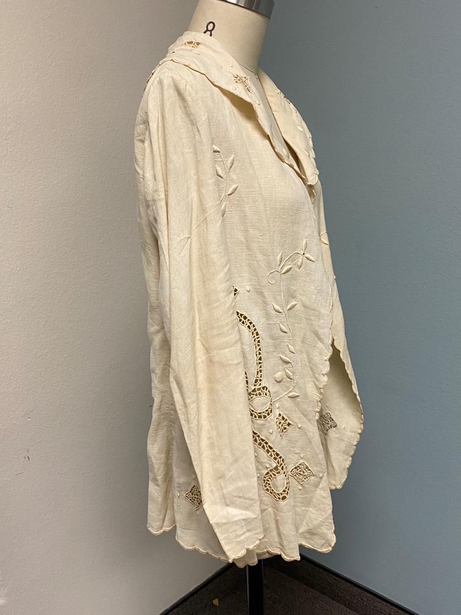 Vintage Antique Victorian Ecru Embroidered Lace Work Coat Blouse. Beautiful open lace work and floral embroidery. No closure but one could be added. No major spots or stains but may have discoloration from age.