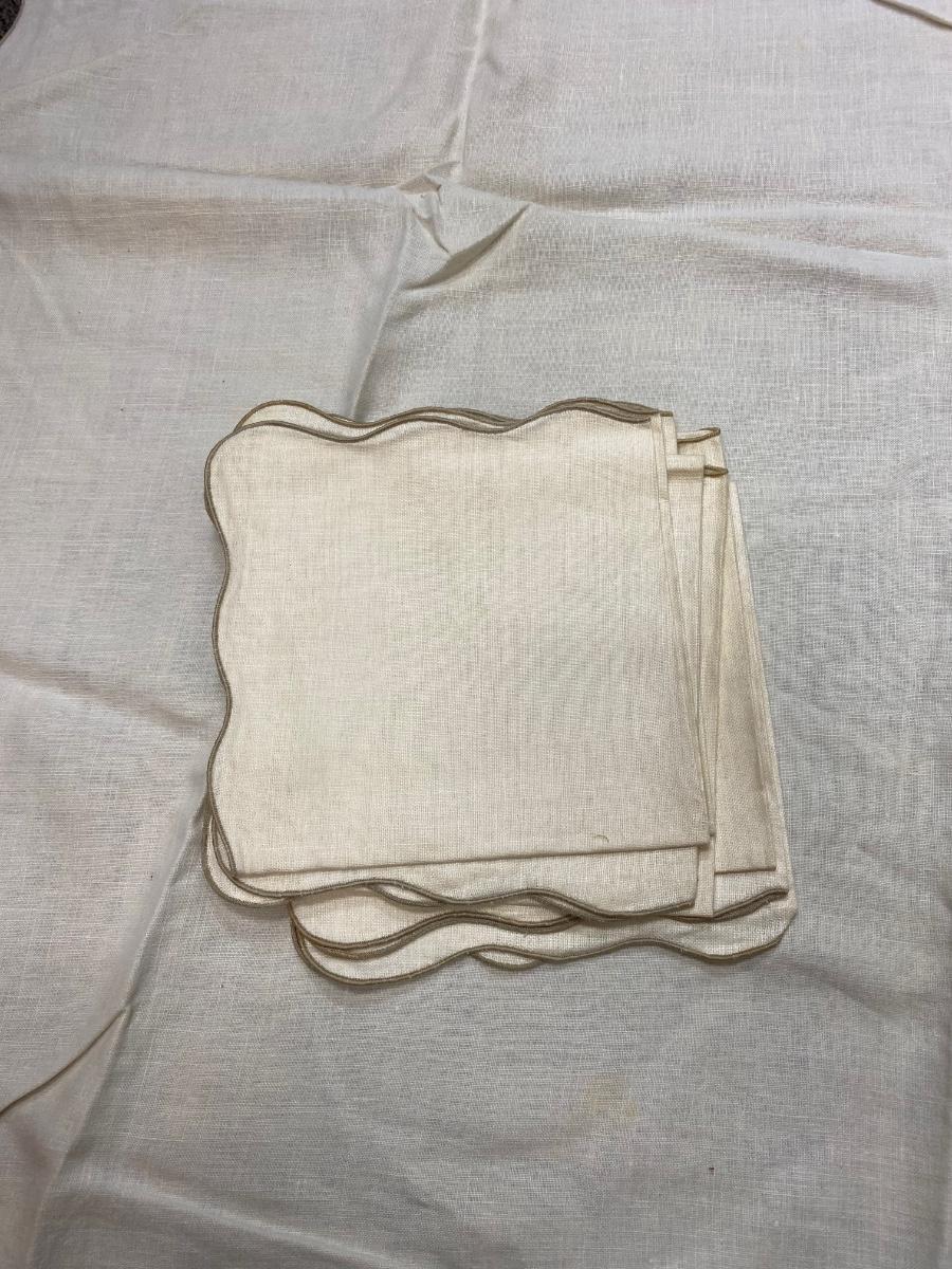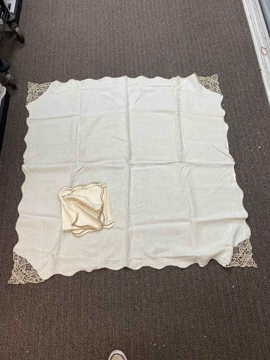 Vintage Off White Lace Corner Tablecloth with Matching Napkins. Some light spots and discoloration. About card table size.
