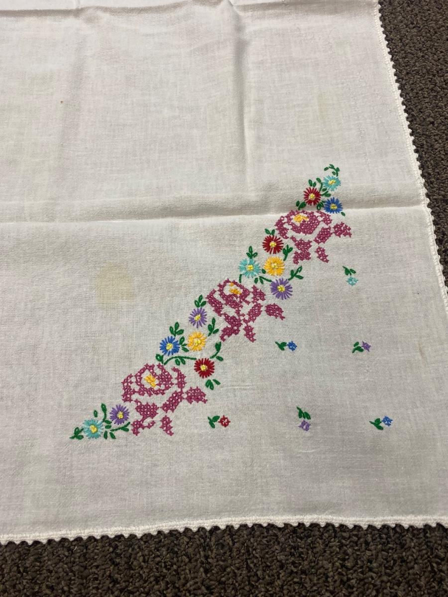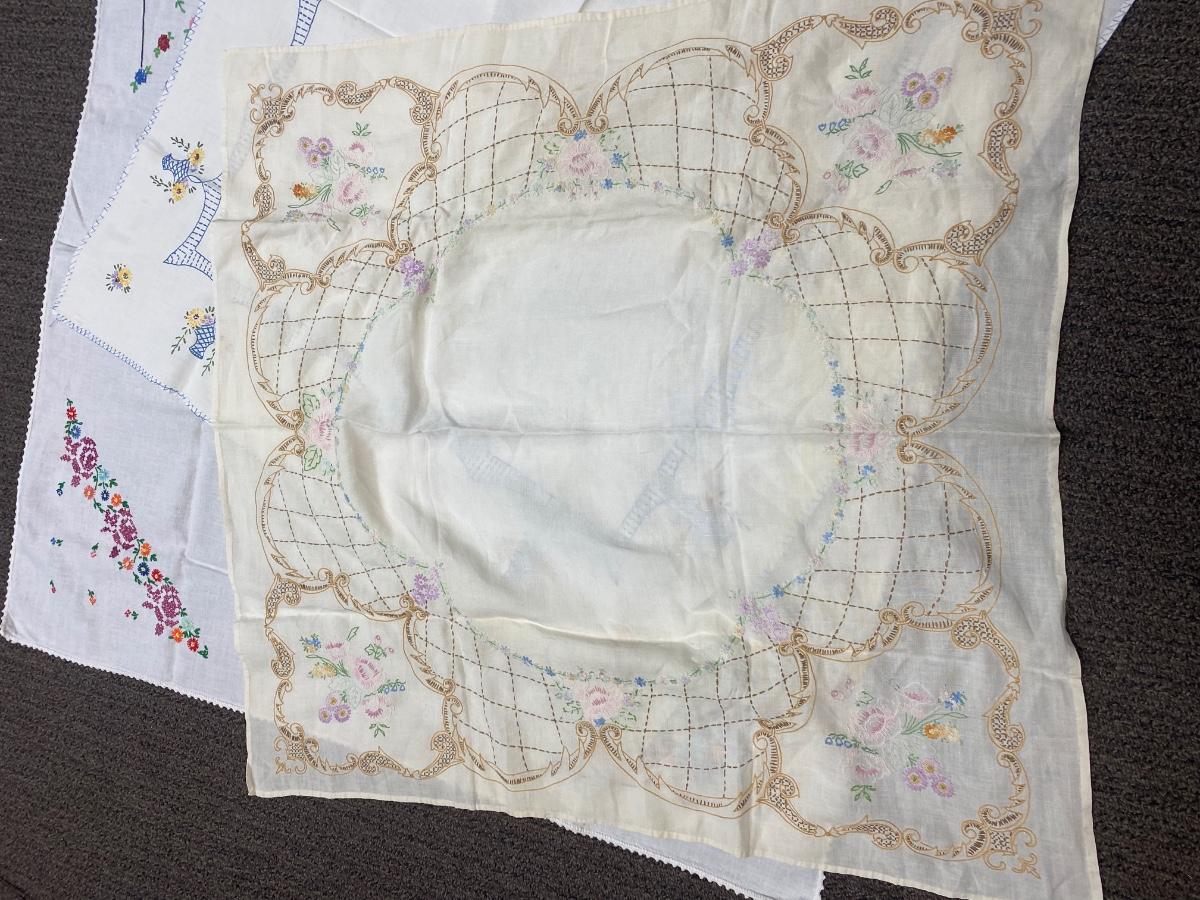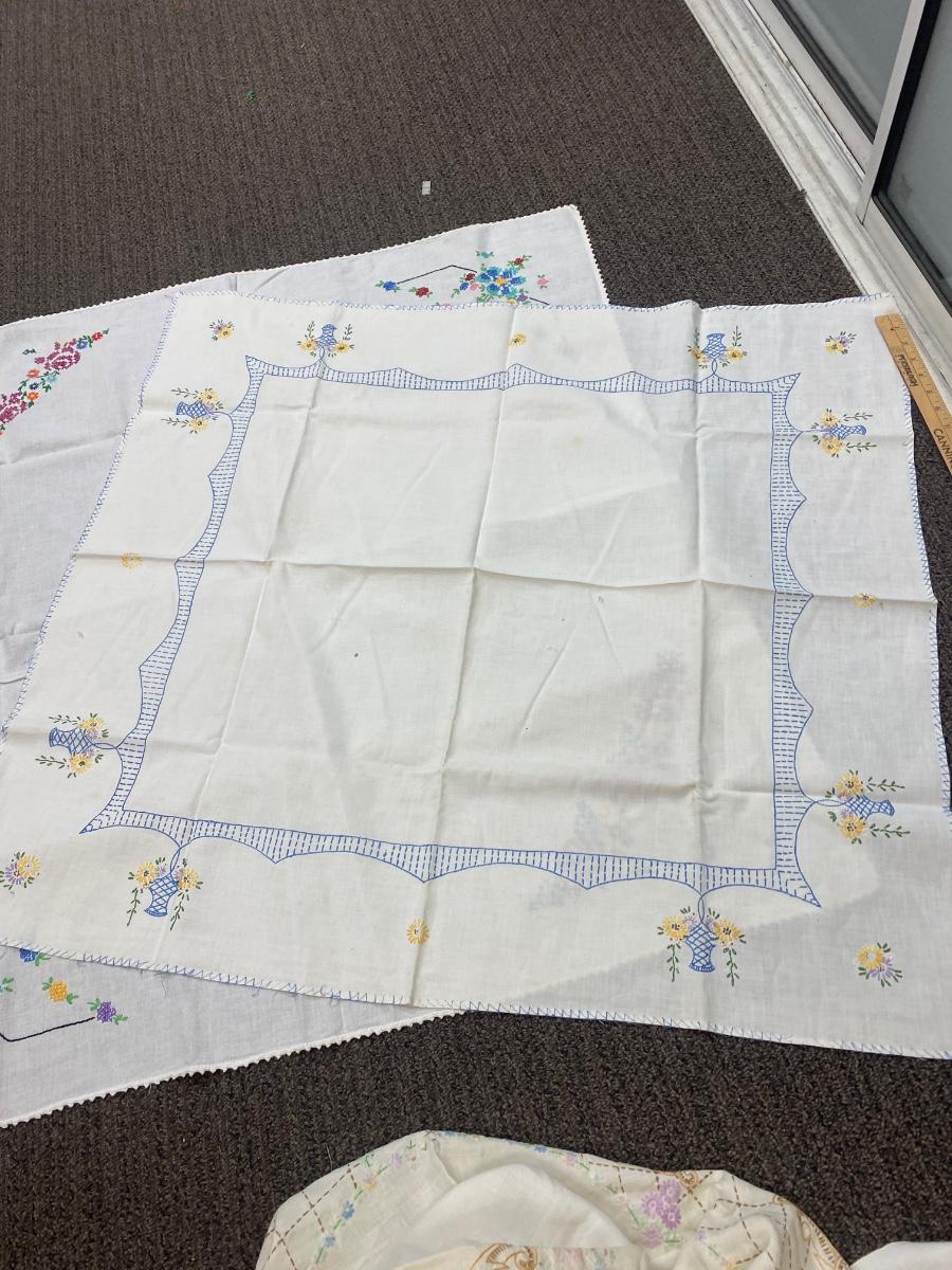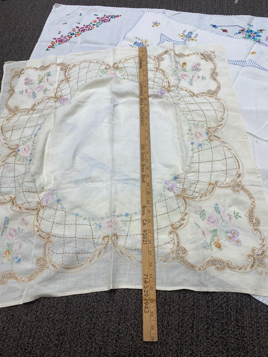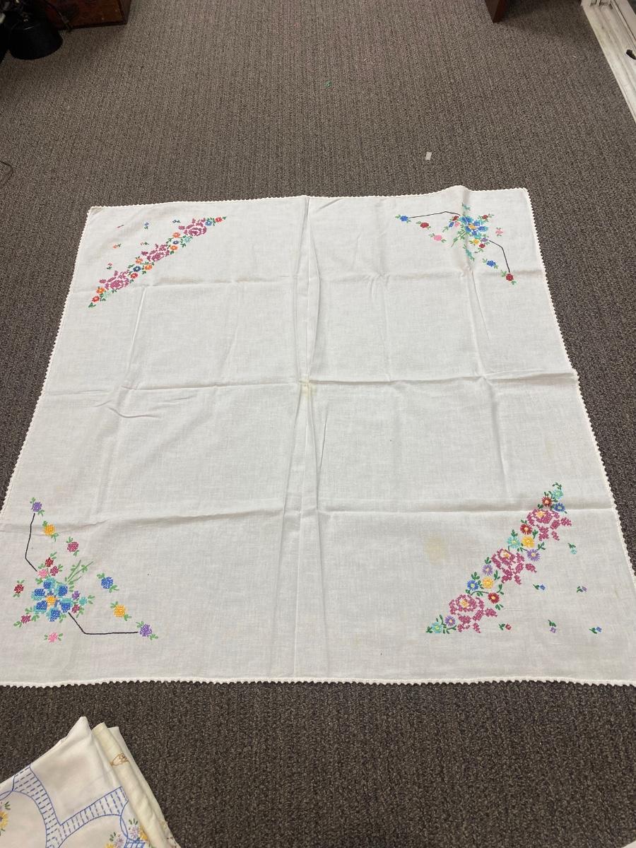 Lot of Three Vintage Embroidered Small Square Tablecloth Card Table Covering. In vintage condition. Some discolor and a couple small holes found but in overall useable condition. Small about 3' size.