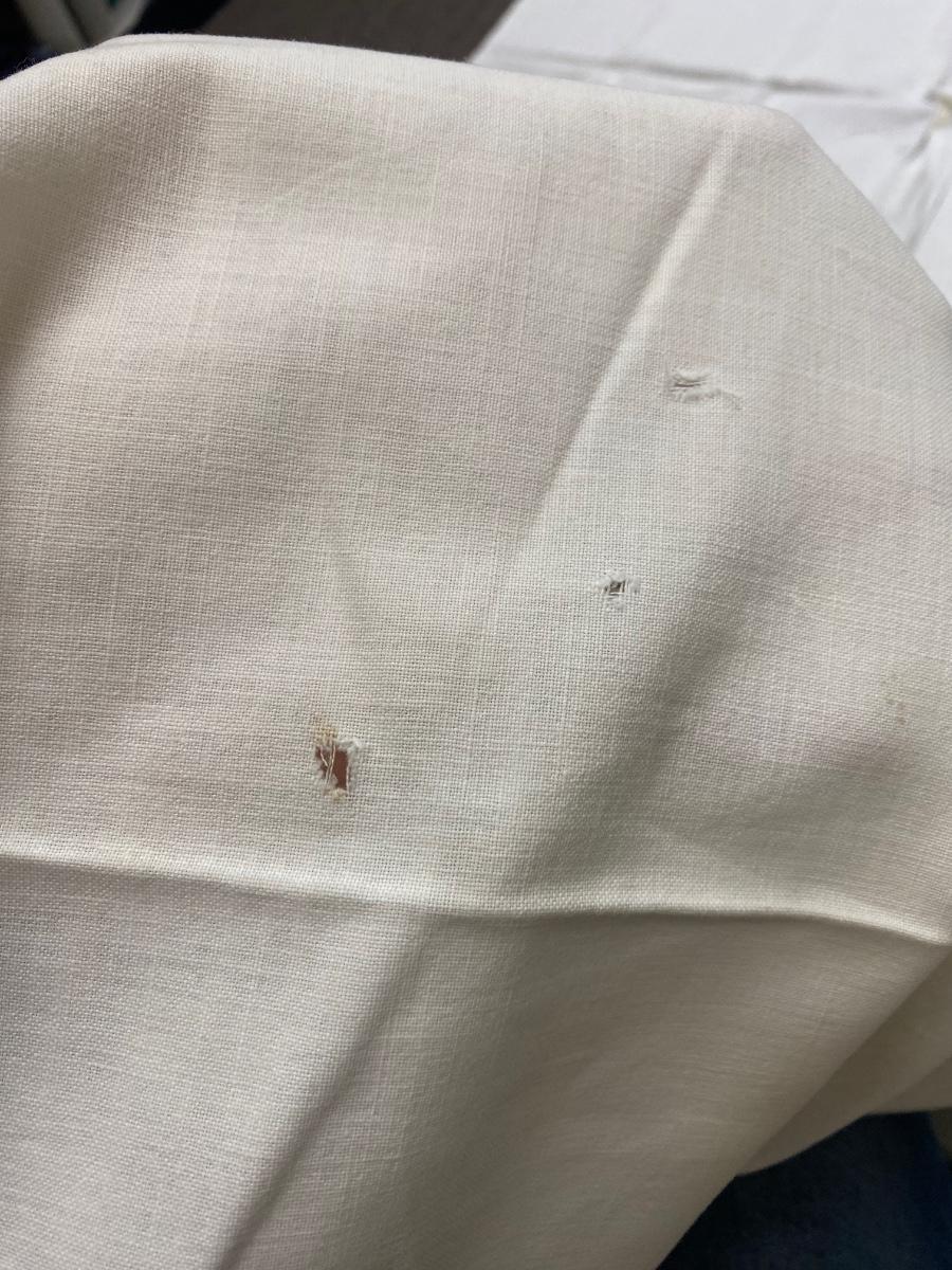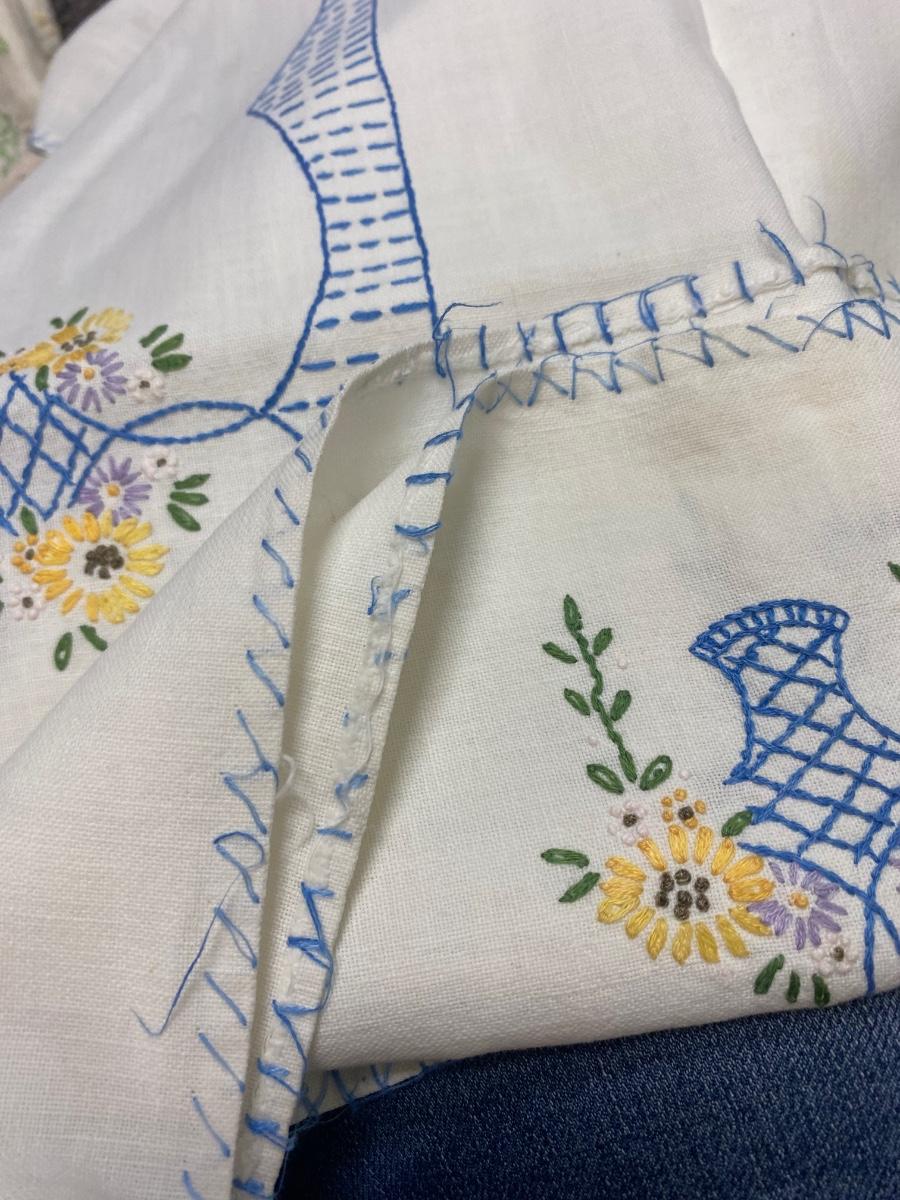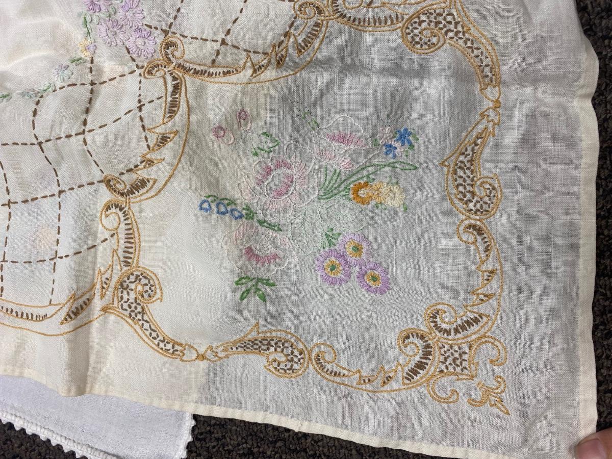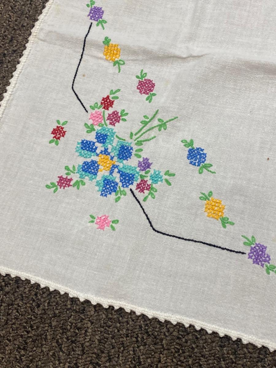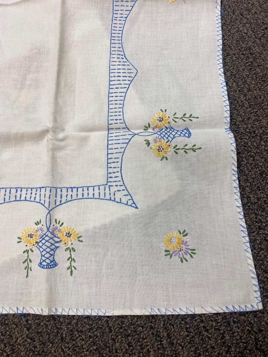 Lot of Three Vintage Embroidered Small Square Tablecloth Card Table Covering. In vintage condition. Some discolor and a couple small holes found but in overall useable condition. Small about 3' size.