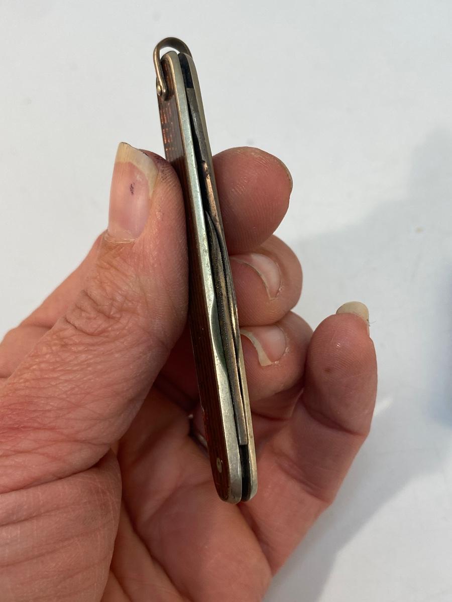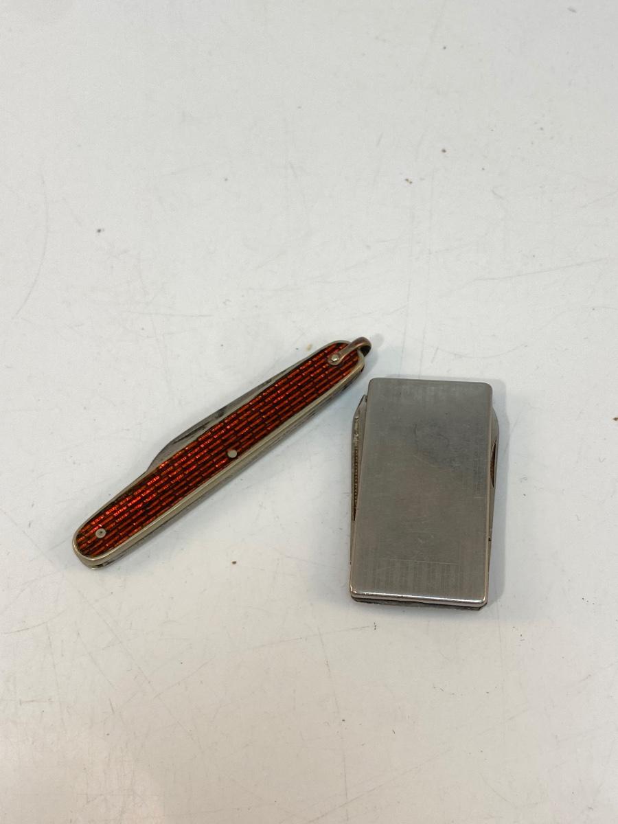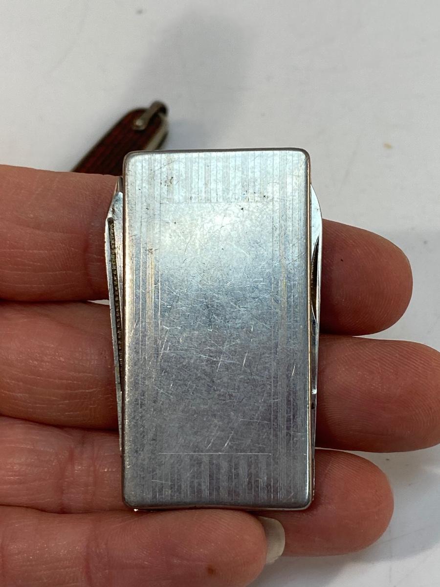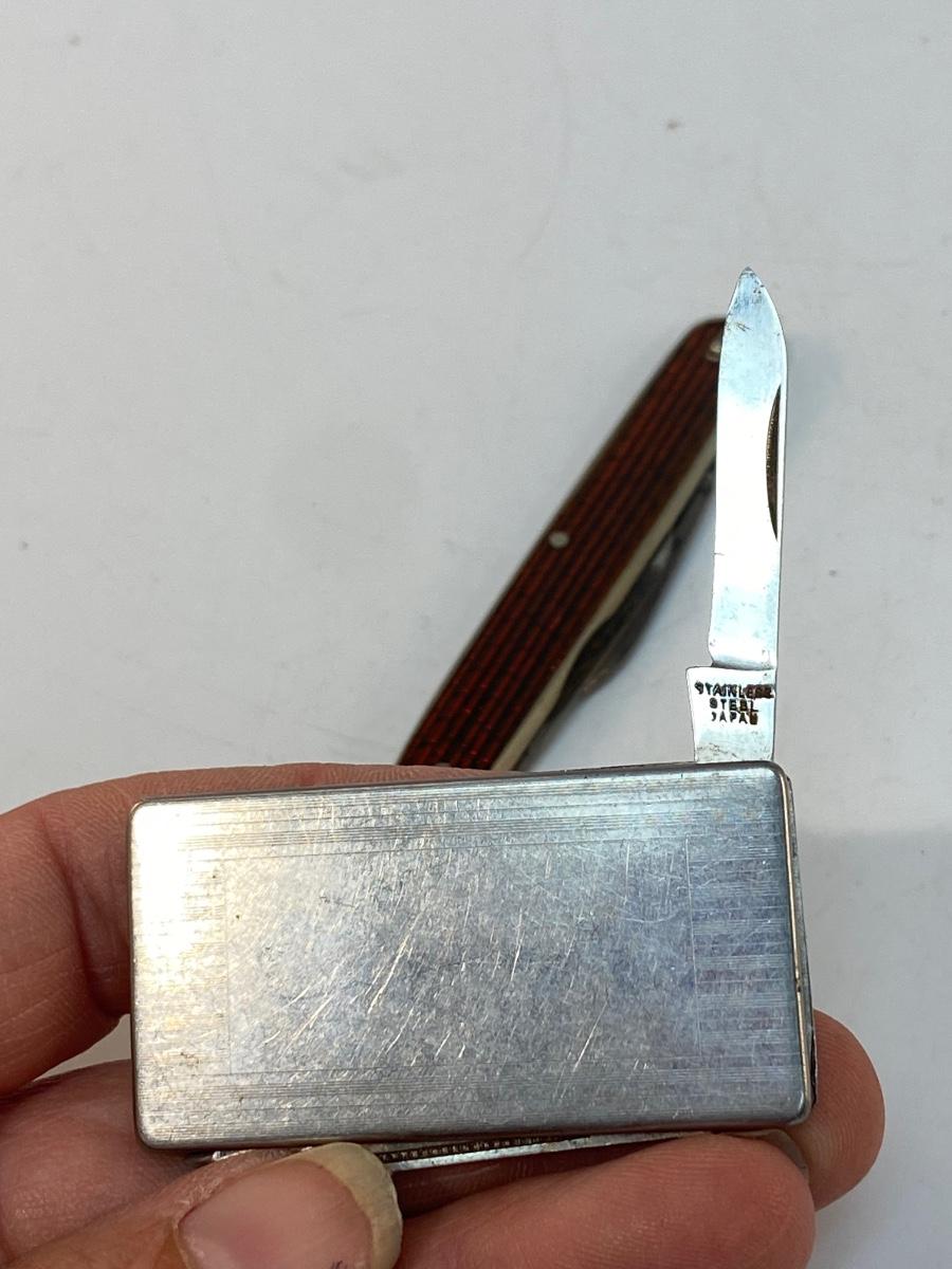 Vintage Money Clip Knife Combo and Regular Holographic Pocket Knife. Both are in vintage condition with light signs from daily use. Each has two blades but could only get a single blade on each to open. May need a little cleaning and oil to open stuck blades.