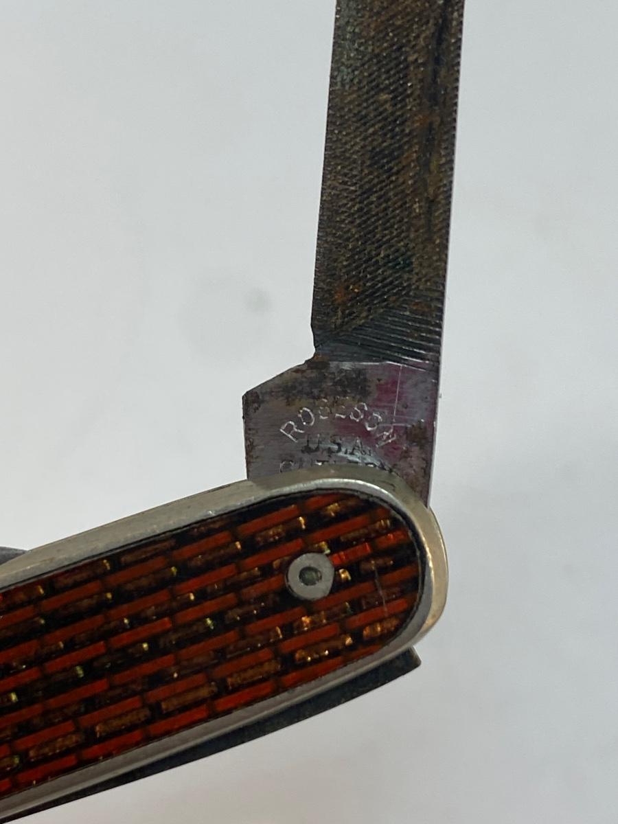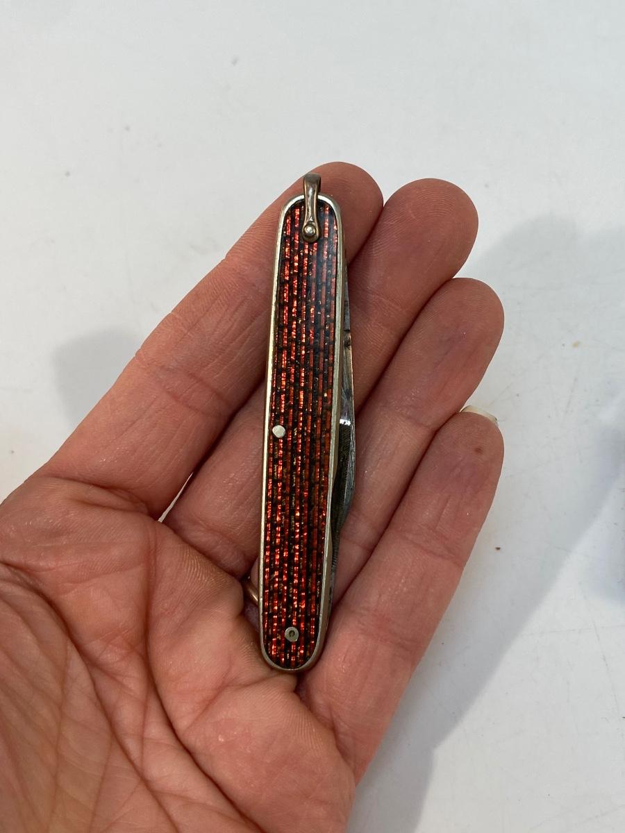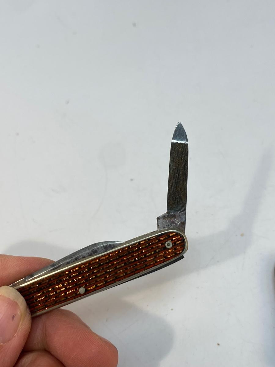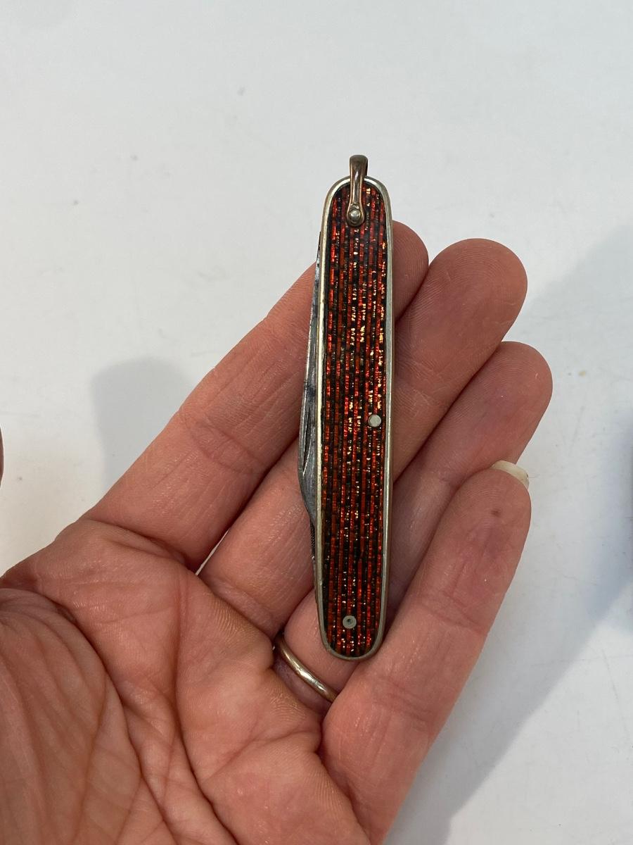 Vintage Money Clip Knife Combo and Regular Holographic Pocket Knife. Both are in vintage condition with light signs from daily use. Each has two blades but could only get a single blade on each to open. May need a little cleaning and oil to open stuck blades.