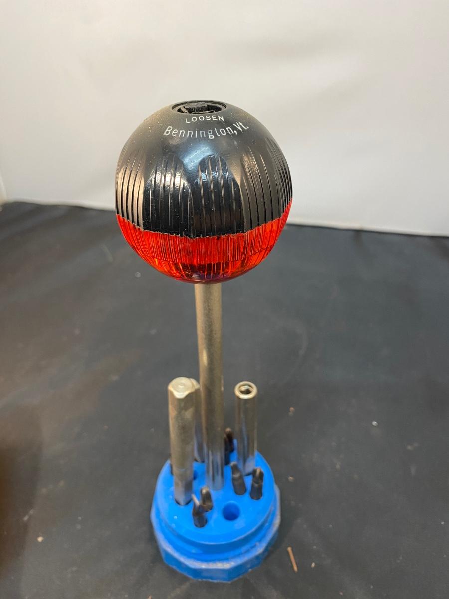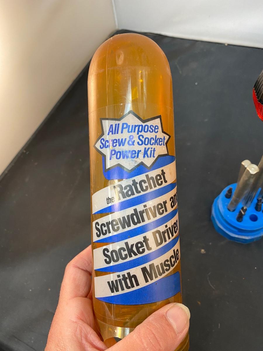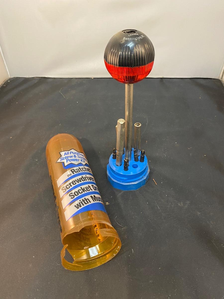 Palm Held Ratchet Screwdriver & Socket Driver. Original packaging shows age. Ratchet works, bit fits into either side of red & black handle to tighten or loosen screws and bolts. Does come with a couple bits. See photos.