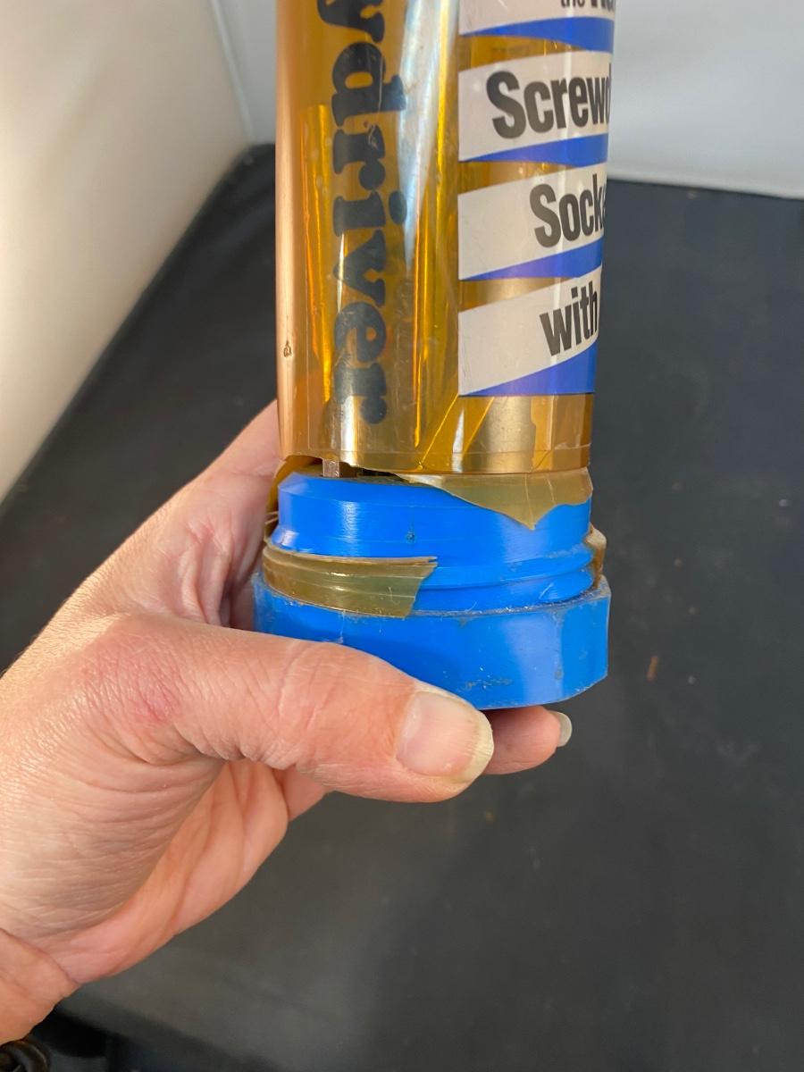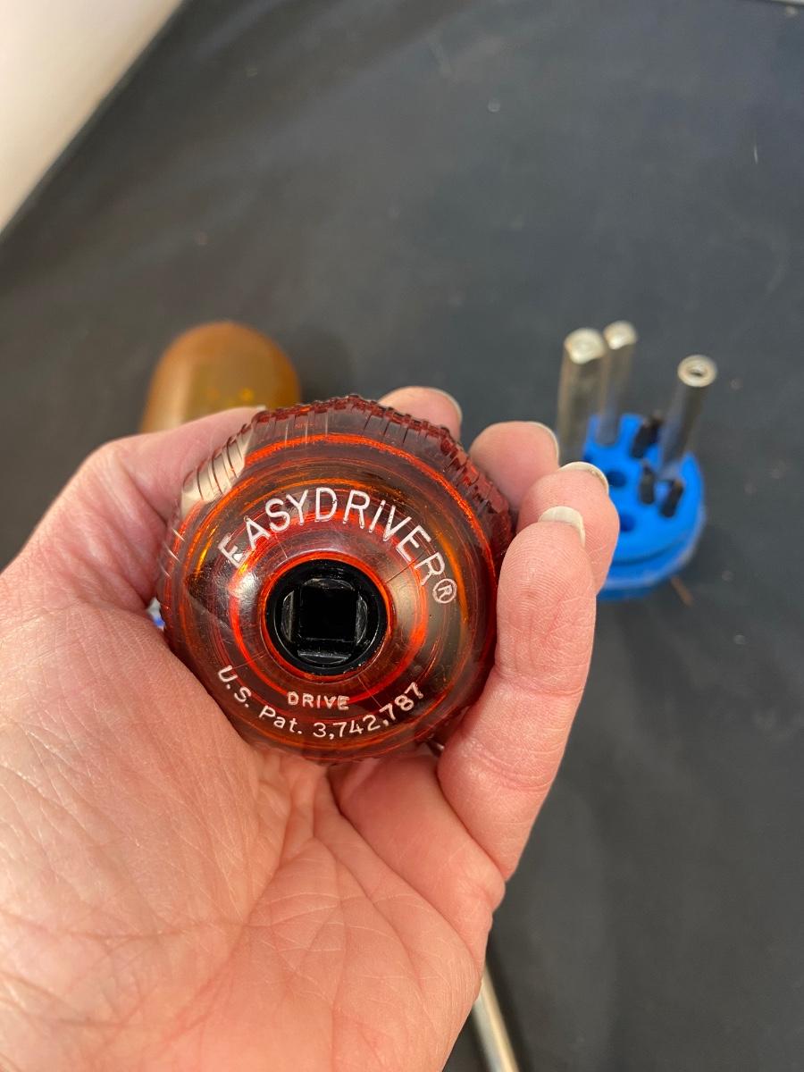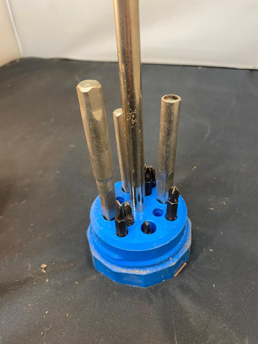Palm Held Ratchet Screwdriver & Socket Driver. Original packaging shows age. Ratchet works, bit fits into either side of red & black handle to tighten or loosen screws and bolts. Does come with a couple bits. See photos.